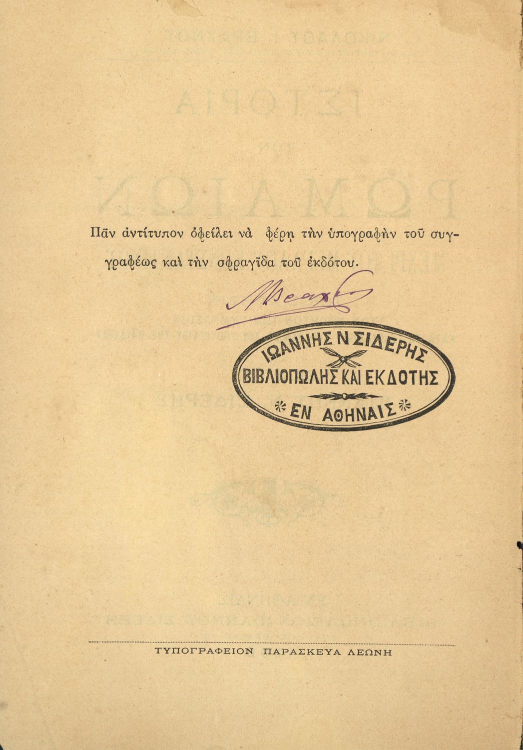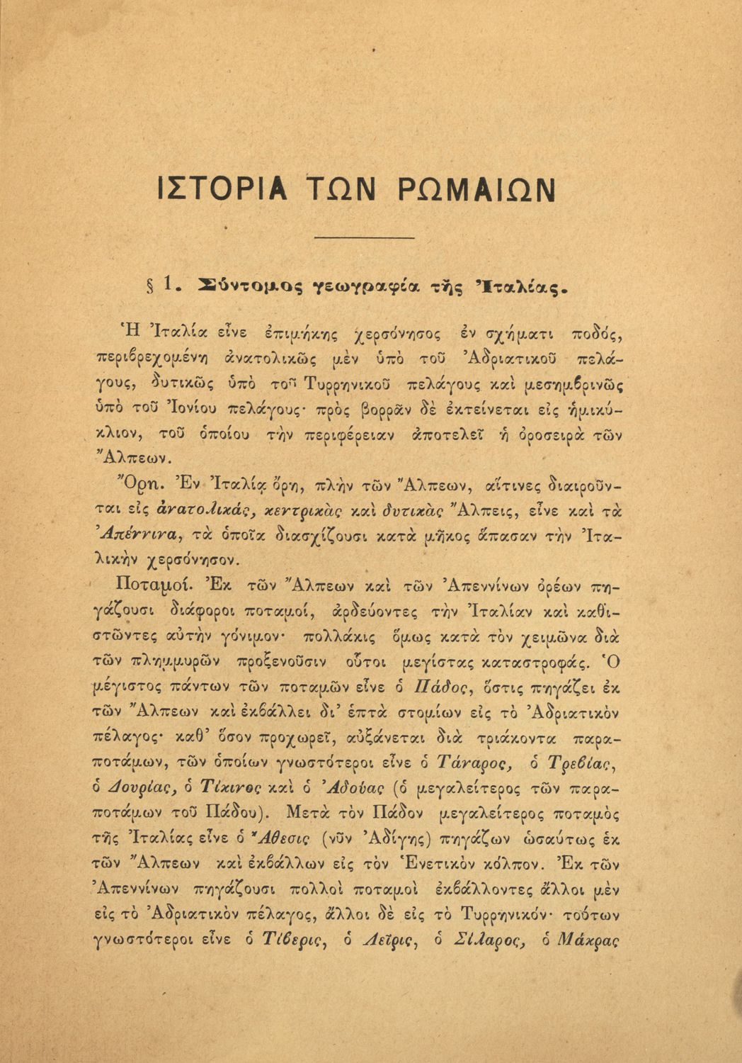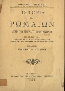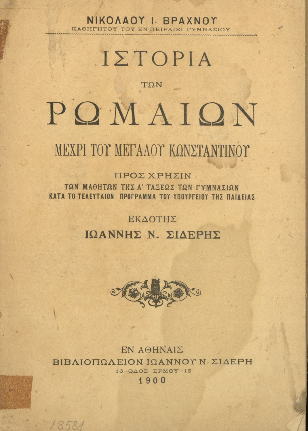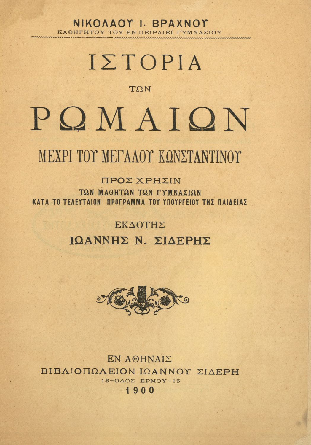 Τίτλος: Ιστορία των Ρωμαίων μέχρι του Μεγάλου Κωνσταντίνου προς χρήσιν των μαθητών της Α΄ τάξεως των Γυμνασίων