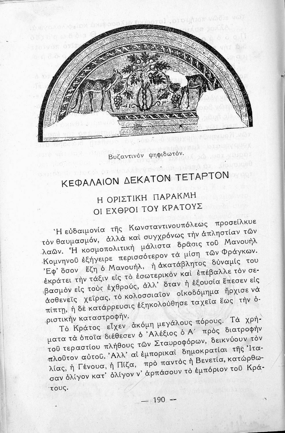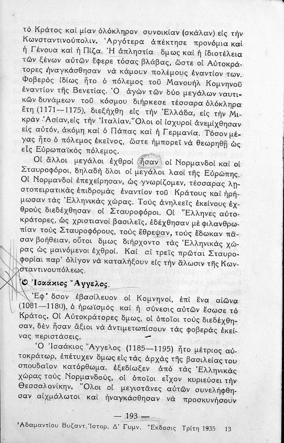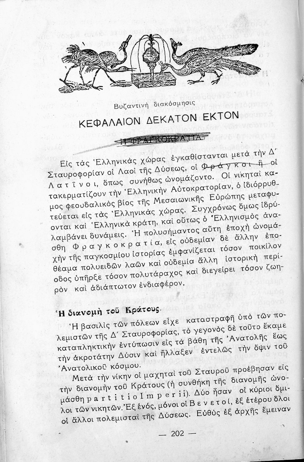 Σχολικό εγχειρίδιο Ιστορίας. Δ΄ Γυμνασίου που καλύπτει την περίοδο από την ενθρόνιση του Ιουστινιανού μέχρι και την περίοδο της Φραγκοκρατίας και την άλωση της Κωνσταντινούπολης. Σκοπό έχει να καλλιεργήσει την εθνική συνείδηση.