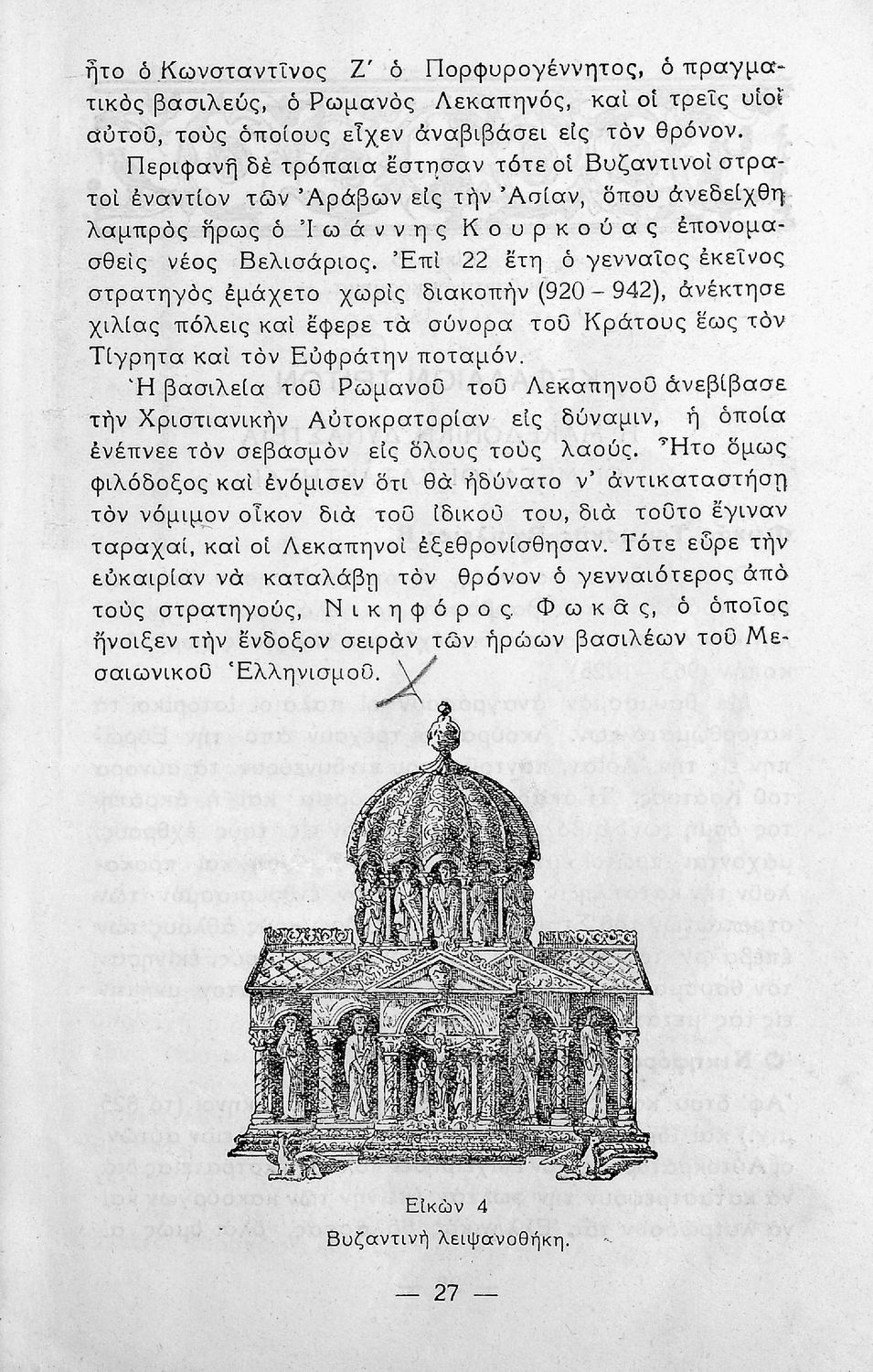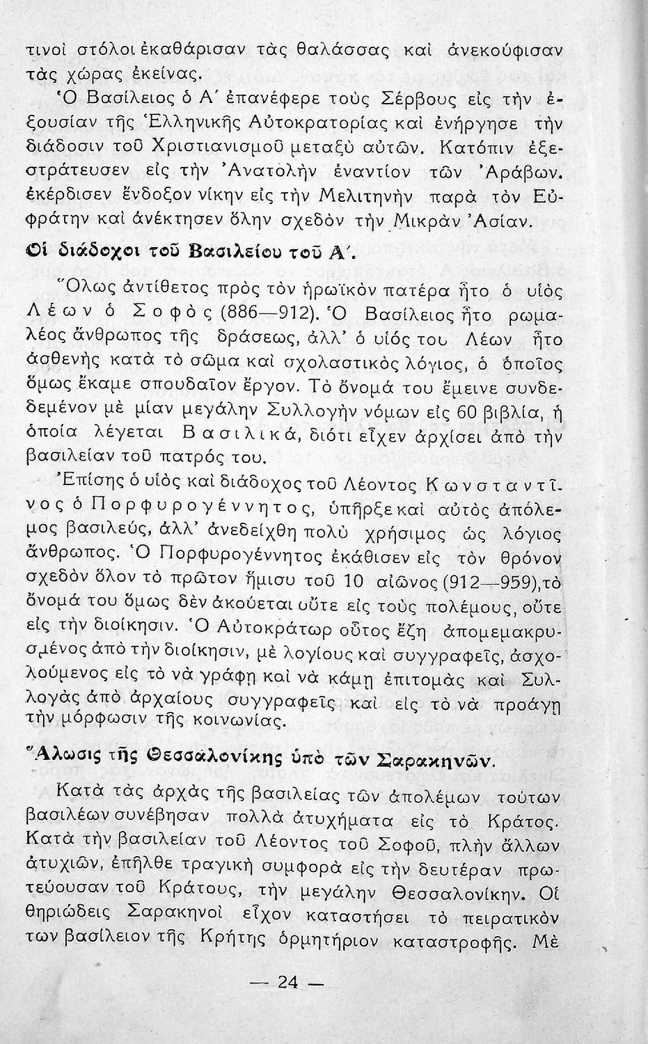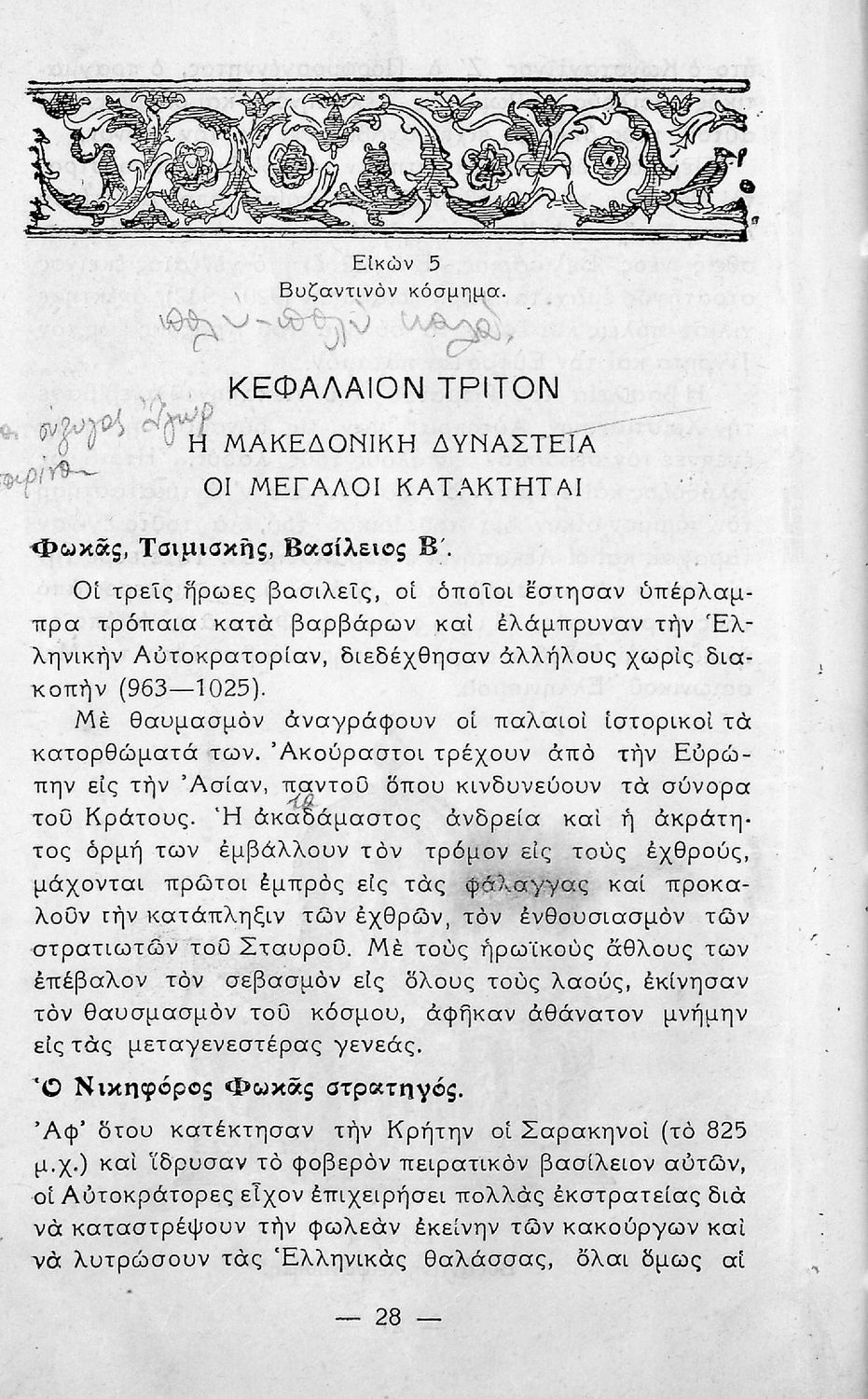 Σχολικό εγχειρίδιο Ιστορίας. Δ΄ Γυμνασίου που καλύπτει την περίοδο από την ενθρόνιση του Ιουστινιανού μέχρι και την περίοδο της Φραγκοκρατίας και την άλωση της Κωνσταντινούπολης. Σκοπό έχει να καλλιεργήσει την εθνική συνείδηση.