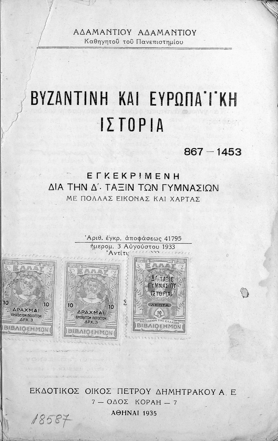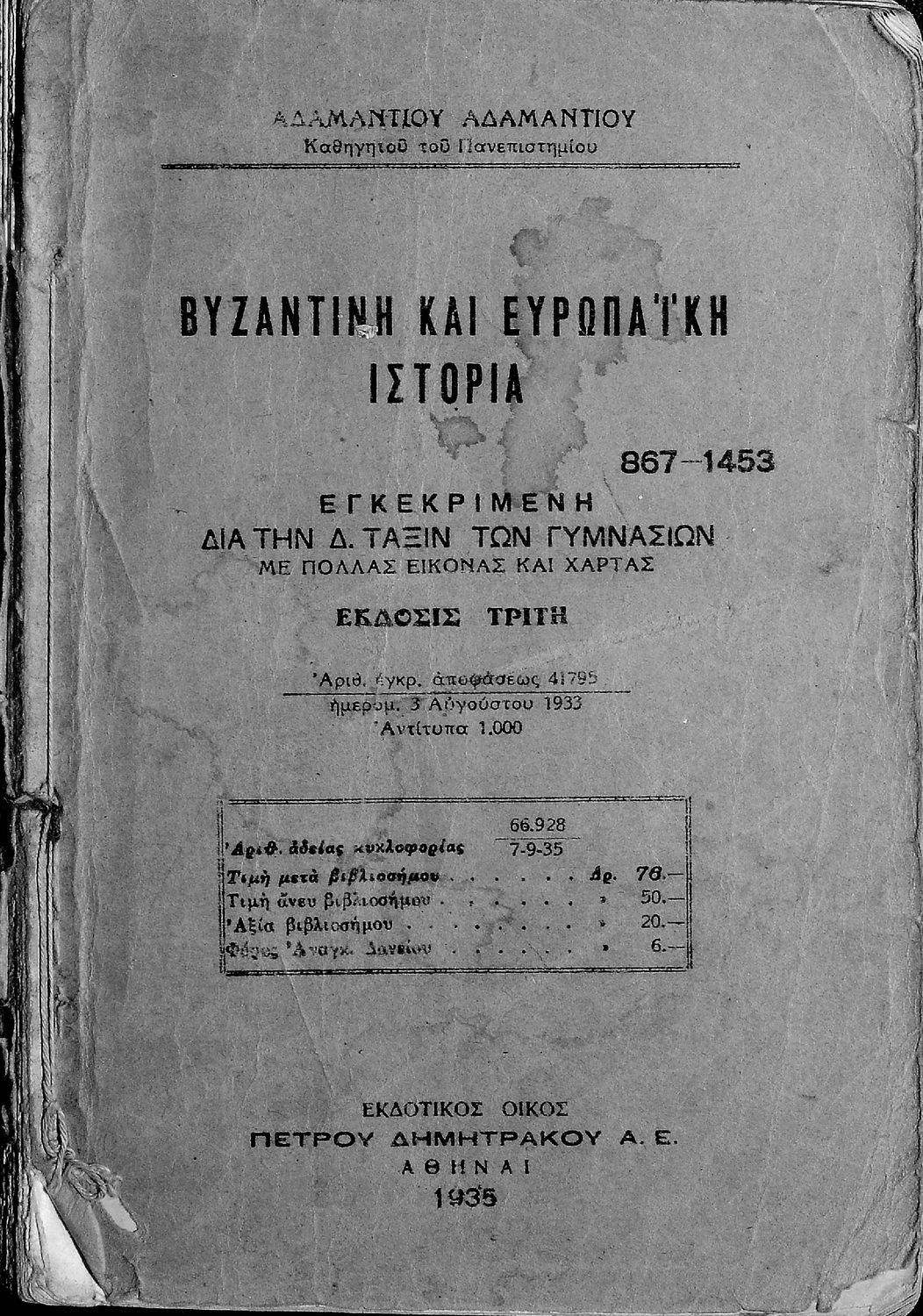 Κωδικός αναγνώρισης: 01-18587 Τίτλος: Βυζαντινή και Ευρωπαϊκή Ιστορία (867-1453). Δια την Δ΄ Τάξιν των Γυμνασίων Συγγραφέας: Αδαμάντιος. Ι Αδαμαντίου Μέγεθος και υπόστρωμα: Σχολικό εγχειρίδιο, μαλακό εξώφυλλο, 255 σελίδες. Σκίτσα και χάρτες (ασπρόμαυρα). |