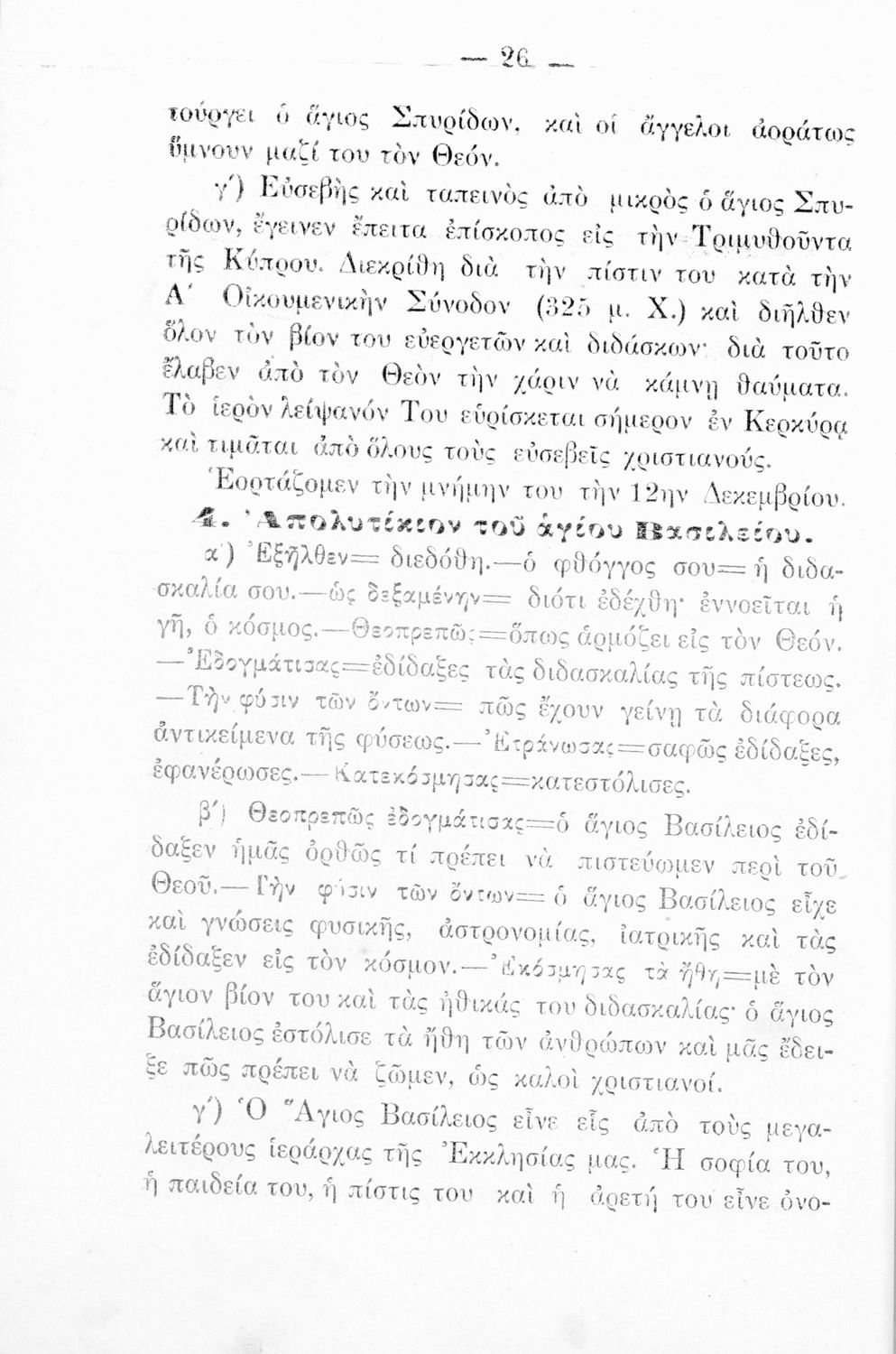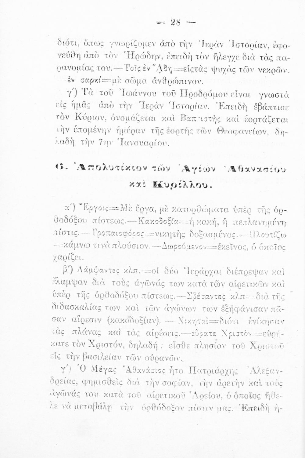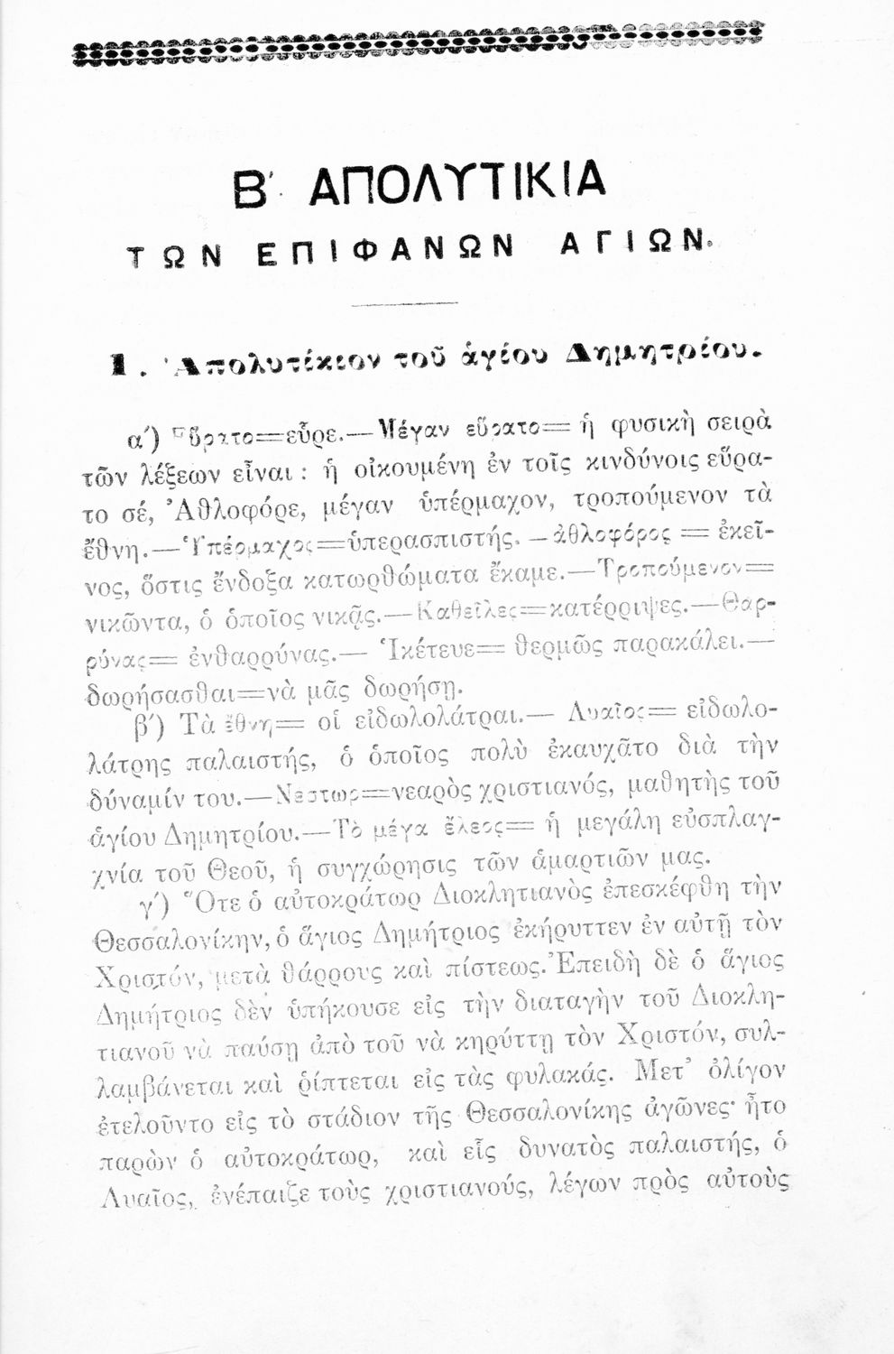 Σχολικό εγχειρίδιο Θρησκευτικών για την Α' Ελληνικού Σχολείου και Παρθεναγωγείου που περιέχει τα απολυτίκια των Θεομητορικών εορτών, των επιφανών Αγίων, αναφορές στις εορτές της Εκκλησίας και ερμηνευτικές σημειώσεις.