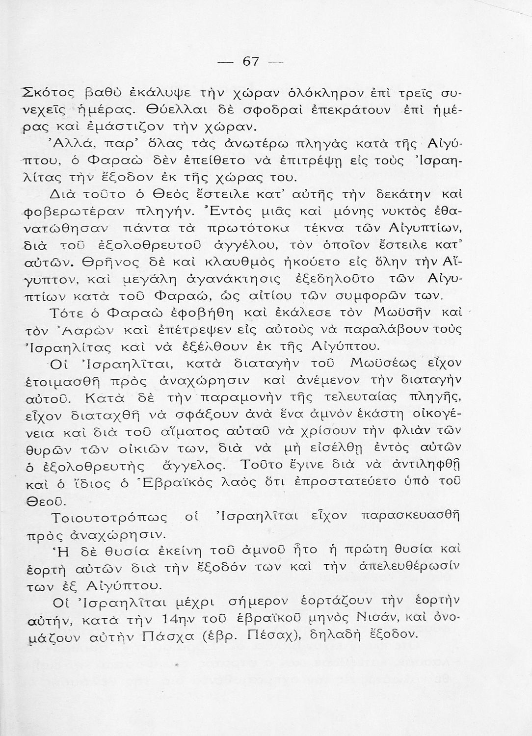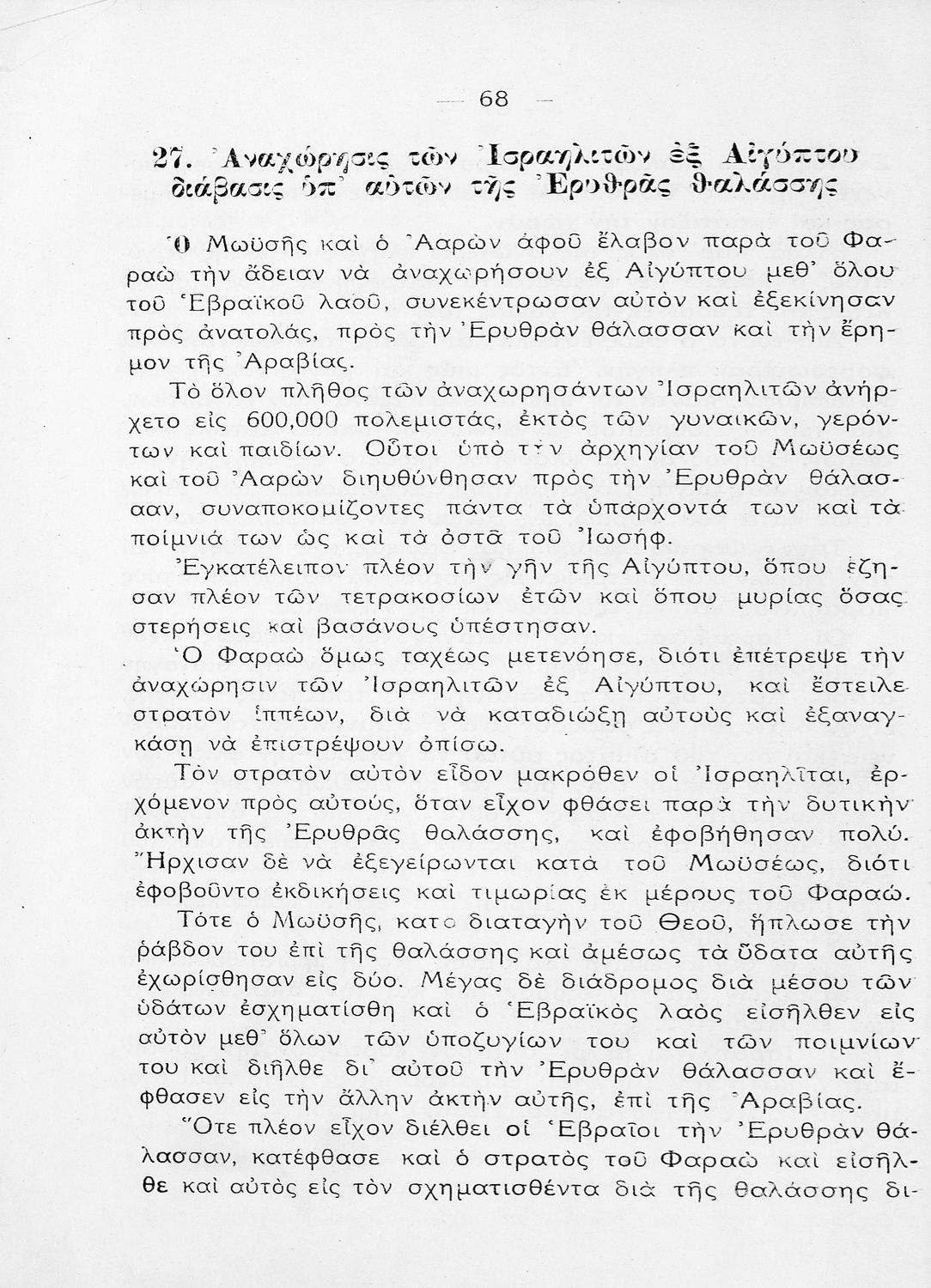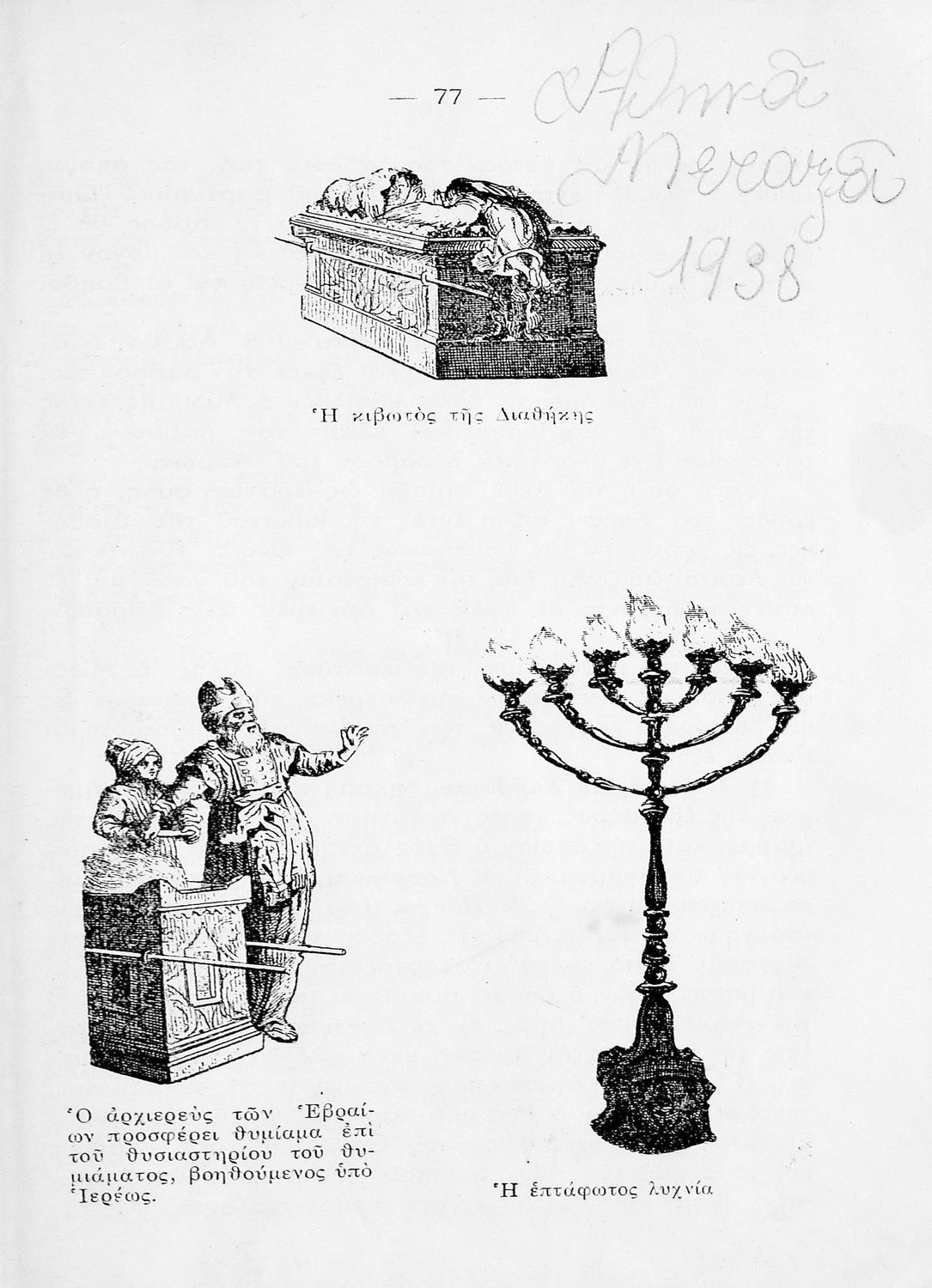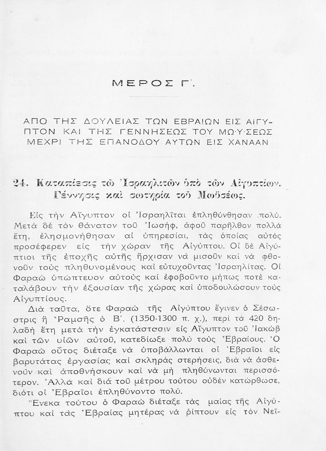 Βαθμίδα εκπαίδευσης: Δευτεροβάθμια Τάξη: Α' Γυμνασίου / Πρακτικό Λύκειο / Ανώτερα Παρθεναγωγεία Μάθημα: Θρησκευτικά Γλώσσα: Απλή καθαρεύουσα Παρουσίαση περιεχομένου: Σχολικό εγχειρίδιο Θρησκευτικών για την Α΄ Γυμνασίου και Πρακτικού Λυκείου που συνιστά μία εξιστόρηση της Παλαιάς Διαθήκης από τη δημιουργία του κόσμου ως την υποταγή των Εβραίων στους Ρωμαίους. |