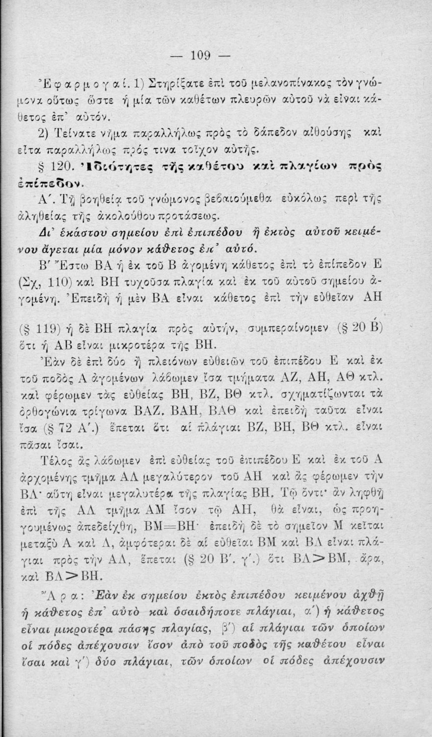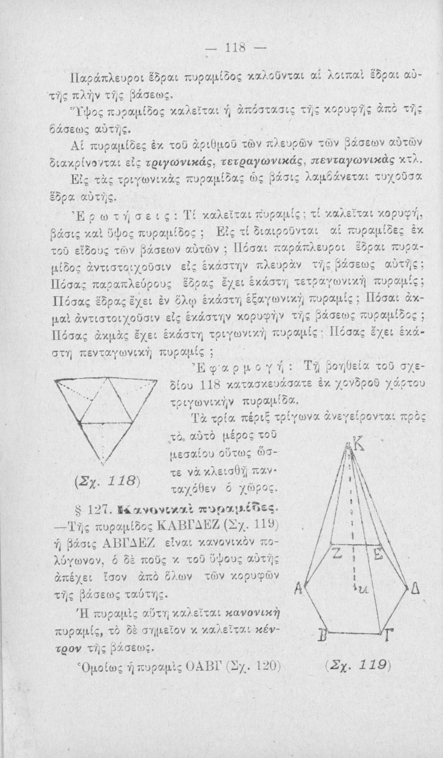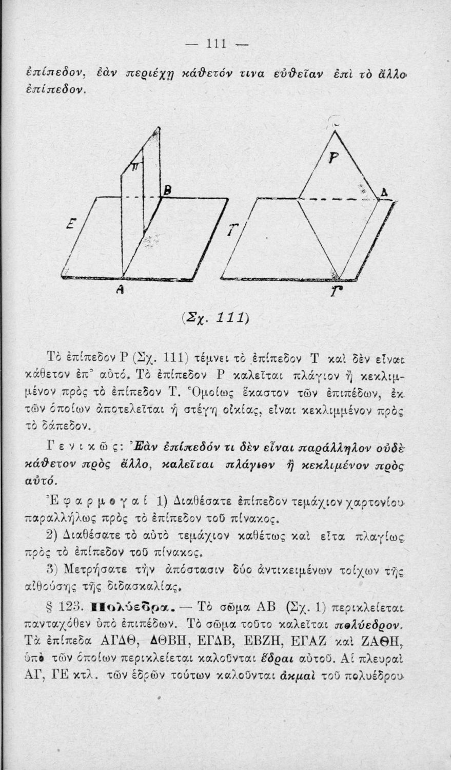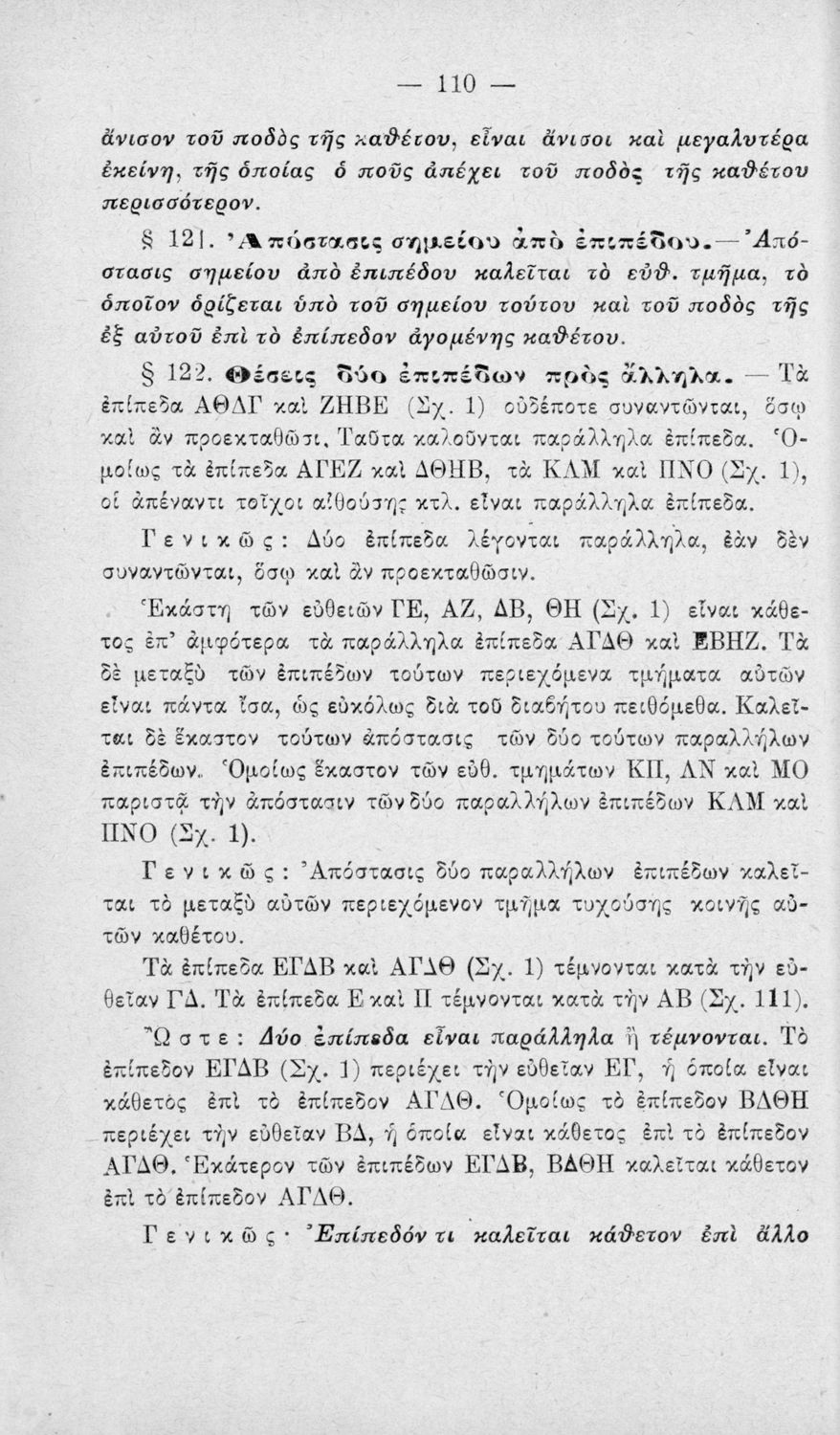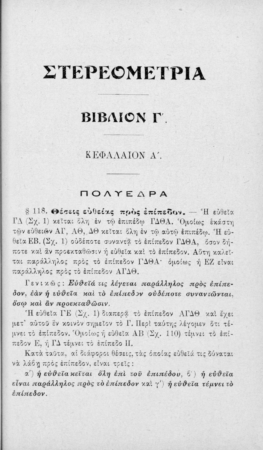 Σχολικό εγχειρίδιο Γεωμετρίας για τα Ελληνικά και Αστικά Σχολεία χωρισμένο σε Επιπεδομετρία και Στερεομετρία. Περιλαμβάνει προβλήματα και στοιχεία χωρομετρίας.