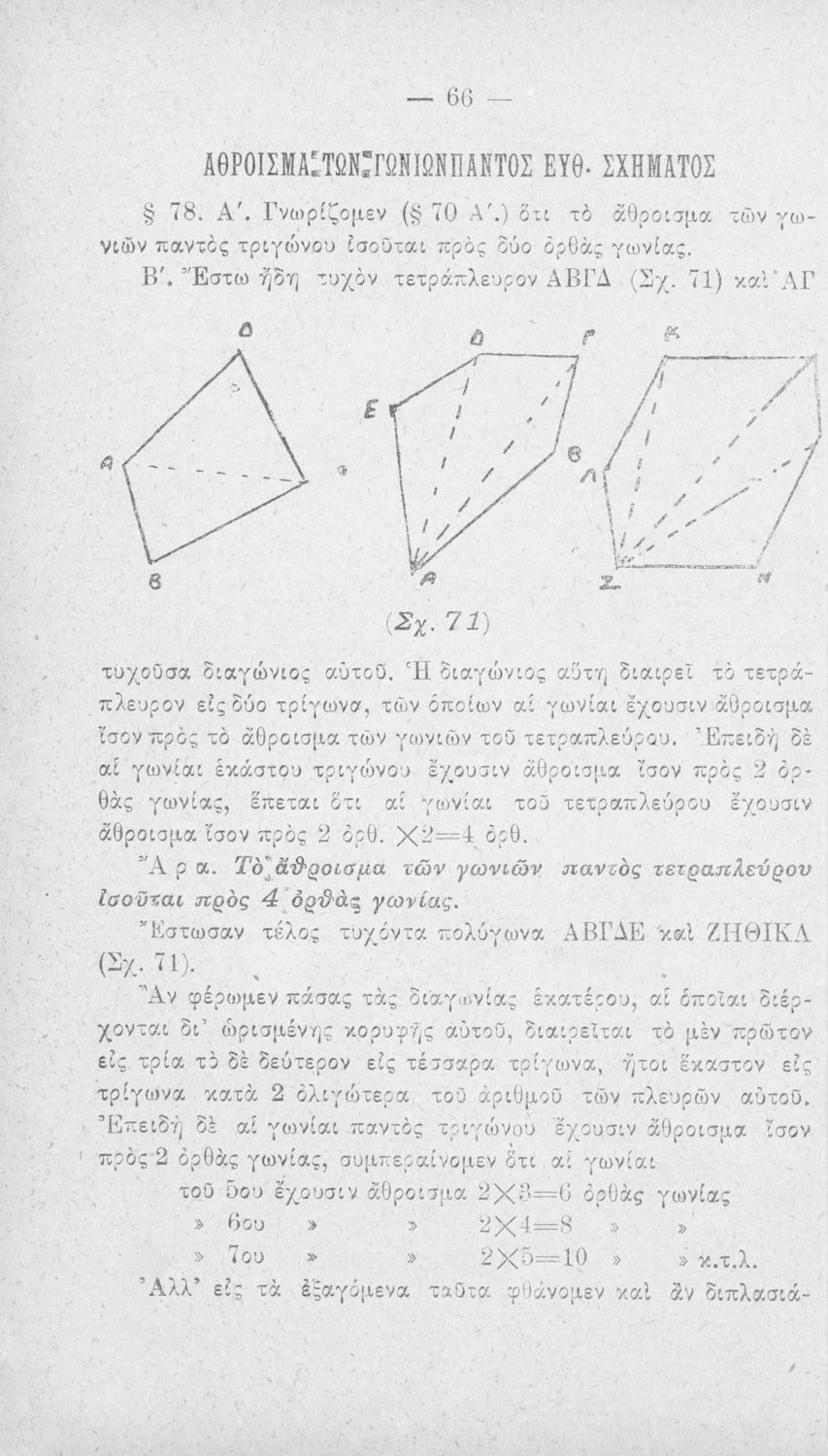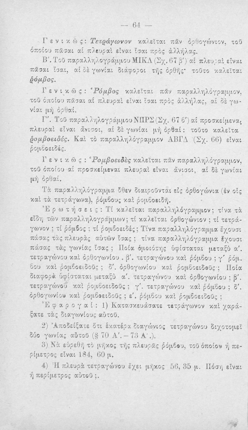 Σχολικό εγχειρίδιο Γεωμετρίας για τα Ελληνικά και Αστικά Σχολεία χωρισμένο σε Επιπεδομετρία και Στερεομετρία. Περιλαμβάνει προβλήματα και στοιχεία χωρομετρίας.