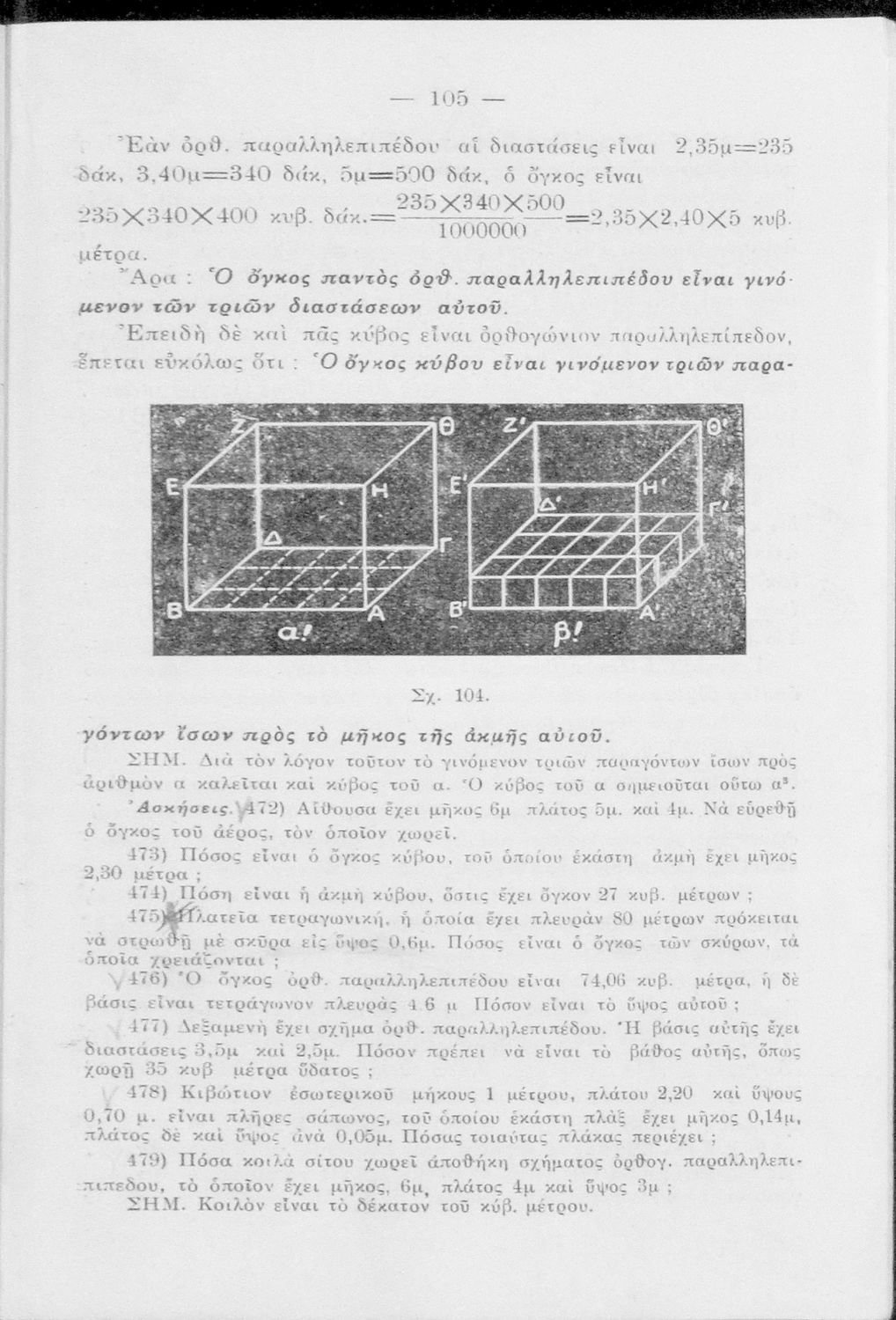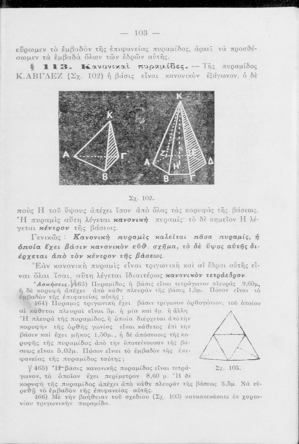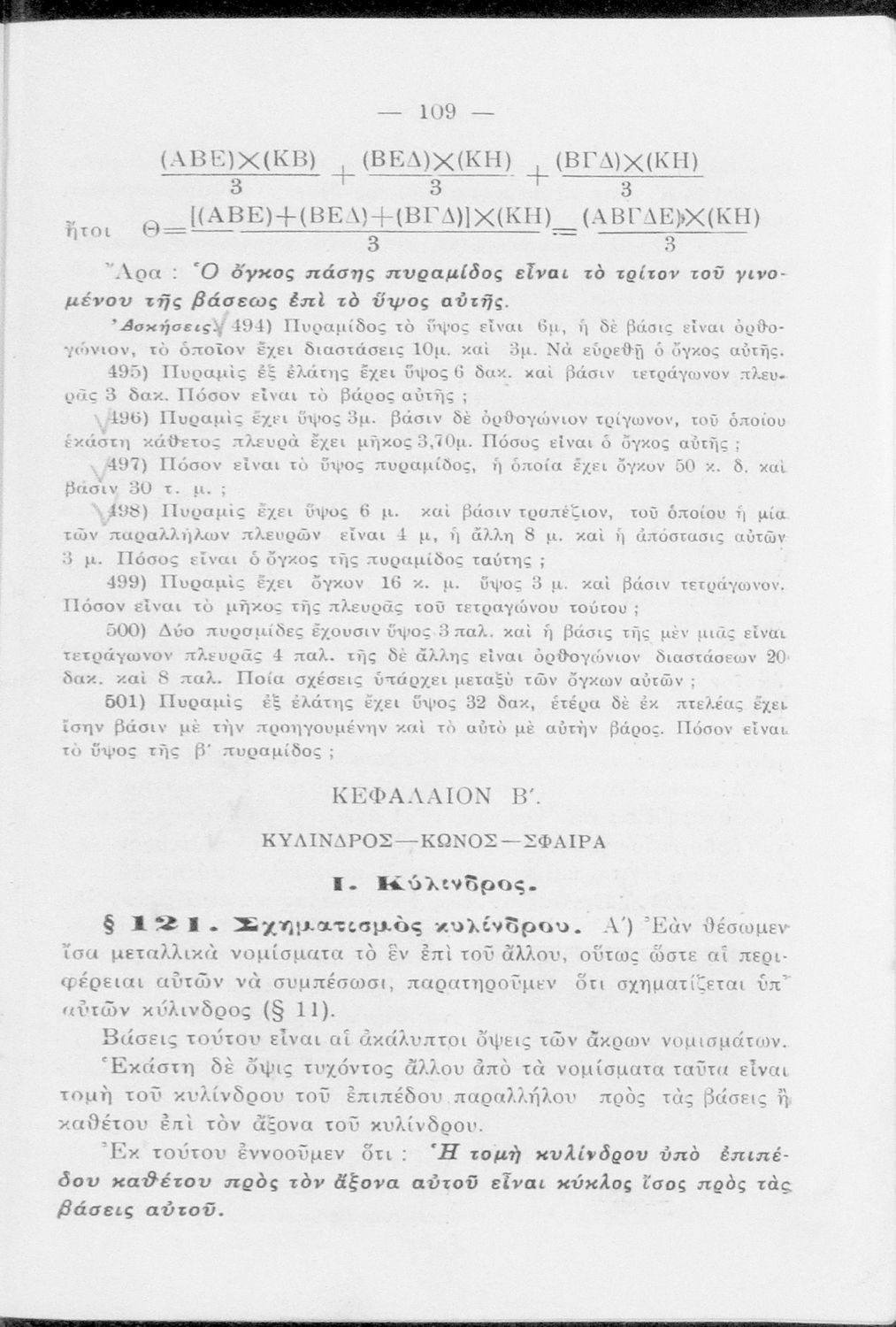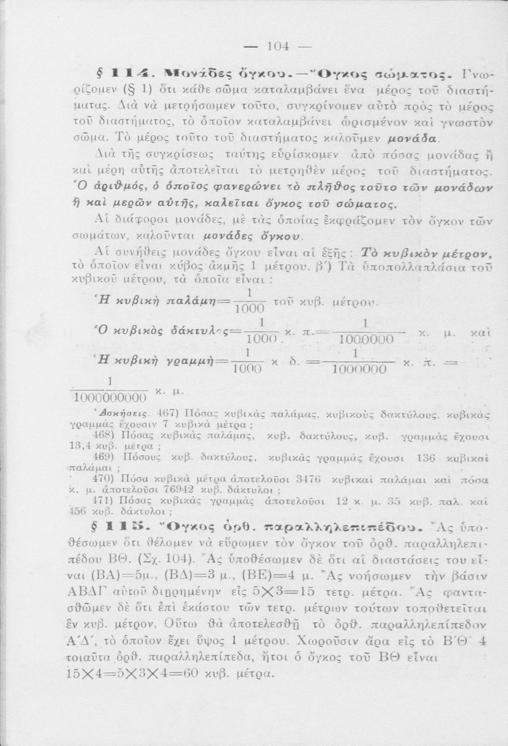 Σχολικό εγχειρίδιο Γεωμετρίας για τα Ημιγυμνάσια και τις κατώτερες τάξεις των Γυμνασίων που περιλαμβάνει ορισμούς και ασκήσεις και είναι χωρισμένο σε Επιπεδομετρία και Στερεομετρία.