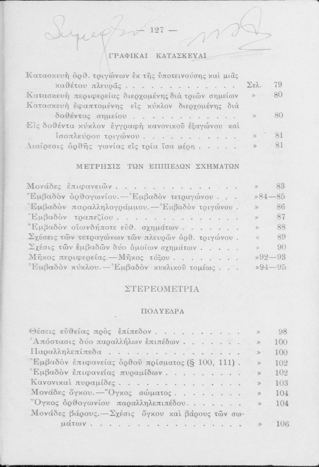 Σχολικό εγχειρίδιο Γεωμετρίας για τα Ημιγυμνάσια και τις κατώτερες τάξεις των Γυμνασίων που περιλαμβάνει ορισμούς και ασκήσεις και είναι χωρισμένο σε Επιπεδομετρία και Στερεομετρία.