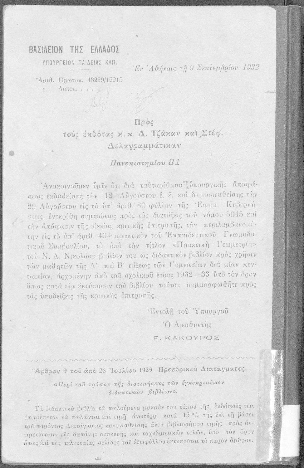 Υπουργική απόφαση / Σύμβαση: 44229/15215/9-9-1932
