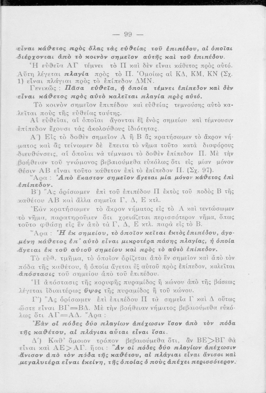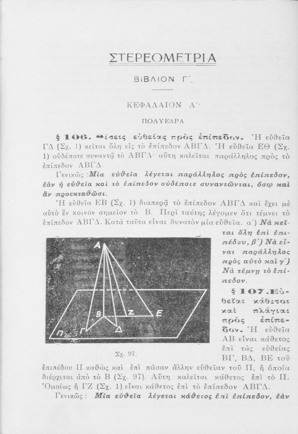 Σχολικό εγχειρίδιο Γεωμετρίας για τα Ημιγυμνάσια και τις κατώτερες τάξεις των Γυμνασίων που περιλαμβάνει ορισμούς και ασκήσεις και είναι χωρισμένο σε Επιπεδομετρία και Στερεομετρία.