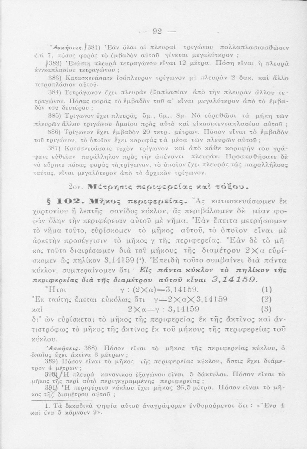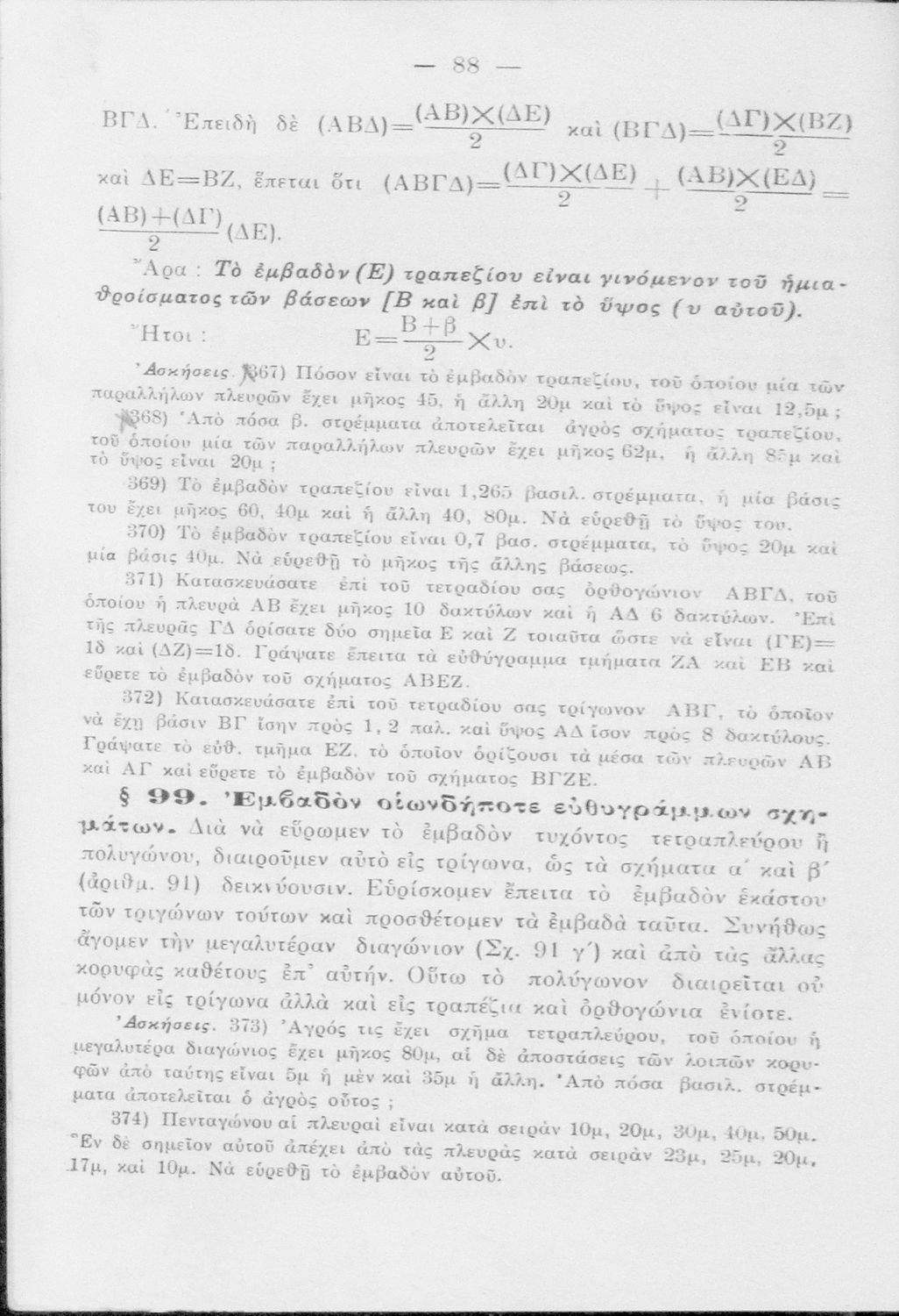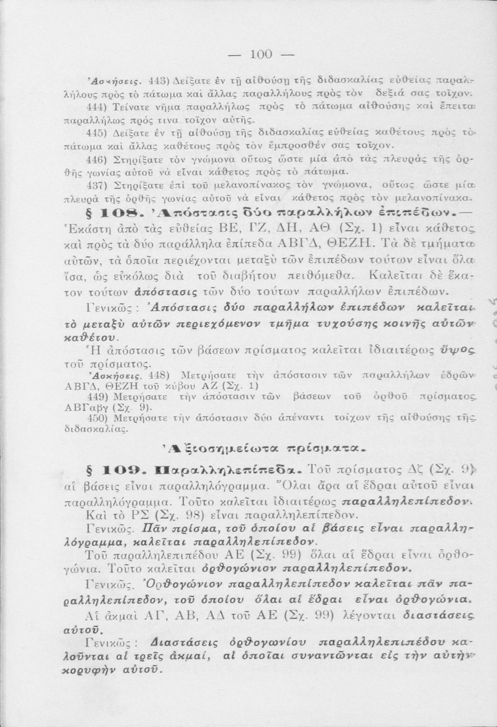 Σχολικό εγχειρίδιο Γεωμετρίας για τα Ελληνικά και Αστικά Σχολεία που περιέχει θεωρία και ασκήσεις και είναι χωρισμένο σε Επιπεδομετρία και Στερεομετρία.