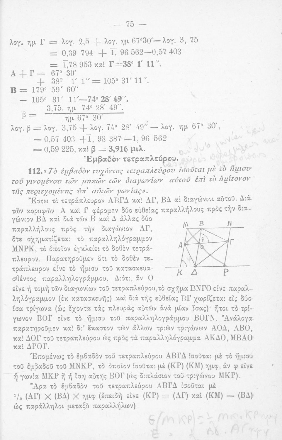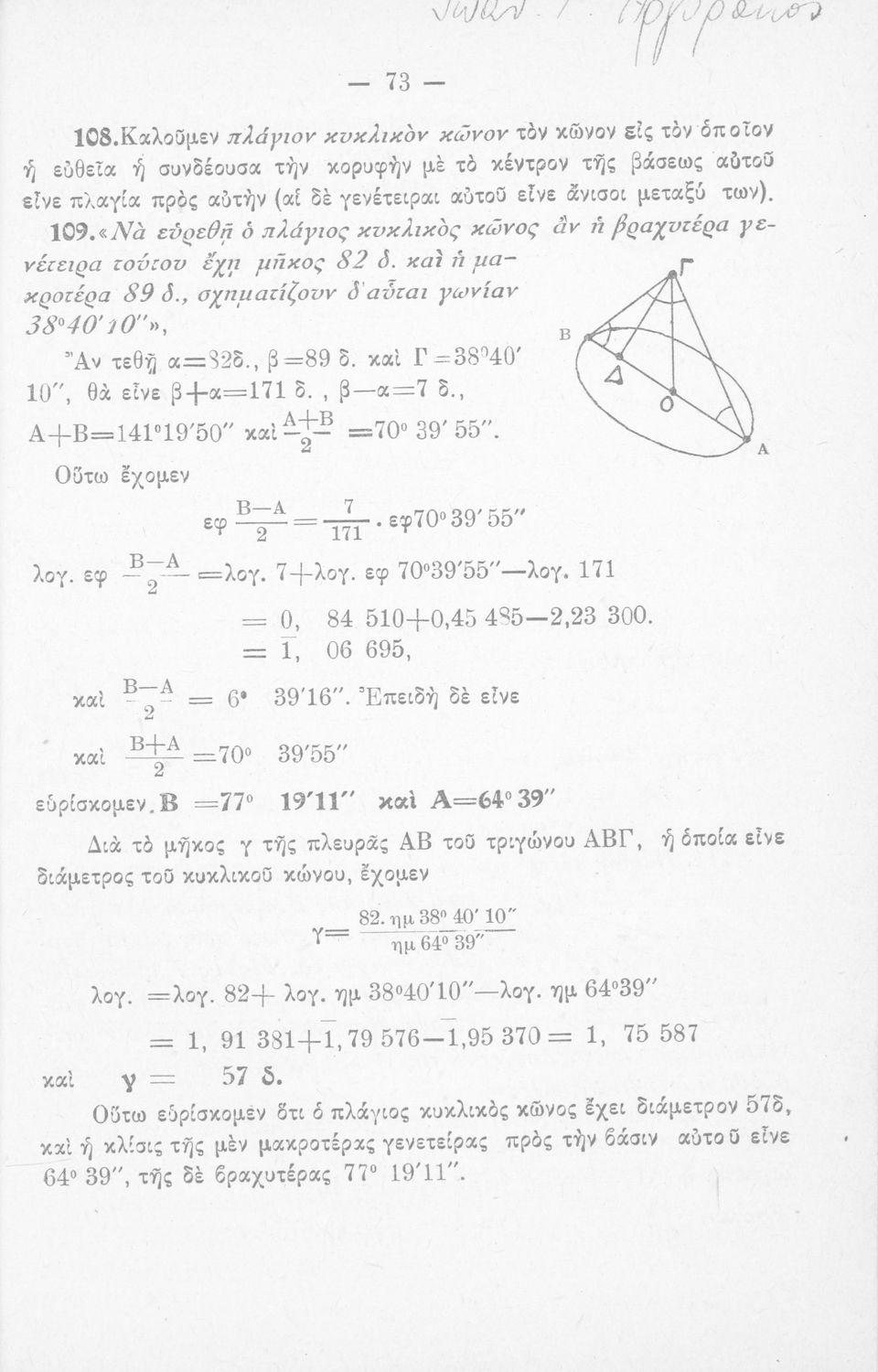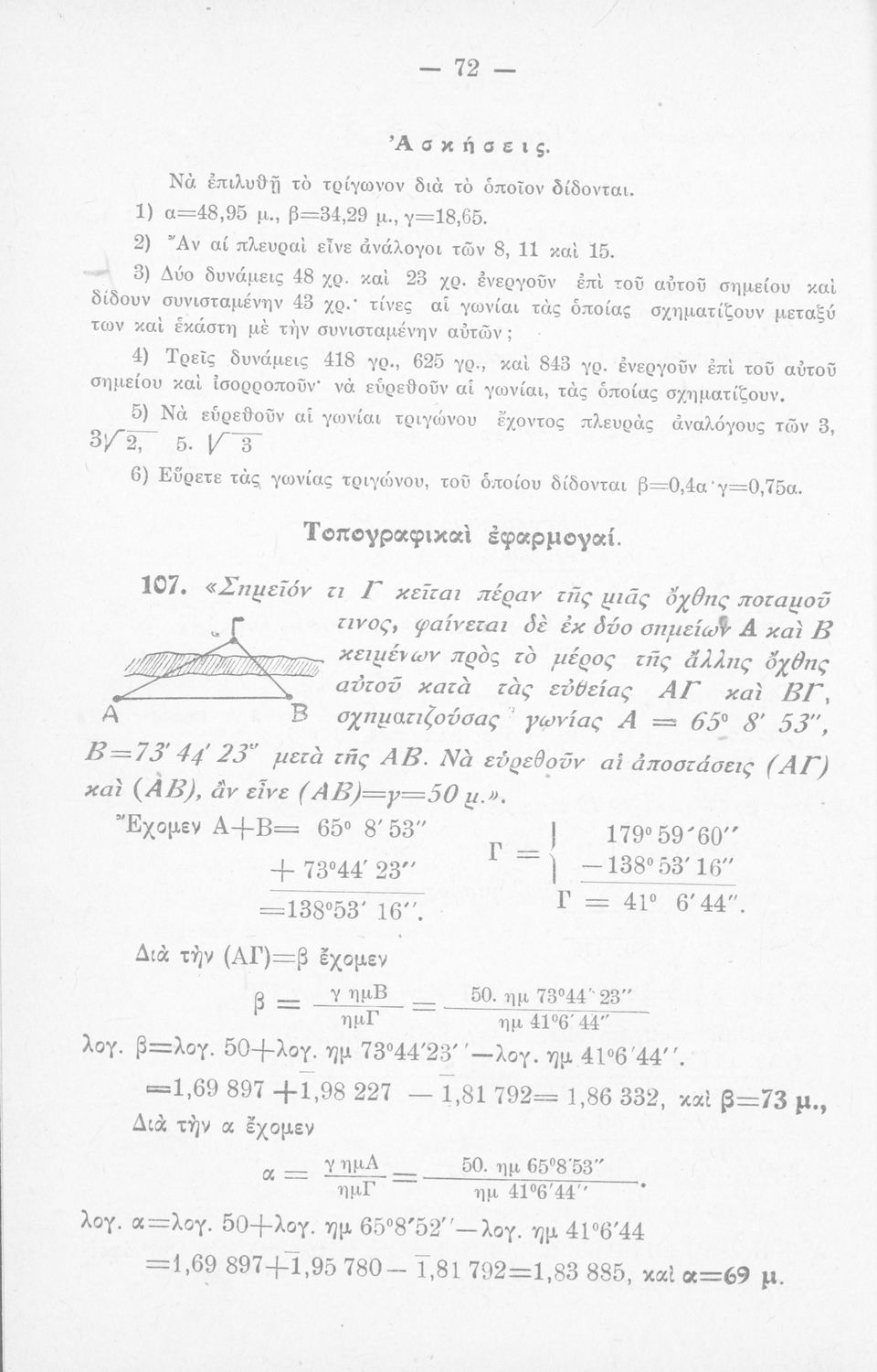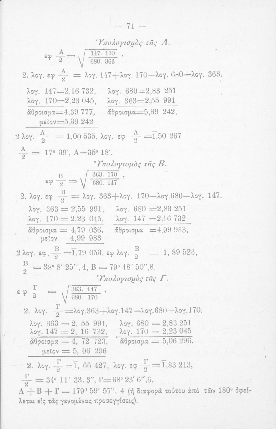 Σχολικό εγχειρίδιο Τριγωνομετρίας Γυμνασίου που εστιάζει στους τριγωνομετρικούς αριθμούς και τους λογαριθμικούς πίνακες. Ο συγγραφέας ήταν καθηγητής στο Πανεπιστήμιο Αθηνών.