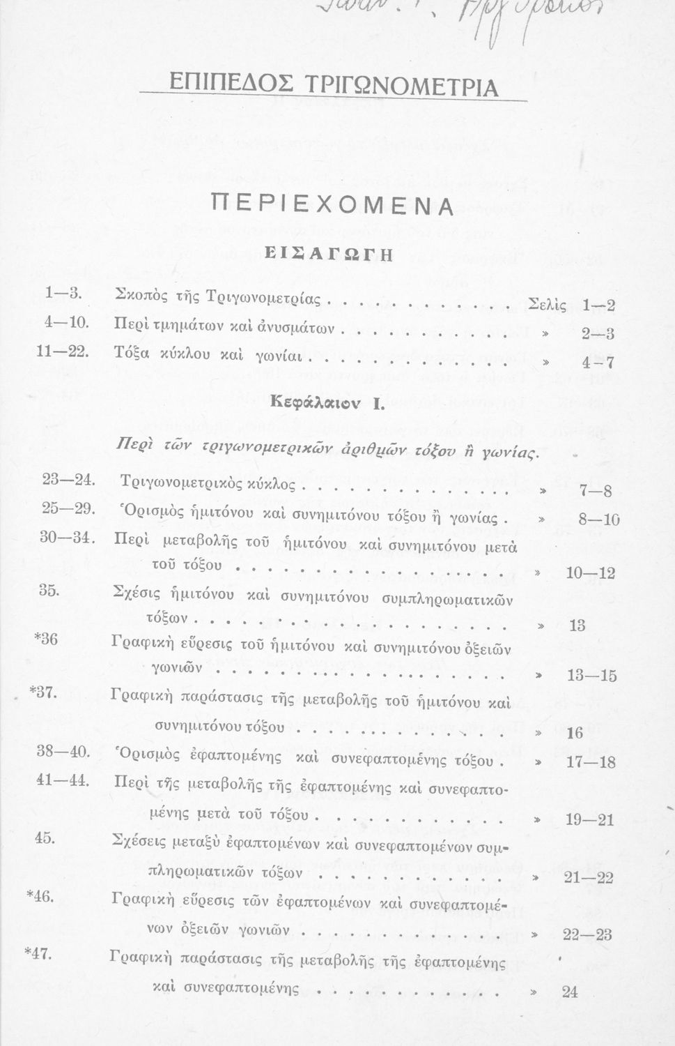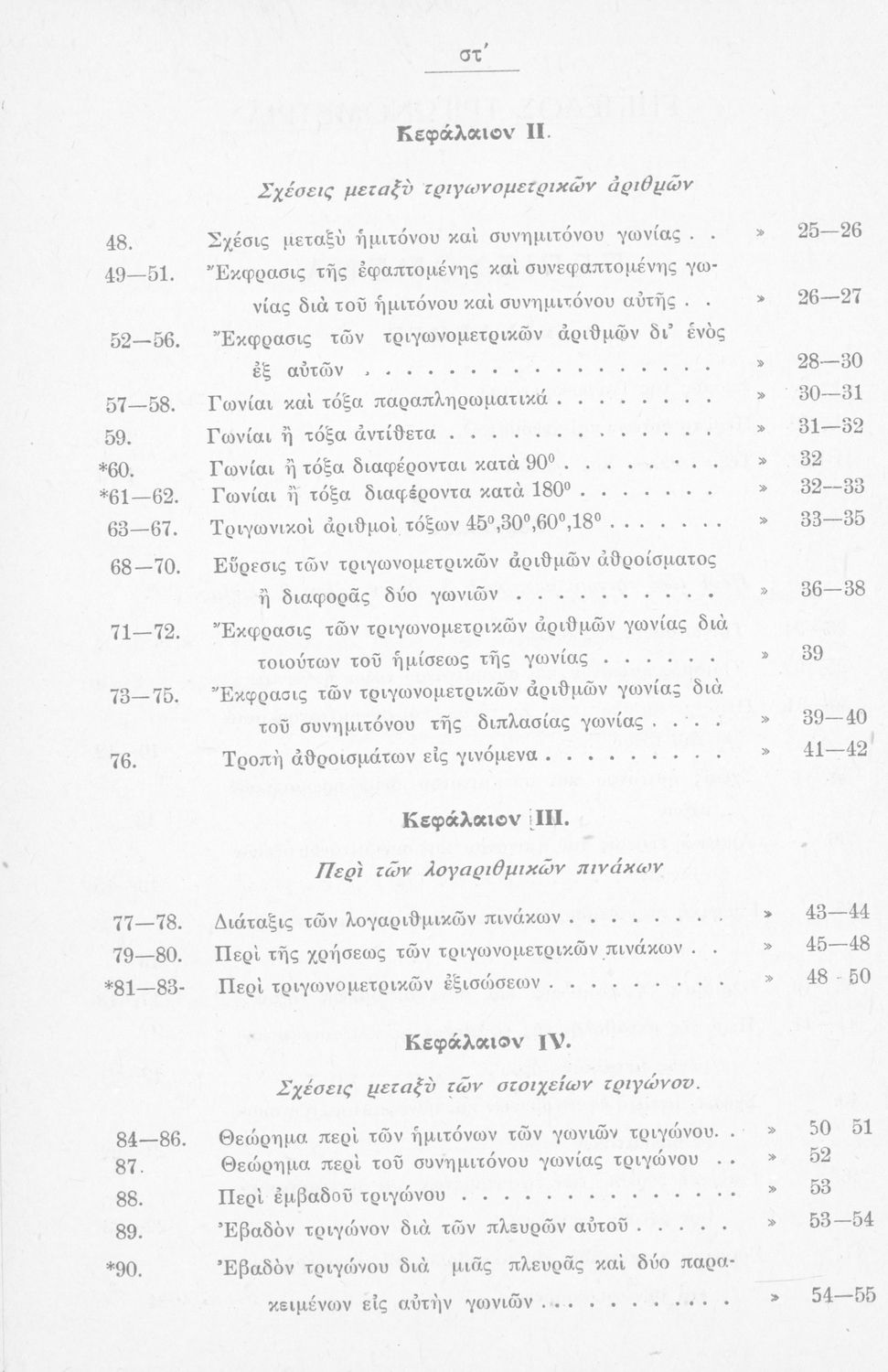 Σχολικό εγχειρίδιο Τριγωνομετρίας Γυμνασίου που εστιάζει στους τριγωνομετρικούς αριθμούς και τους λογαριθμικούς πίνακες. Ο συγγραφέας ήταν καθηγητής στο Πανεπιστήμιο Αθηνών.