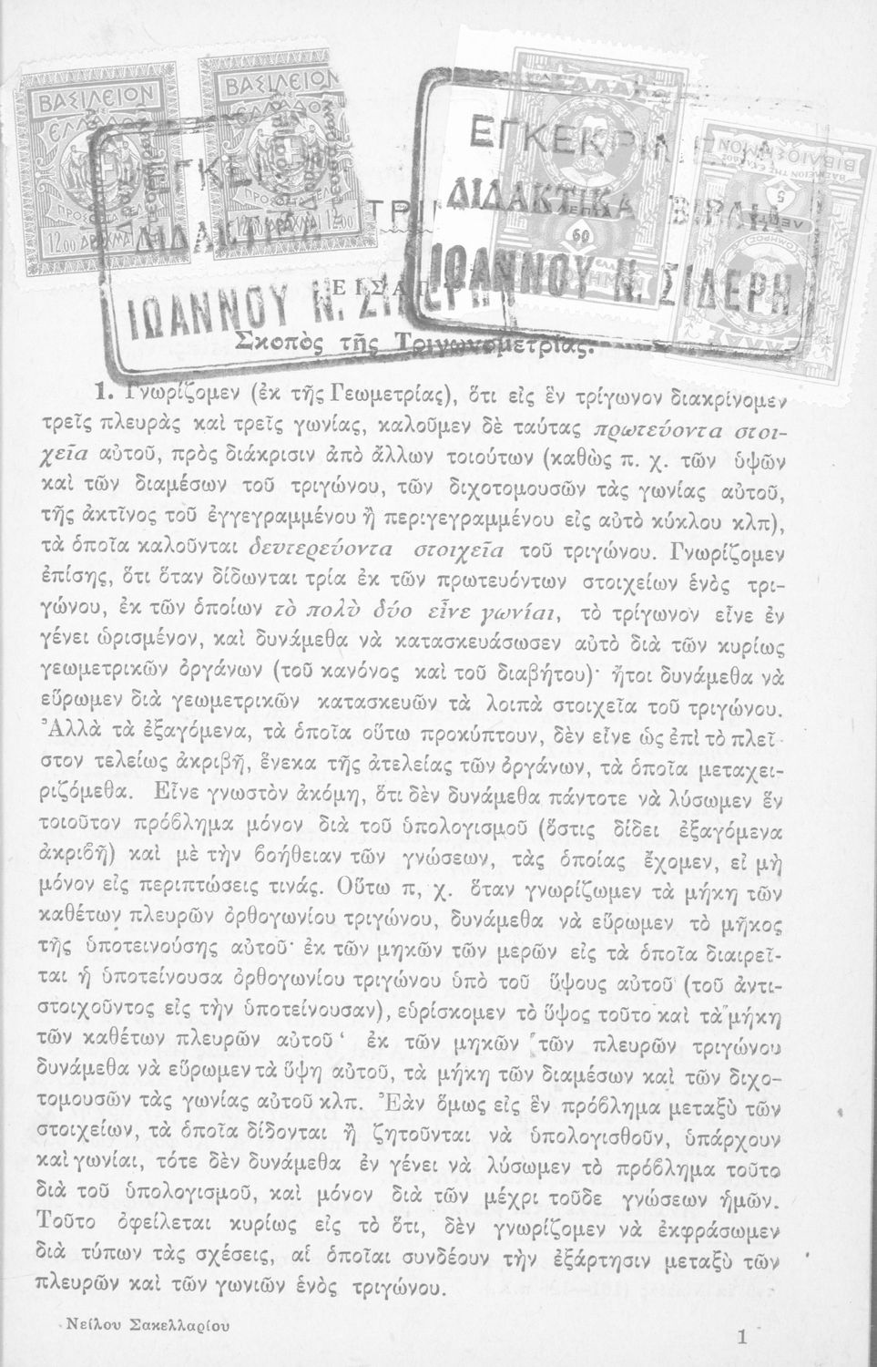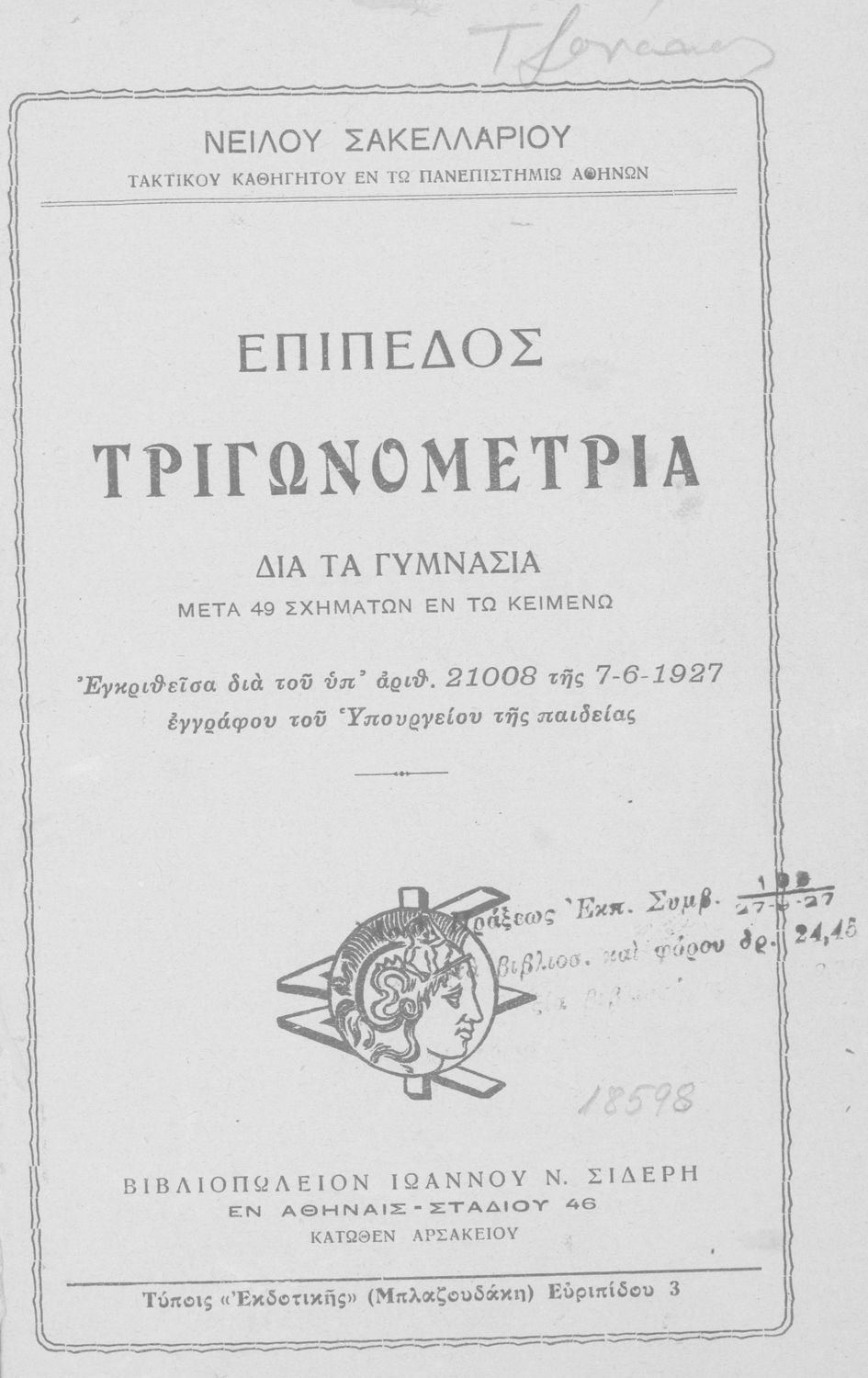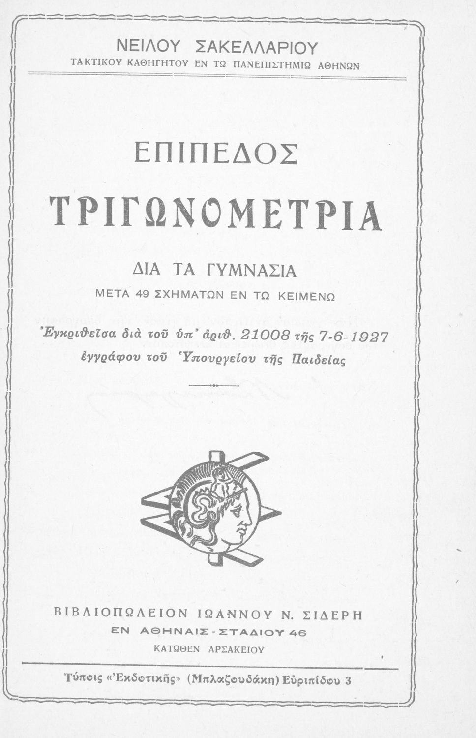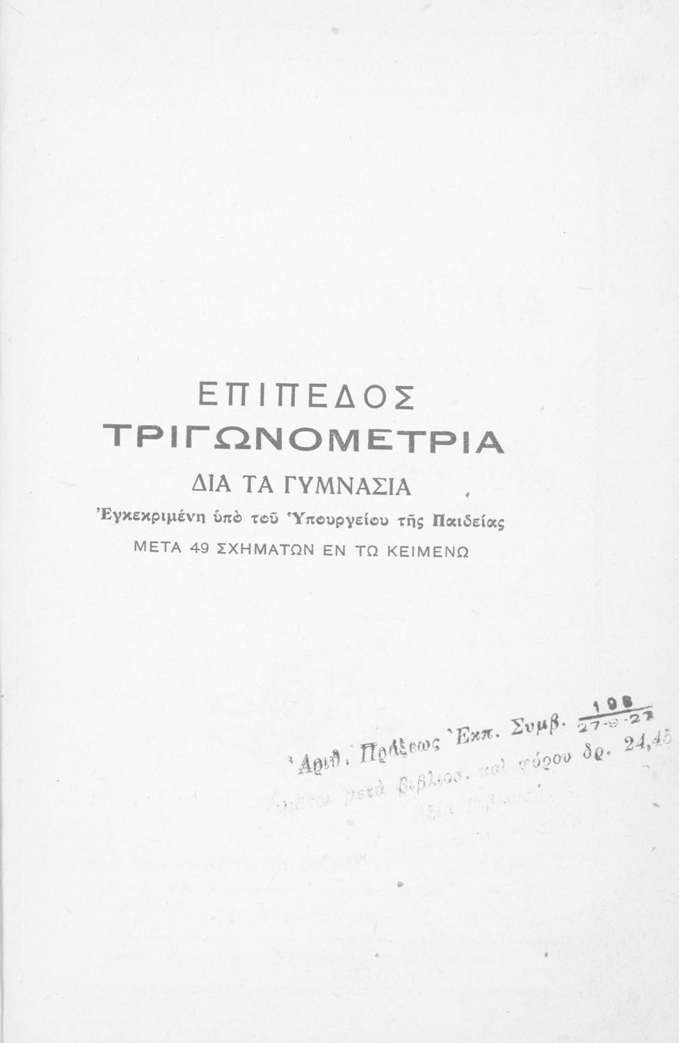 Τίτλος: Επίπεδος τριγωνομετρία δια τα Γυμνάσια μετά 49 σχημάτων εν τω κειμένω