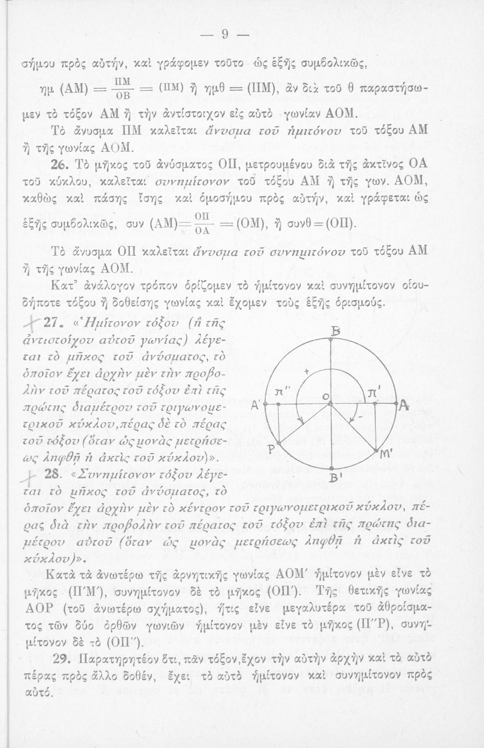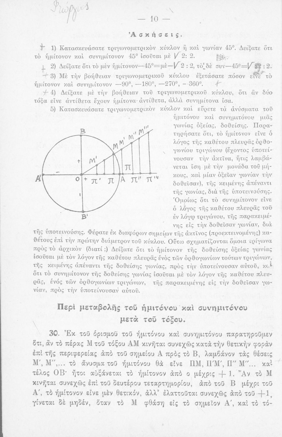 Παρουσίαση περιεχομένου: Σχολικό εγχειρίδιο Τριγωνομετρίας Γυμνασίου που εστιάζει στους τριγωνομετρικούς αριθμούς και τους λογαριθμικούς πίνακες. Ο συγγραφέας ήταν καθηγητής στο Πανεπιστήμιο Αθηνών.