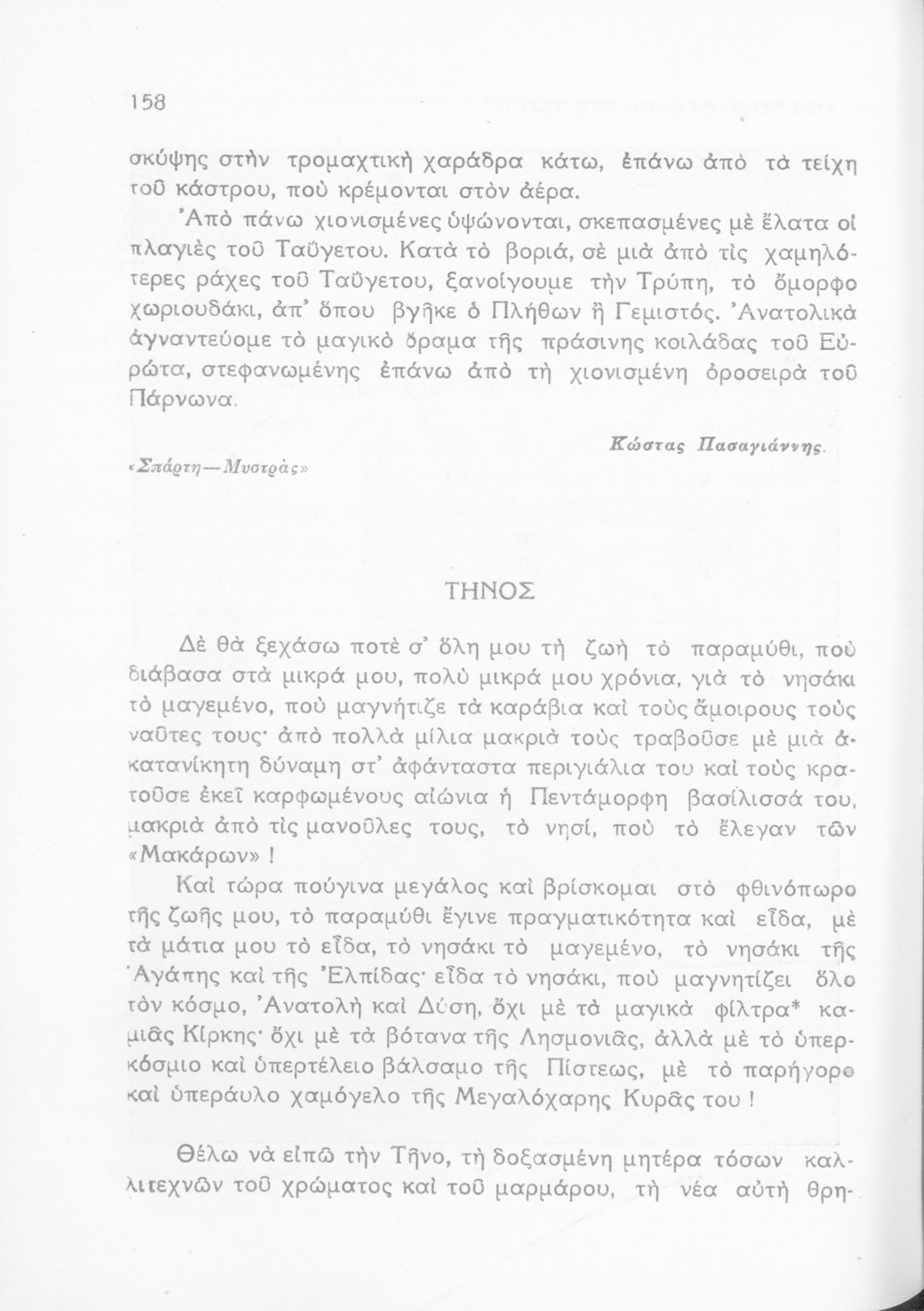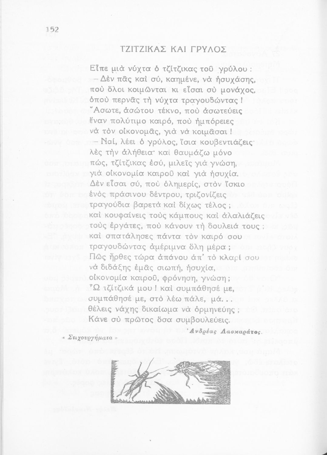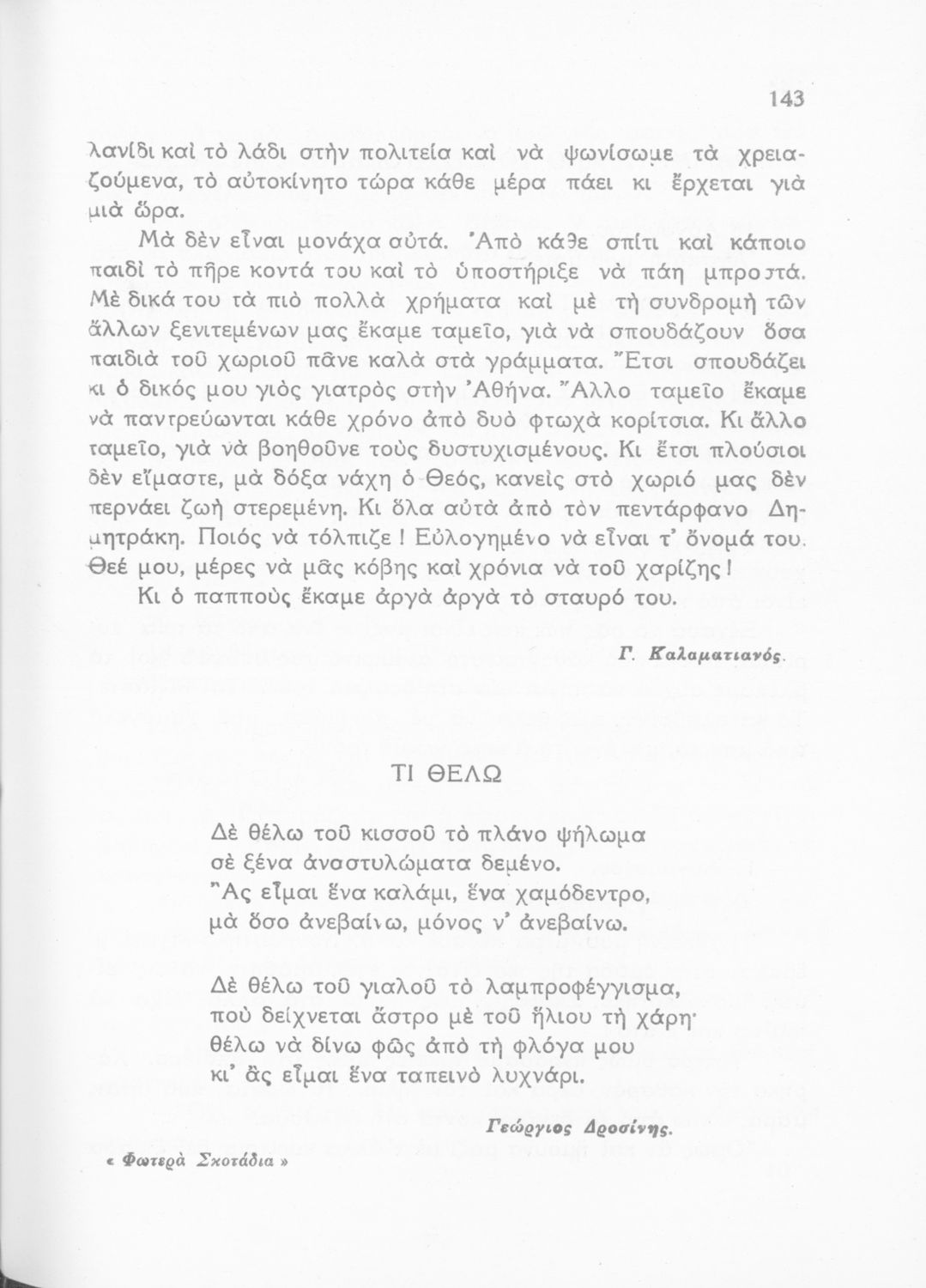 Σχολικό εγχειρίδιο Νέων Ελληνικών Δ΄ Γυμνασίου και Β΄ Αστικού Σχολείου που περιέχει πεζά και ποιήματα Ελλήνων συγγραφέων εμπνευσμένα από τη θρησκευτική και κοινωνική ζωή, την ελληνική μυθολογία, την αρχαία και σύγχρονη ελληνική ιστορία, και την ελληνική φύση. Περιέχει παράρτημα με μεταφράσεις κειμένων αρχαίων ελλήνων συγγραφέων και αποσπάσματα από τη μεσαιωνική γραμματεία, βιογραφίες των συγγραφέων και λεξιλόγιο.