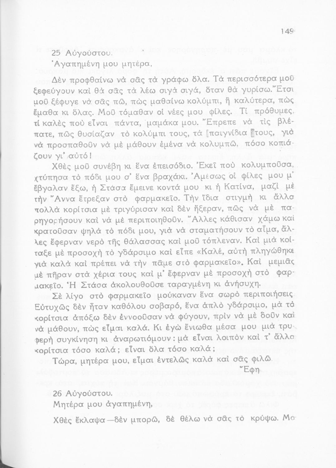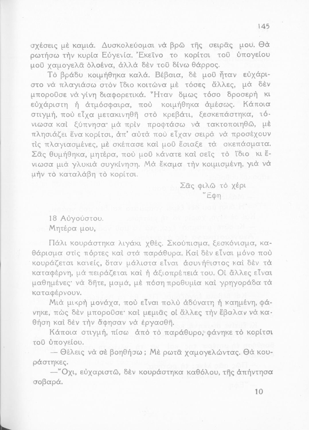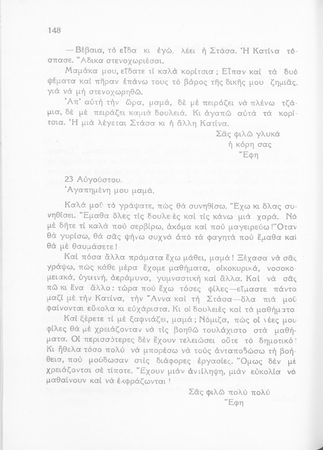 Σχολικό εγχειρίδιο για την Β΄ Γυμνασίου και την Γ΄ Αστικού Θηλέων για το μάθημα των Νέων Ελληνικών. Το εγχειρίδιο αποτελείται από κείμενα πεζού λόγου, επικολυρικά ποιήματα, ωδές, ηθογραφικά διηγήματα, ρητορικά