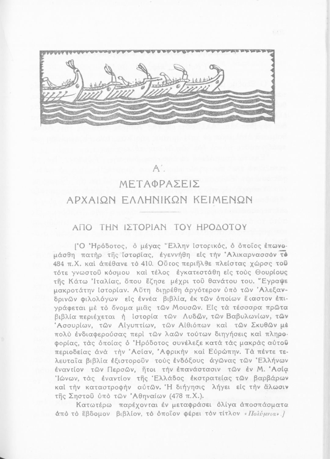 Σχολικό εγχειρίδιο Νέων Ελληνικών Δ΄ Γυμνασίου και Β΄ Αστικού Σχολείου που περιέχει πεζά και ποιήματα Ελλήνων συγγραφέων εμπνευσμένα από τη θρησκευτική και κοινωνική ζωή, την ελληνική μυθολογία, την αρχαία και σύγχρονη ελληνική ιστορία, και την ελληνική φύση. Περιέχει παράρτημα με μεταφράσεις κειμένων αρχαίων ελλήνων συγγραφέων και αποσπάσματα από τη μεσαιωνική γραμματεία, βιογραφίες των συγγραφέων και λεξιλόγιο.
