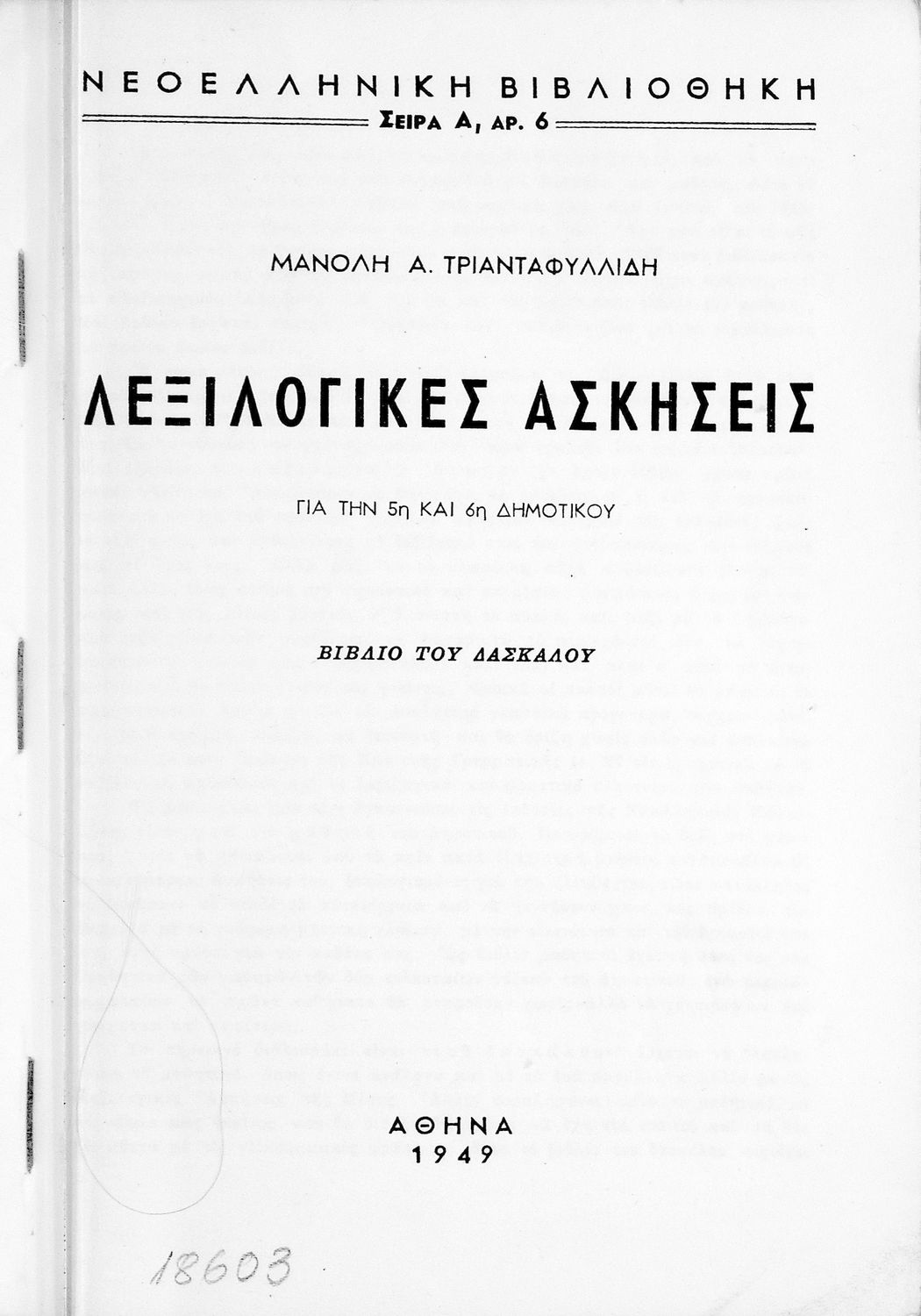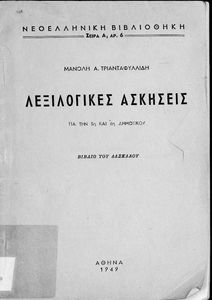 Κωδικός αναγνώρισης: 01-18603 Τίτλος: Λεξιλογικές Ασκήσεις για την Ε΄, ΣΤ΄ Δημοτικού, Βιβλίο του δασκάλου Συγγραφέας: Μανόλης Α. Τριανταφυλλίδης Μέγεθος και υπόστρωμα: Παιδαγωγικό βοήθημα, 21εκ., μαλακό εξώφυλλο, 47 σελίδες. |