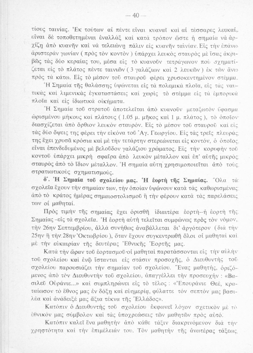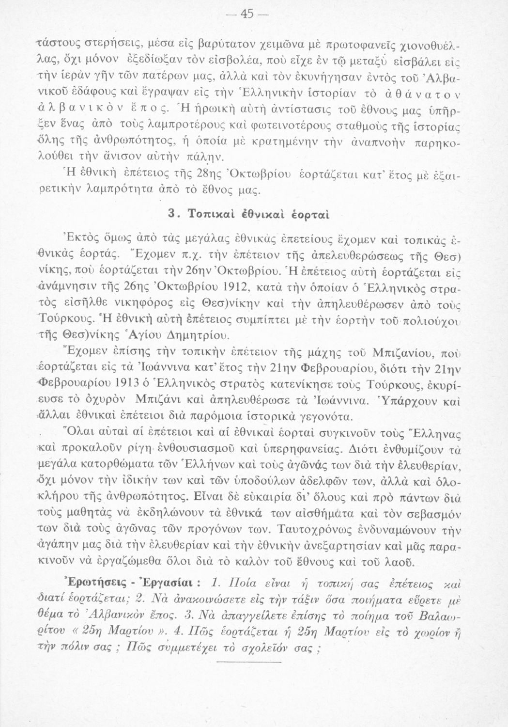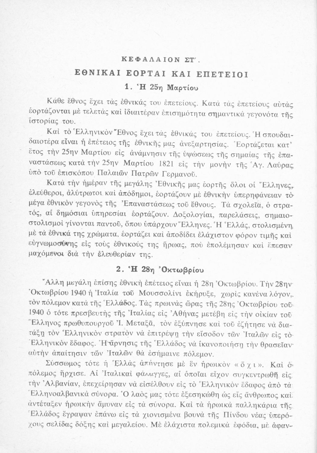 Βαθμίδα εκπαίδευσης: Πρωτοβάθμια Τάξη: Ε' Δημοτικού / ΣΤ' Δημοτικού Μάθημα: Αγωγή Του Πολίτη Γλώσσα: Απλή καθαρεύουσα Παρουσίαση περιεχομένου: Μαθητικό βοήθημα Αγωγής του Πολίτη Ε΄ και ΣΤ΄ Δημοτικού που εστιάζει στα καθήκοντα του πολίτη προς την πατρίδα, τη θρησκεία και την οικογένεια, στα εθνικά σύμβολα και στον εθνικό ύμνο. Αποσκοπεί στην καλλιέργεια της εθνικής συνείδησης. |