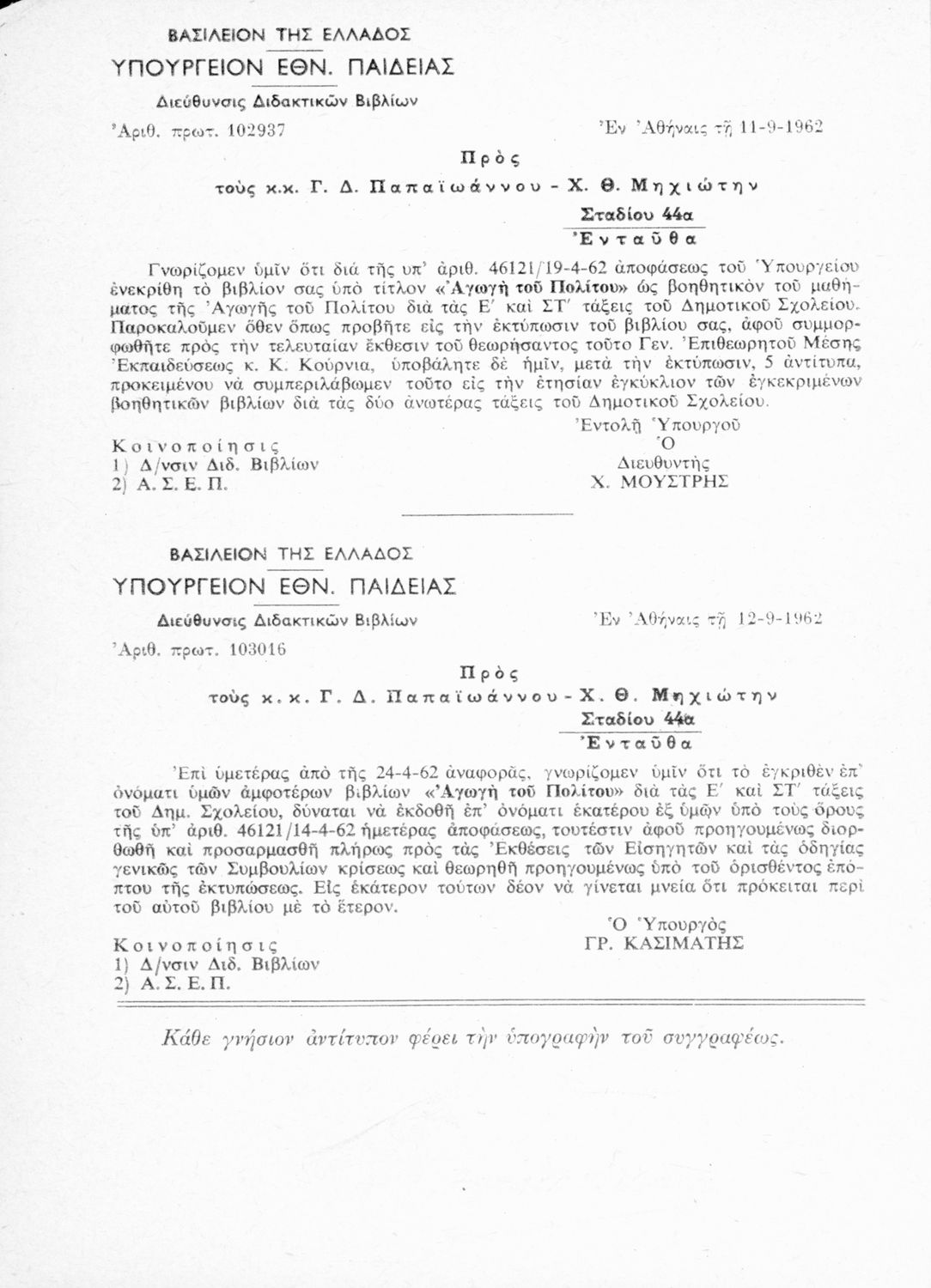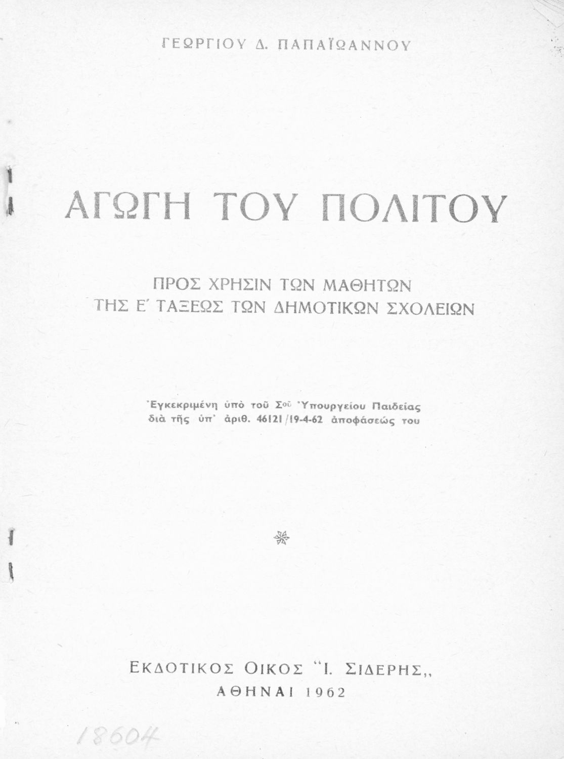 Κωδικός αναγνώρισης: 01-18604 Τίτλος: Αγωγή του Πολίτου. Προς χρήσιν των μαθητών της Ε΄ Τάξεως των Δημοτικών Σχολείων Συγγραφέας: Γεώργιος Δ. Παπαϊωάννου Μέγεθος και υπόστρωμα: Μαθητικό βοήθημα, 80 σελίδες. |