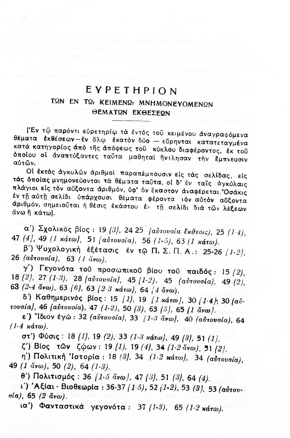 Παιδαγωγικό βοήθημα για τους υποψηφίους των ανωτέρων και ανωτάτων σχολών και τους μαθητές Γυμνασίου που περιλαμβάνει θέματα εκθέσεων ιδεών ιστορικού και φιλοσοφικού περιεχομένου.