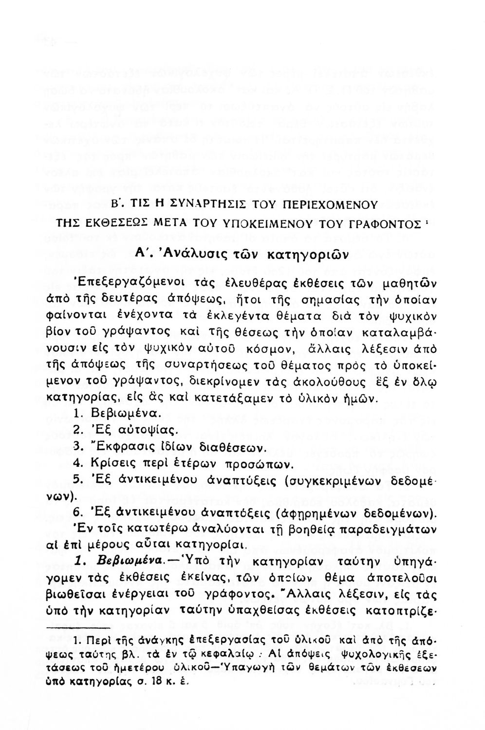 Παρουσίαση περιεχομένου: Εκπαιδευτικό βοήθημα Γλώσσας για τη Δευτεροβάθμια Εκπαίδευση. Το σύγγραμμα αποτελεί τη διδακτορική διατριβή του συγγραφέα που την είχε υποβάλει στη Φιλοσοφική Σχολή Αθηνών, σχετικά με τις εκθέσεις ιδεών των μαθητών. Ο συγγραφέας υπήρξε καθηγητής του Πειραματικού Σχολείου Πανεπιστημίου Αθηνών.