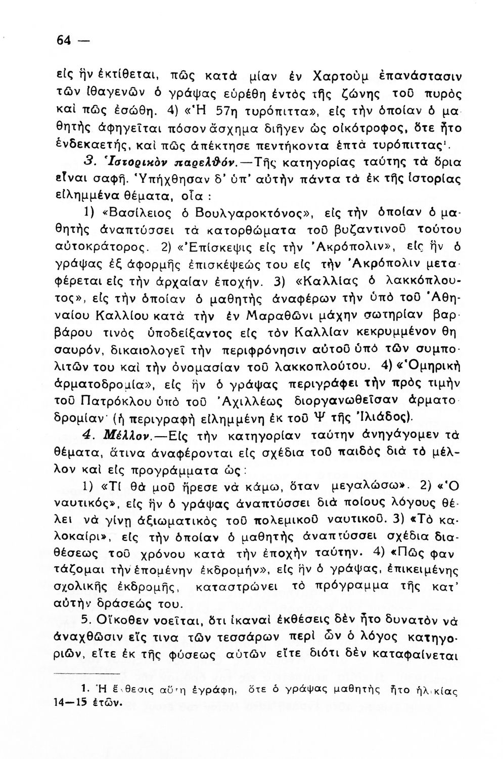 Βαθμίδα εκπαίδευσης: Δευτεροβάθμια Μάθημα: Νέα Ελληνικά Γλώσσα: Καθαρεύουσα Παρουσίαση περιεχομένου: Εκπαιδευτικό βοήθημα Γλώσσας για τη Δευτεροβάθμια Εκπαίδευση. Το σύγγραμμα αποτελεί τη διδακτορική διατριβή του συγγραφέα που την είχε υποβάλει στη Φιλοσοφική Σχολή Αθηνών, σχετικά με τις εκθέσεις ιδεών των μαθητών. Ο συγγραφέας υπήρξε καθηγητής του Πειραματικού Σχολείου Πανεπιστημίου Αθηνών. |