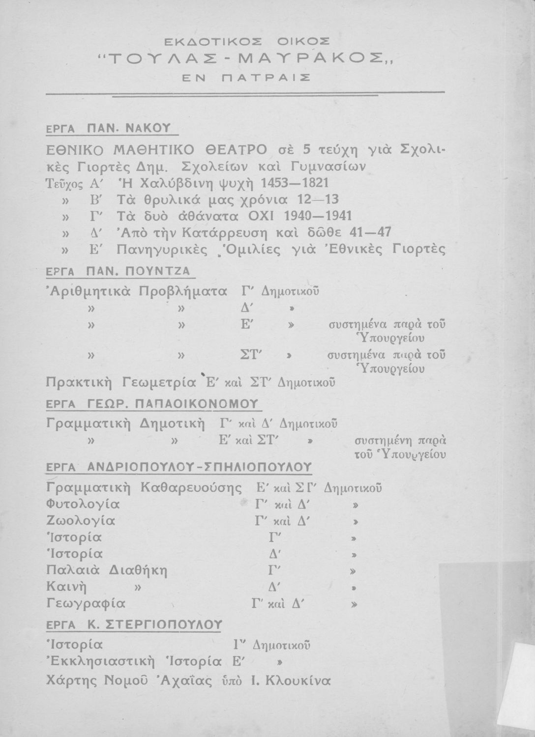 Εκδότης: Εκδοτικός οίκος Τούρλας-Μαυράκος Έτος έκδοσης: 1948 Τόπος έκδοσης: Πάτρα |