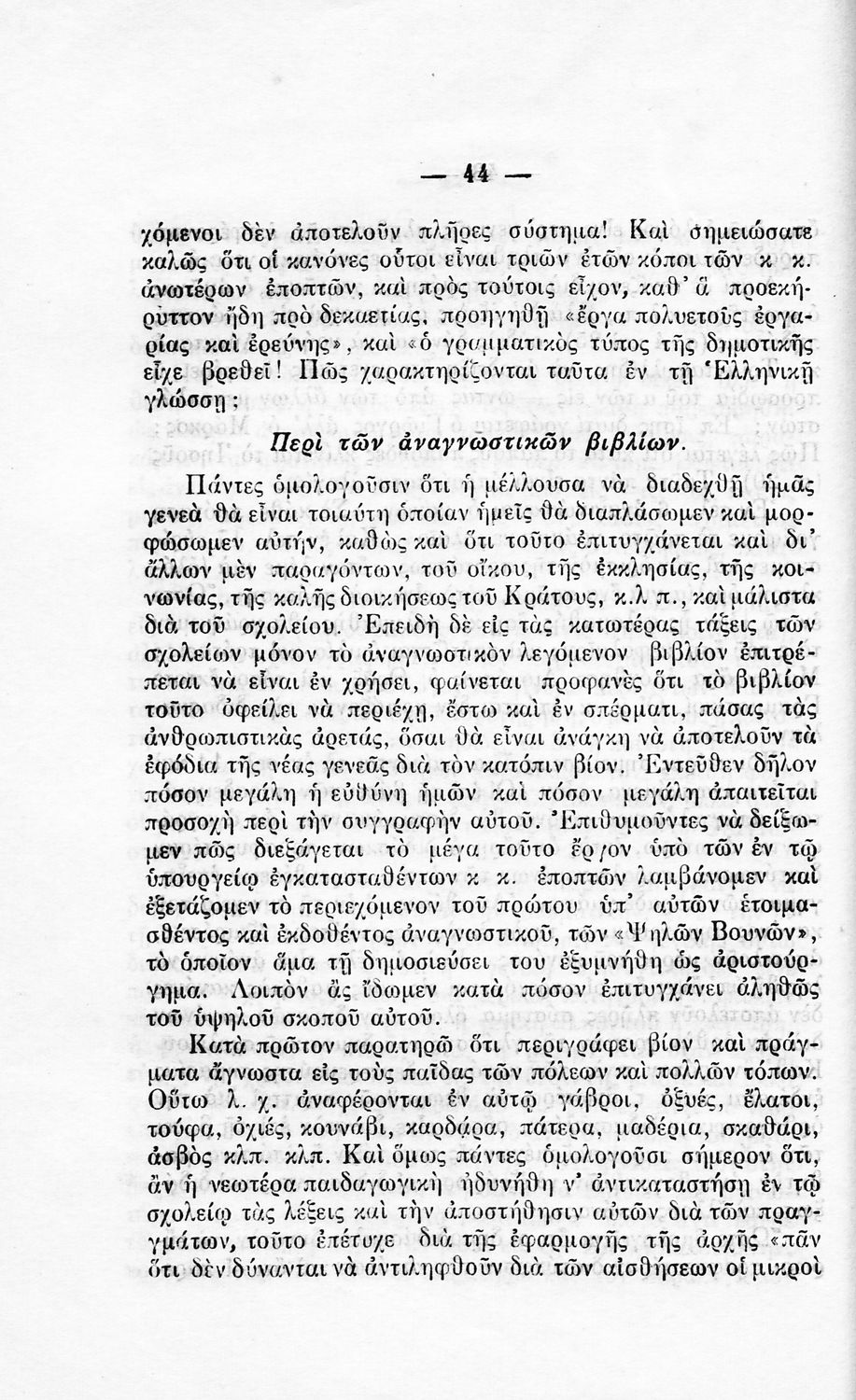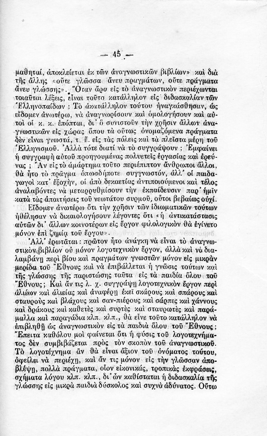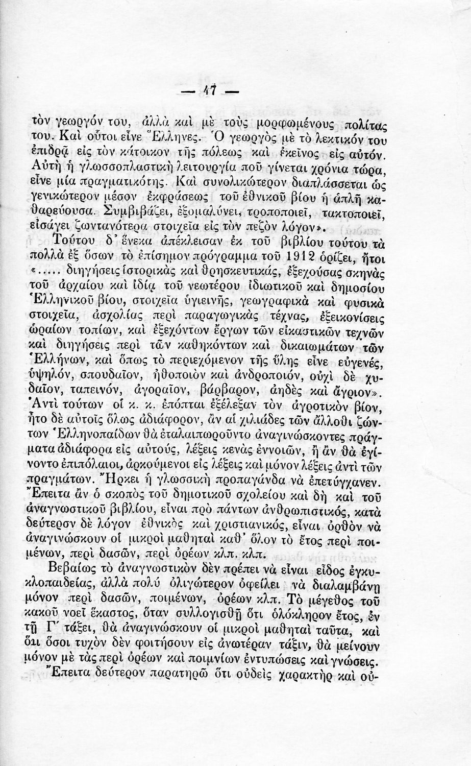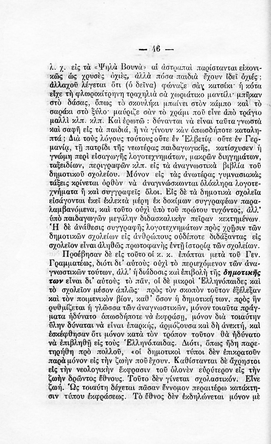 Βαθμίδα εκπαίδευσης: Πρωτοβάθμια Γλώσσα: Καθαρεύουσα Παρουσίαση περιεχομένου: Δοκίμιο κατά του Δημοτικισμού και κυρίως του σχολικού εγχειριδίου Τα Ψηλά Βουνά. |
