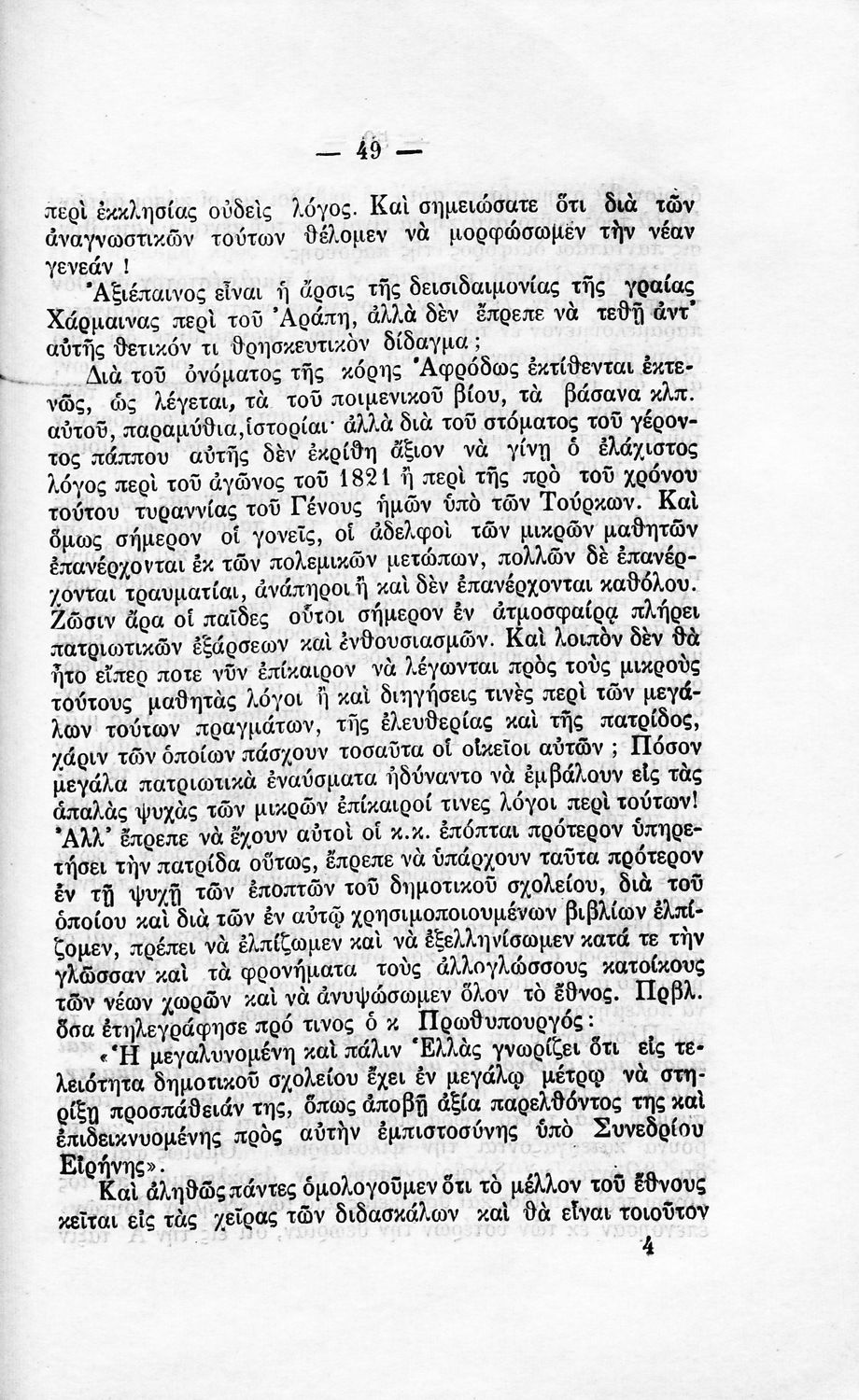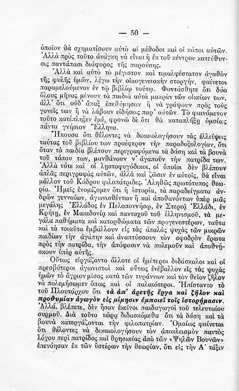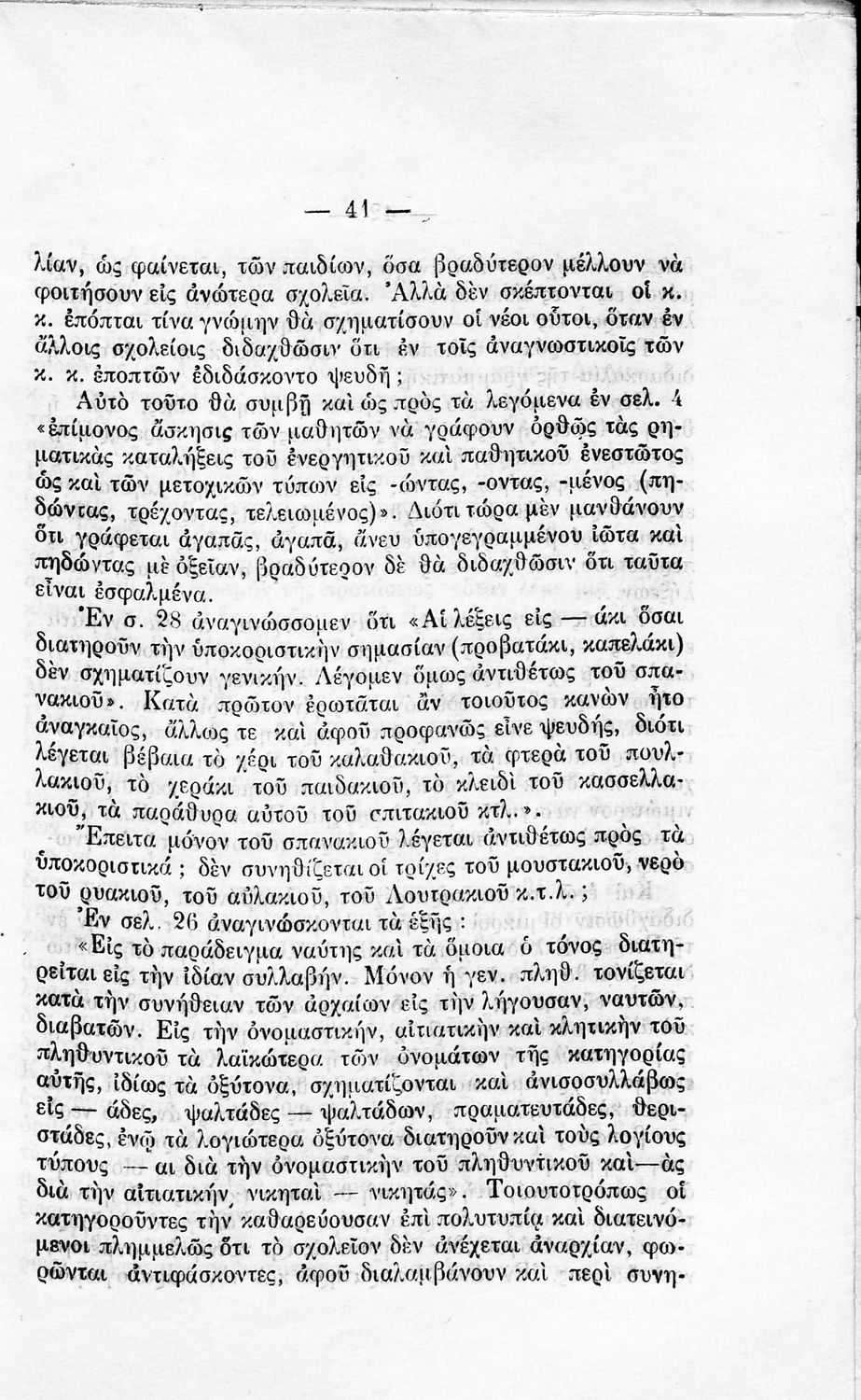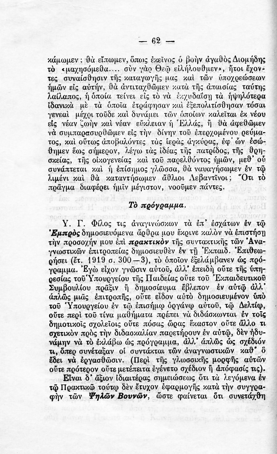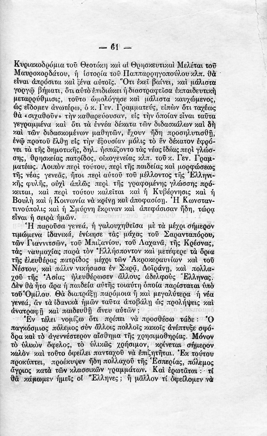 Βαθμίδα εκπαίδευσης: Πρωτοβάθμια Γλώσσα: Καθαρεύουσα Παρουσίαση περιεχομένου: Δοκίμιο κατά του Δημοτικισμού και κυρίως του σχολικού εγχειριδίου Τα Ψηλά Βουνά. |