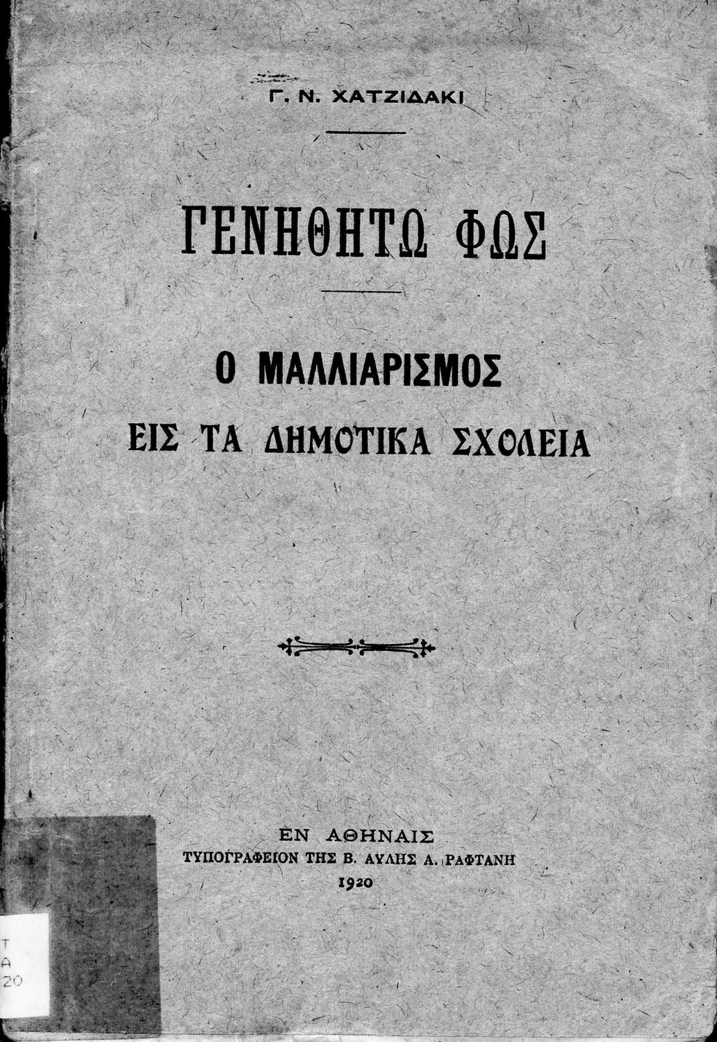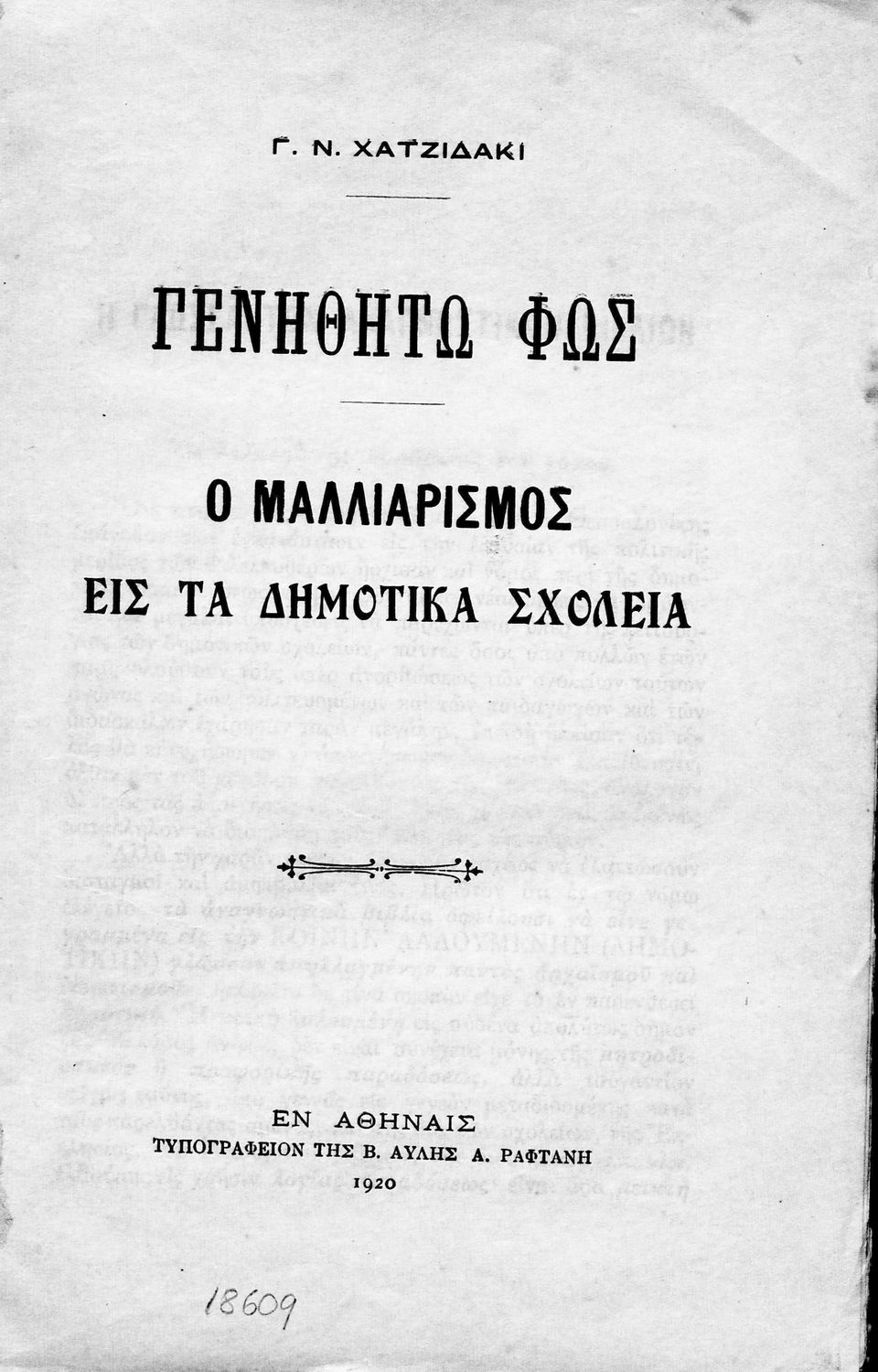 Κωδικός αναγνώρισης: 01-18609 Τίτλος: Γενηθήτω φως, Ο Μαλλιαρισμός εις τα Δημοτικά Σχολεία Συγγραφέας: Γ. Ν. Χατζιδάκις Μέγεθος και υπόστρωμα: Άλλο, μαλακό εξώφυλλο, 61 σελίδες. |