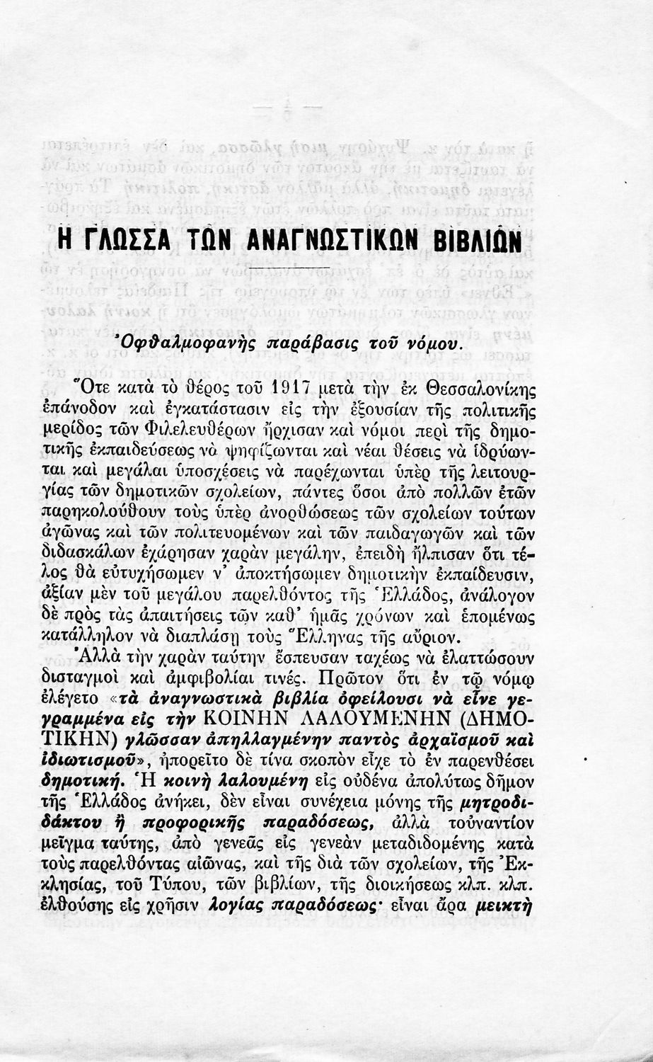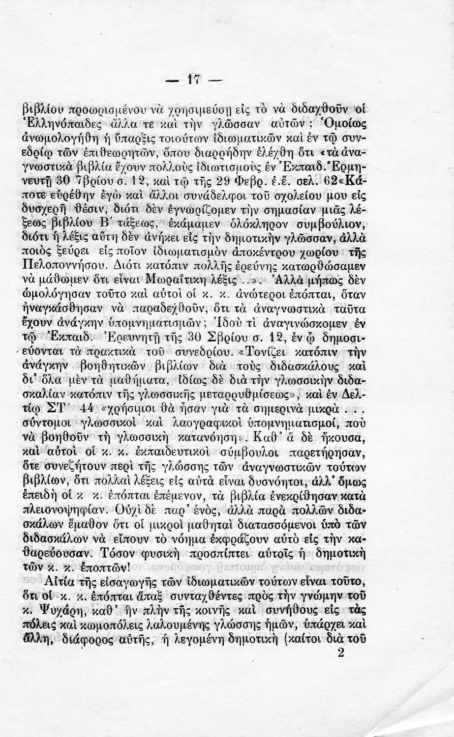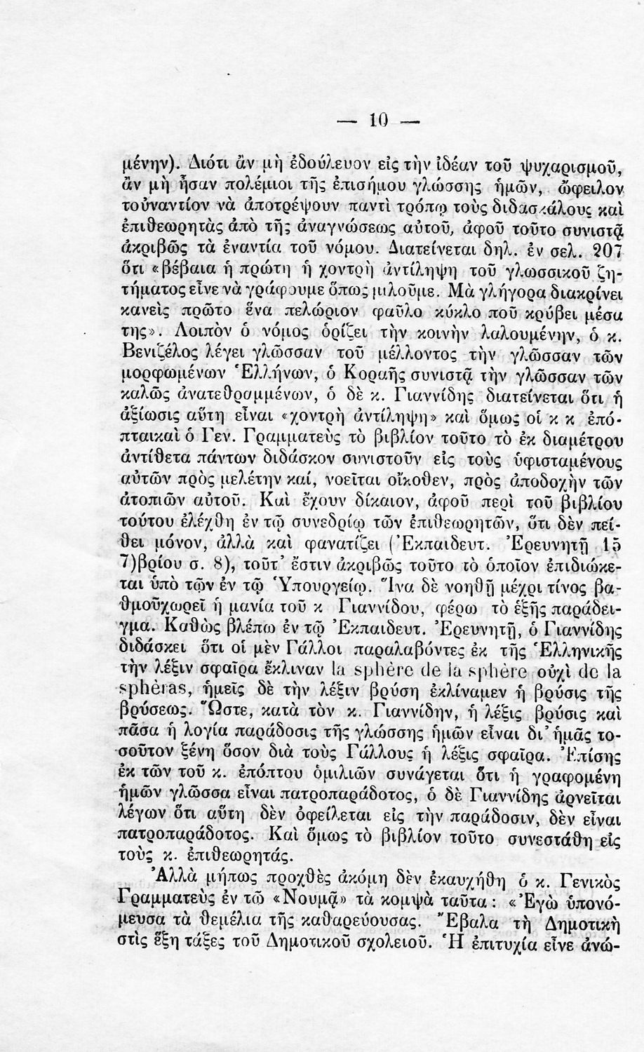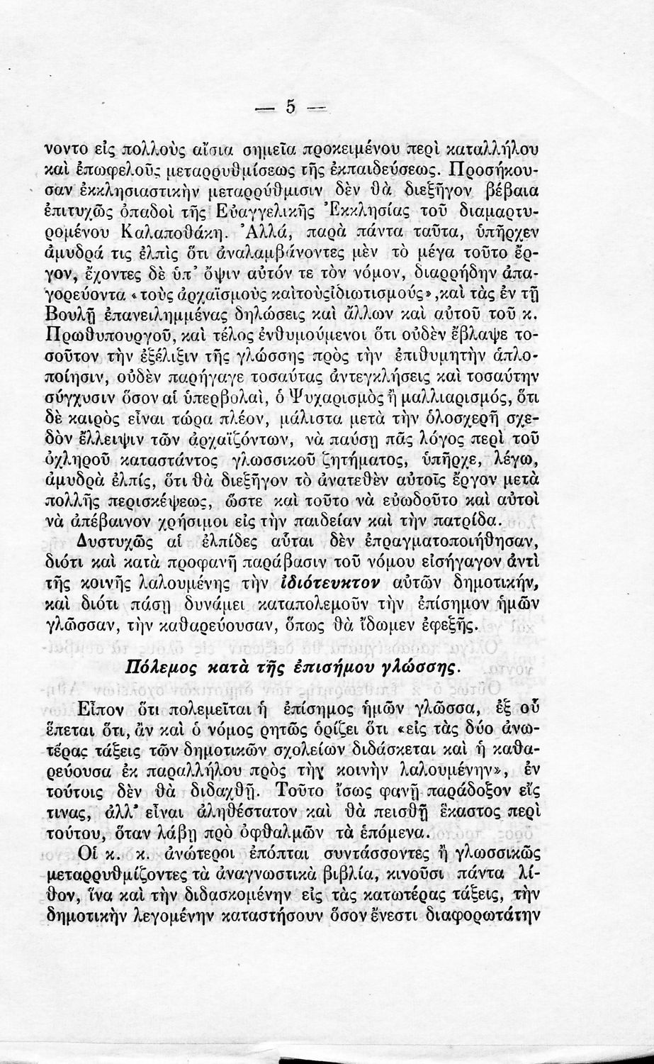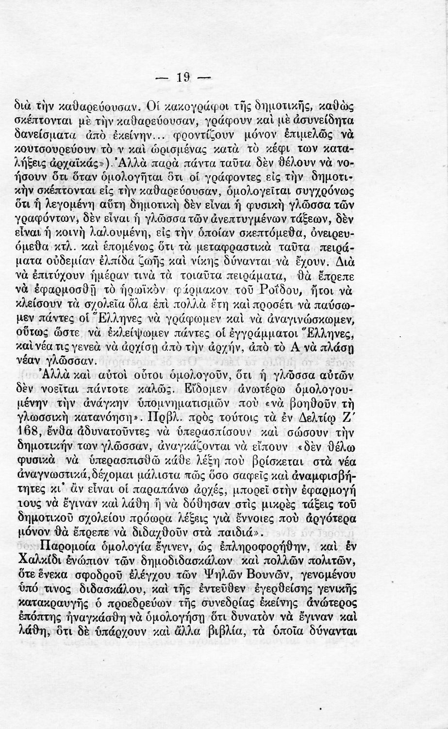 Βαθμίδα εκπαίδευσης: Πρωτοβάθμια Γλώσσα: Καθαρεύουσα Παρουσίαση περιεχομένου: Δοκίμιο κατά του Δημοτικισμού και κυρίως του σχολικού εγχειριδίου Τα Ψηλά Βουνά. |