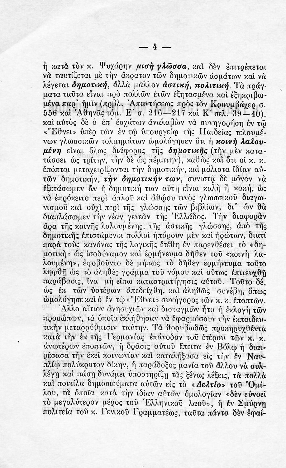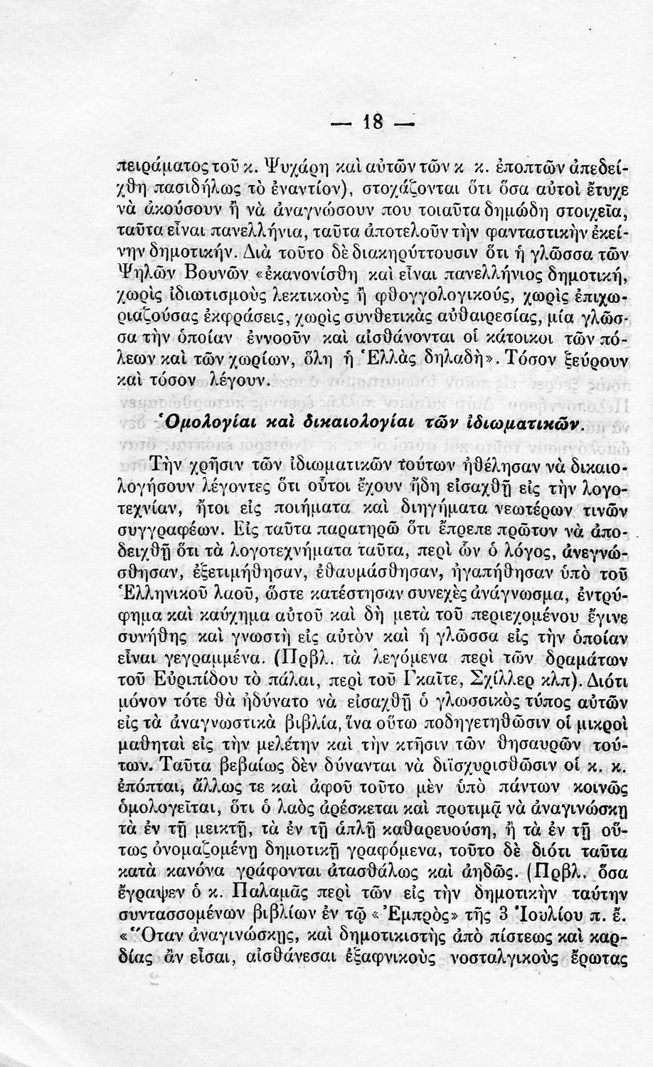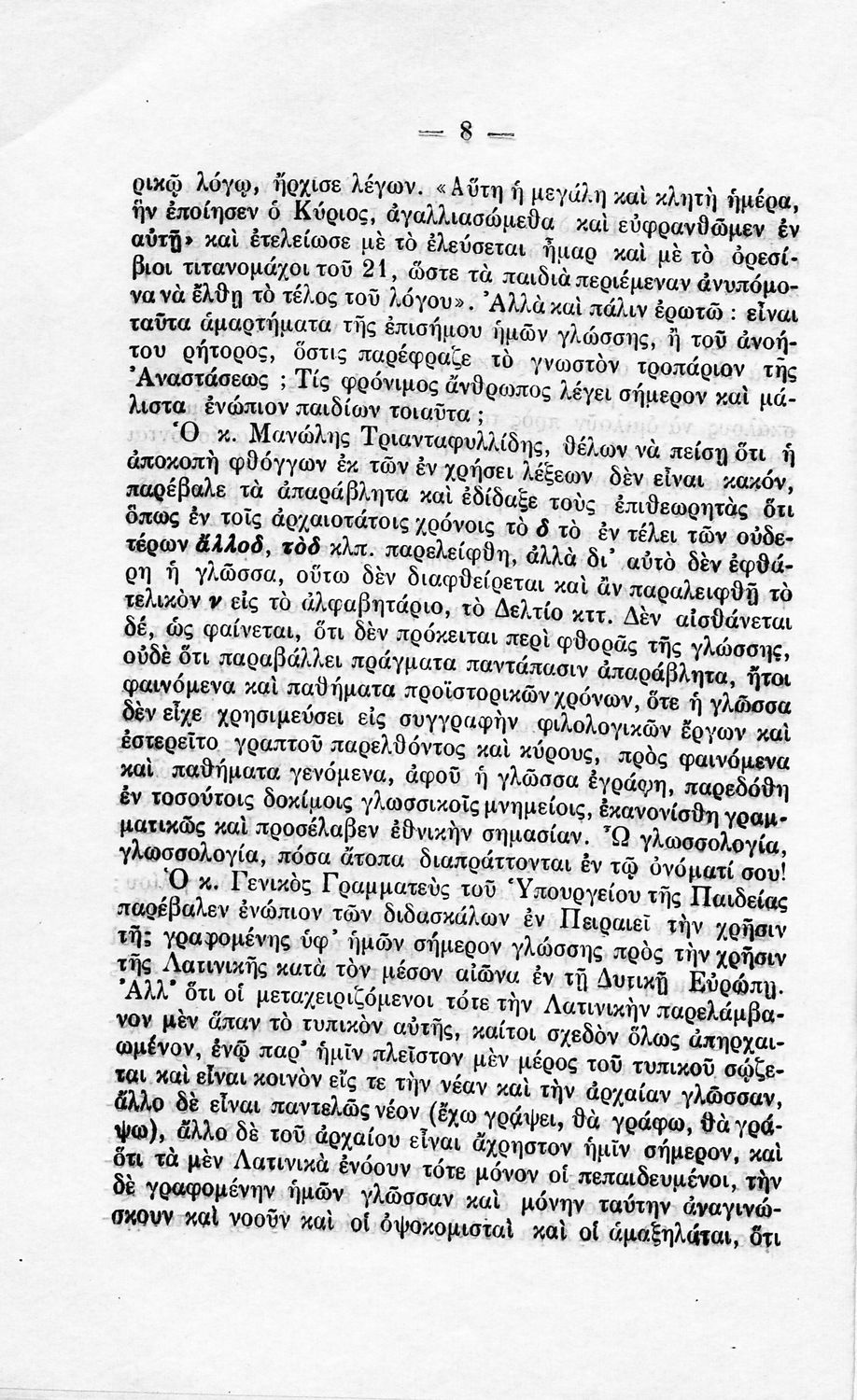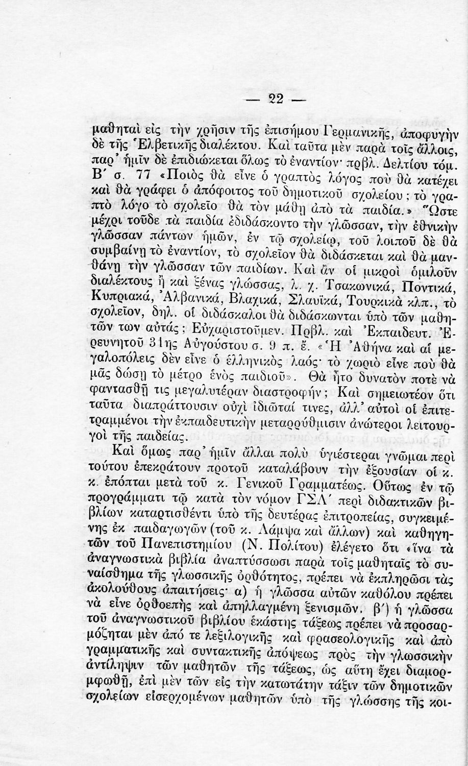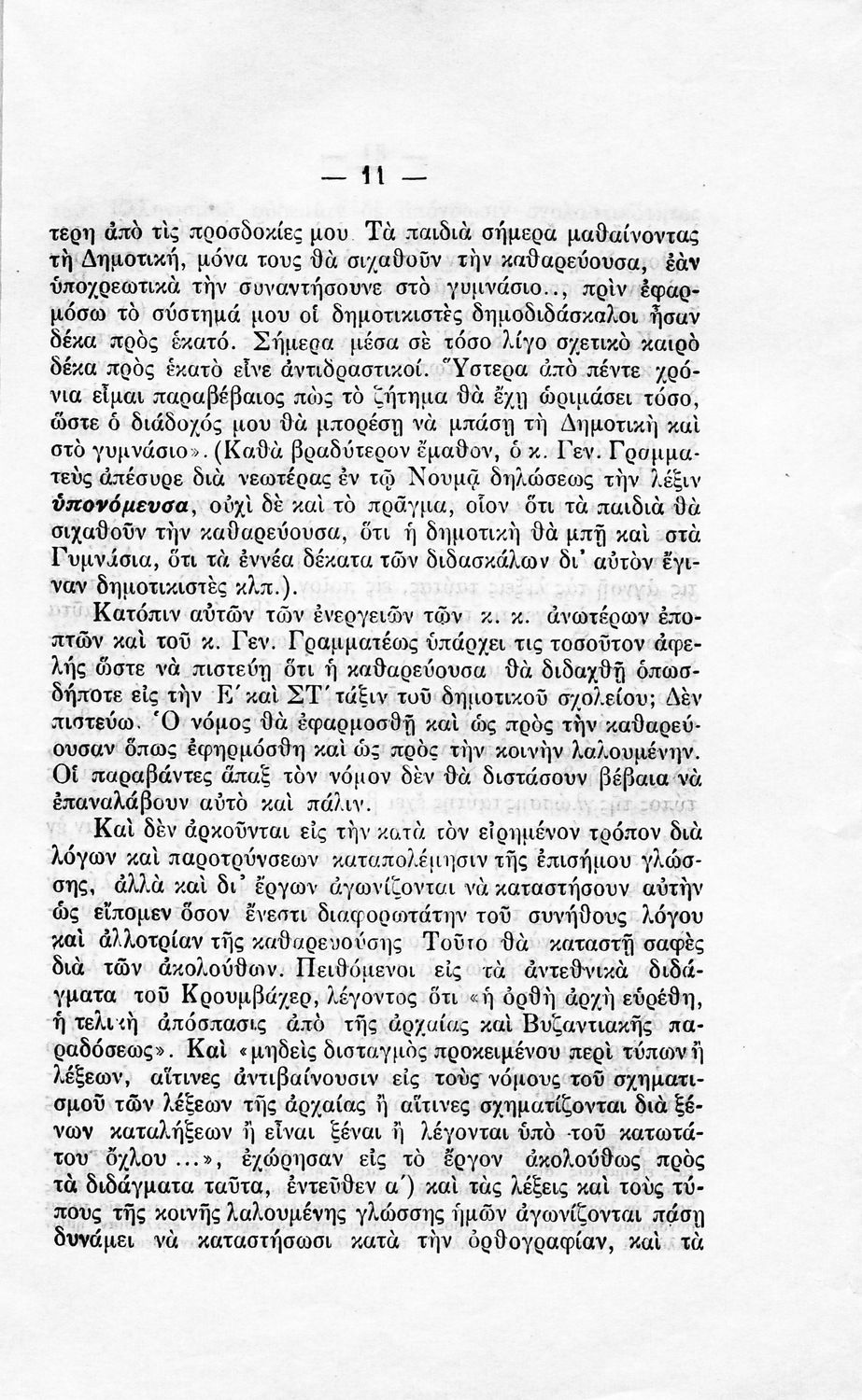 Βαθμίδα εκπαίδευσης: Πρωτοβάθμια Γλώσσα: Καθαρεύουσα Παρουσίαση περιεχομένου: Δοκίμιο κατά του Δημοτικισμού και κυρίως του σχολικού εγχειριδίου Τα Ψηλά Βουνά. |