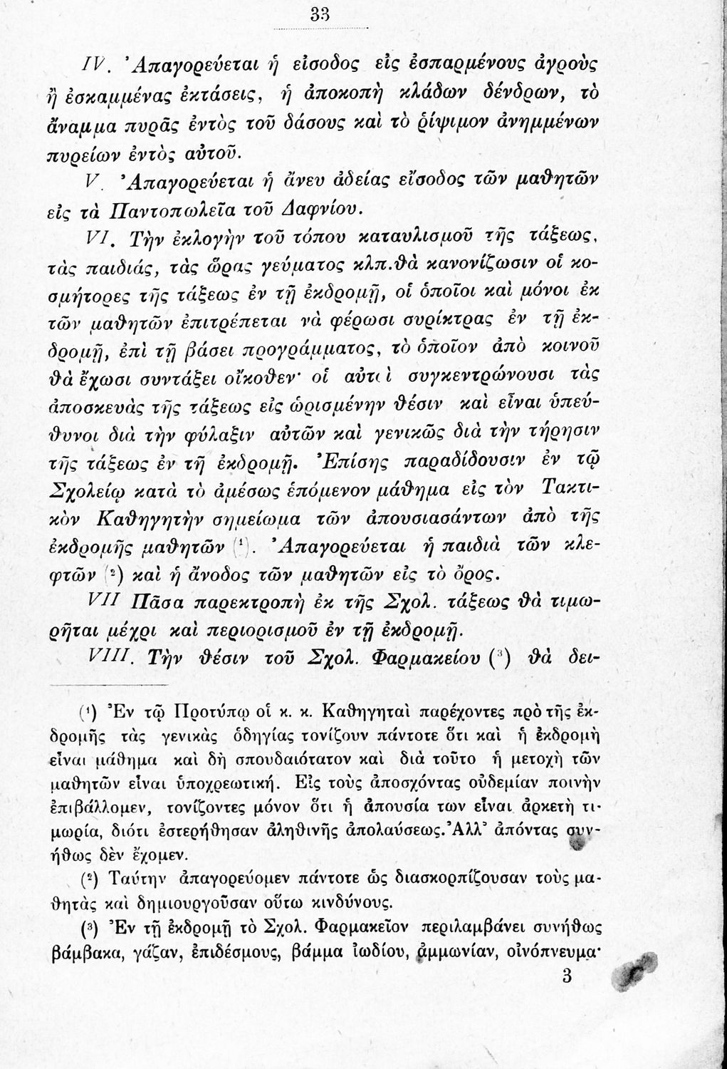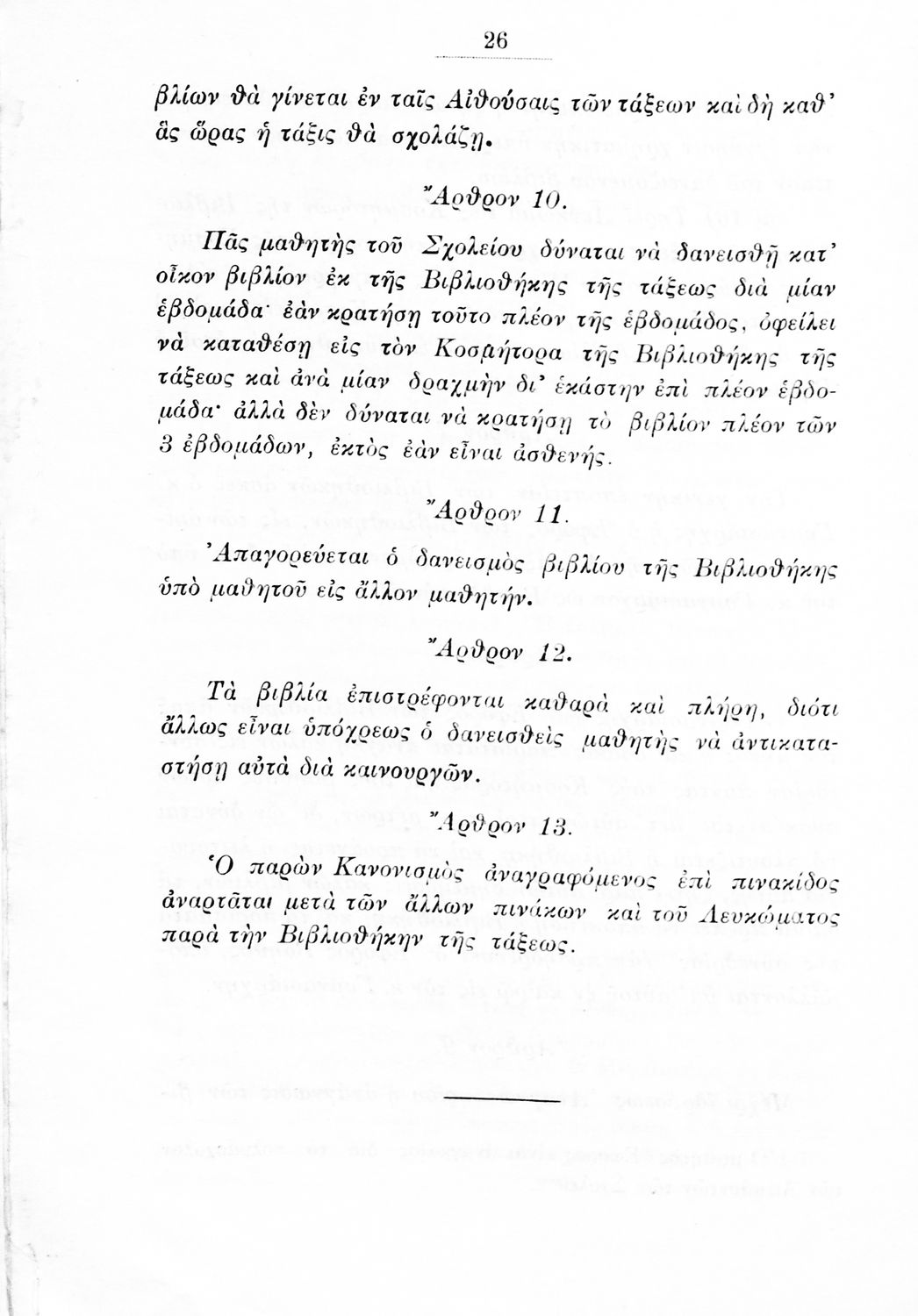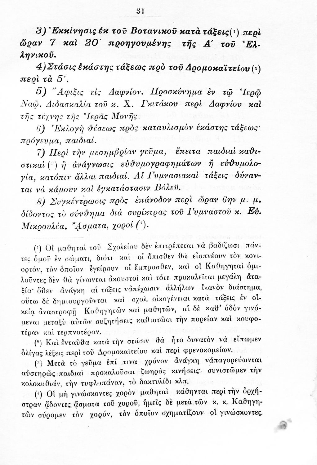 Παιδαγωγικό βοήθημα που αναφέρεται στον κανονισμό λειτουργίας των σχολείων Μέσης εκπαίδευσης. Ο συγγραφέας ήταν Γυμνασιάρχης στο Διδασκαλείο της Μέσης Εκπαίδευσης Πρότυπου Κλασσικού Γυμνασίου