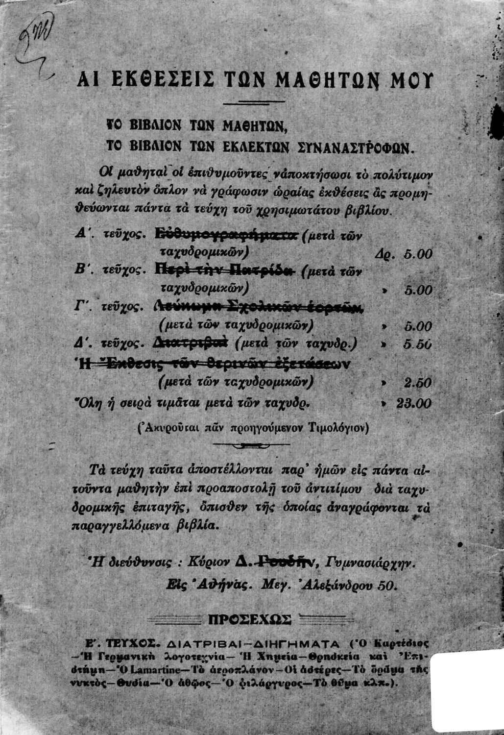 Τάξη:  Α' Γυμνάσιου / Β' Γυμνάσιου / Ανώτερα Παρθεναγωγεία / Α' Διδασκαλείου