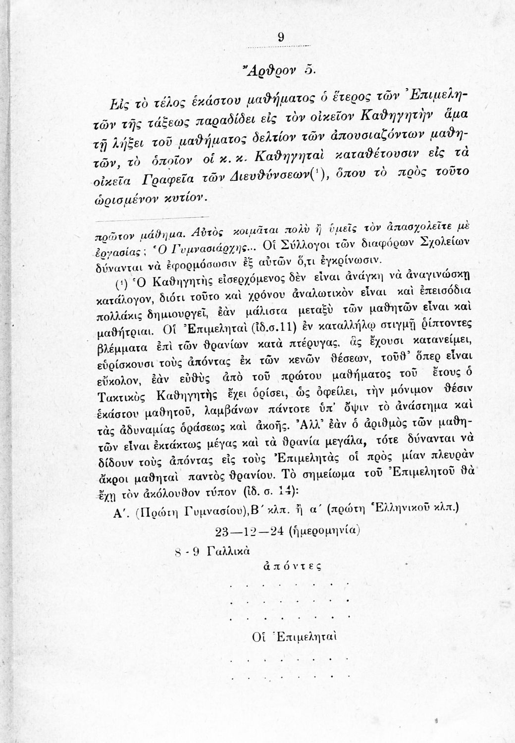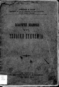 Βαθμίδα εκπαίδευσης: Δευτεροβάθμια Γλώσσα: Καθαρεύουσα Παρουσίαση περιεχομένου: Παιδαγωγικό βοήθημα που αναφέρεται στον κανονισμό λειτουργίας των σχολείων Μέσης εκπαίδευσης. Ο συγγραφέας ήταν Γυμνασιάρχης στο Διδασκαλείο της Μέσης Εκπαίδευσης Πρότυπου Κλασσικού Γυμνασίου |