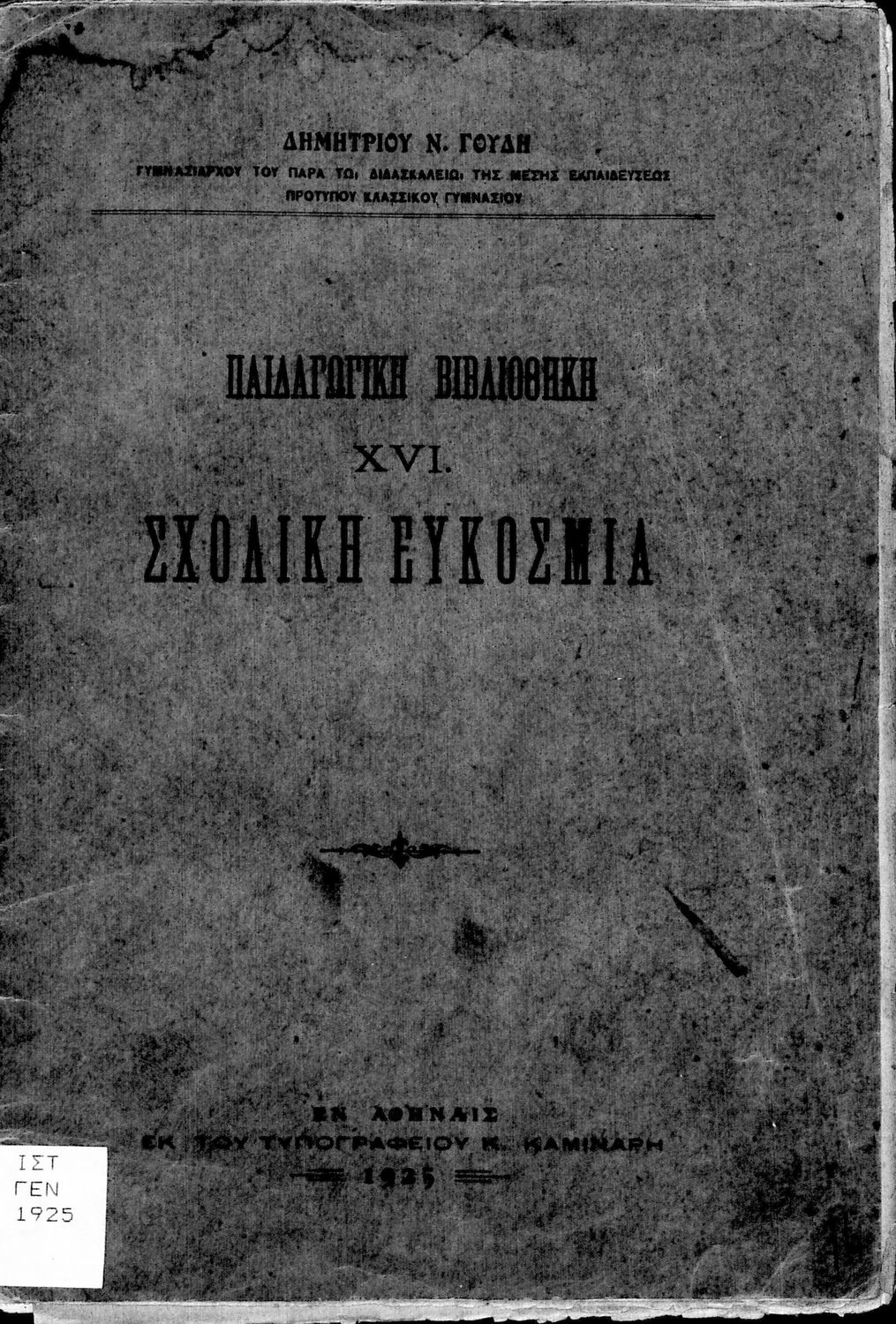 Εκδότης: Τυπογραφείο Κ. Καμινάρη Έτος έκδοσης: 1925 Τόπος έκδοσης: Αθήνα |