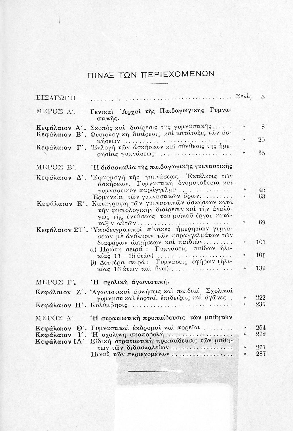 Παρουσίαση περιεχομένου: Παιδαγωγικό βοήθημα που απευθύνεται στους καθηγητές της μέσης και αποσκοπεί στο να θεμελιώσει την Γυμναστική ως εφαρμοσμένη επιστήμη. Ο συγγραφέας ήταν διευθυντής του τμήματος σωματικής αγωγής του Υπουργείου Παιδείας και Θρησκευμάτων.