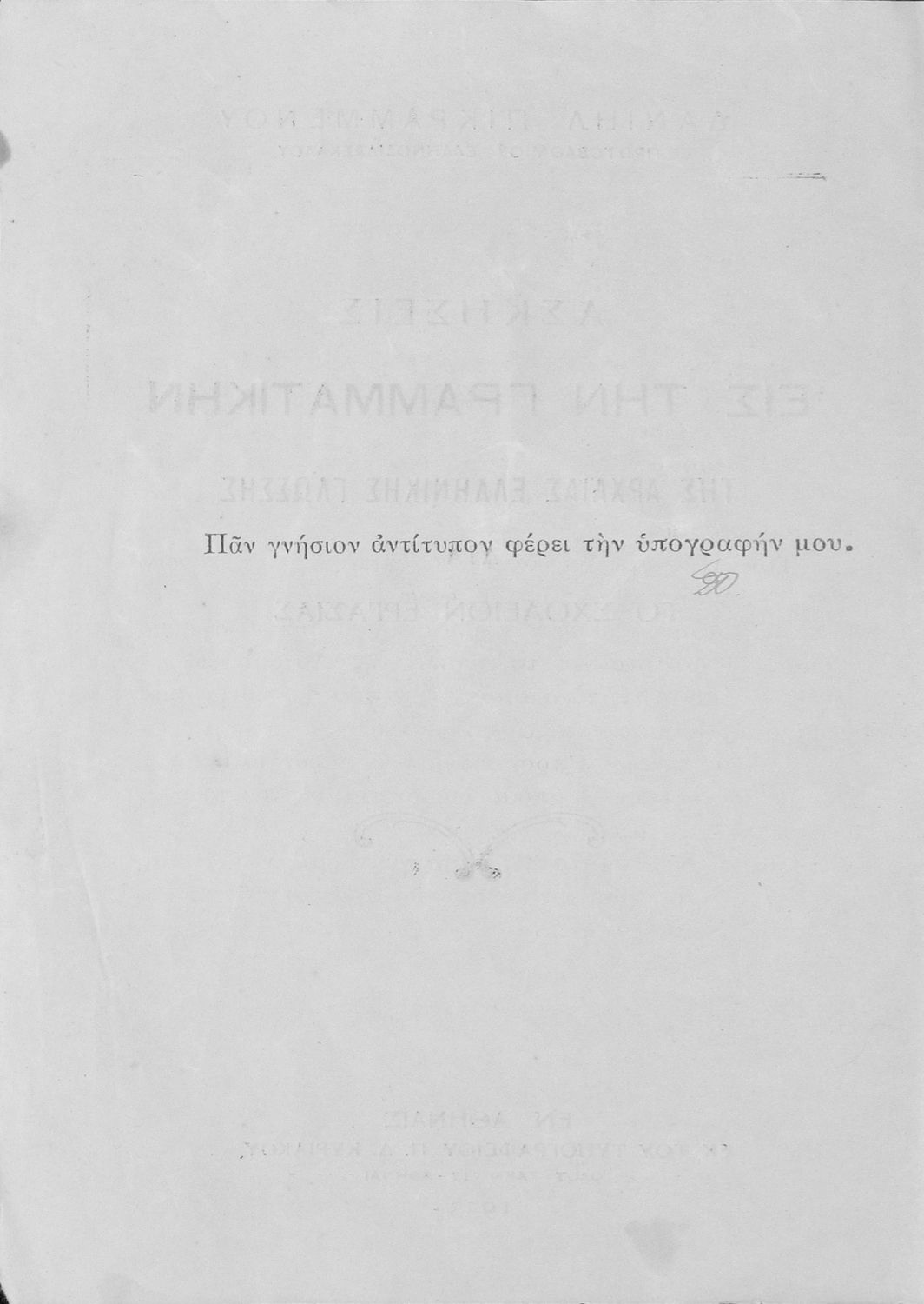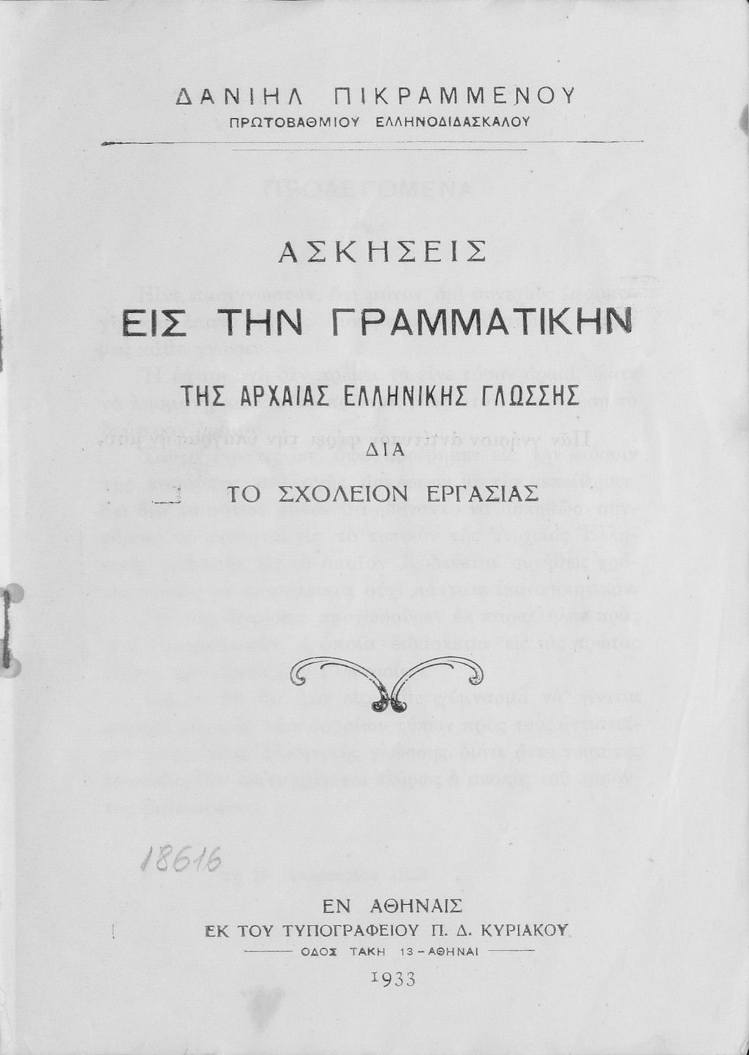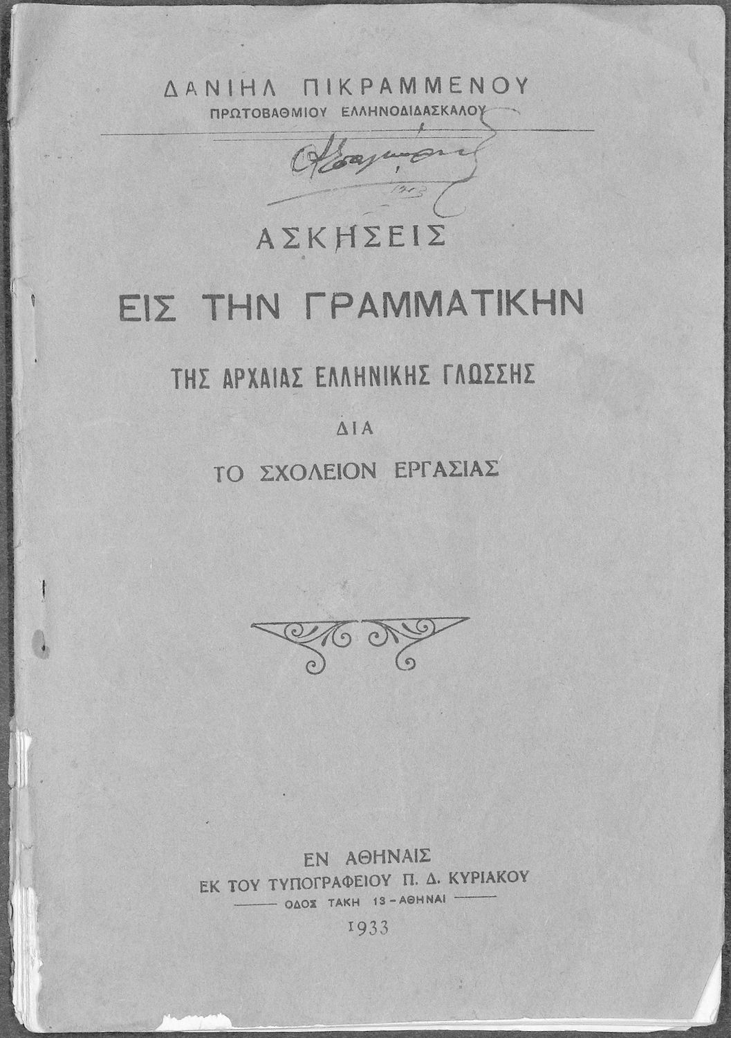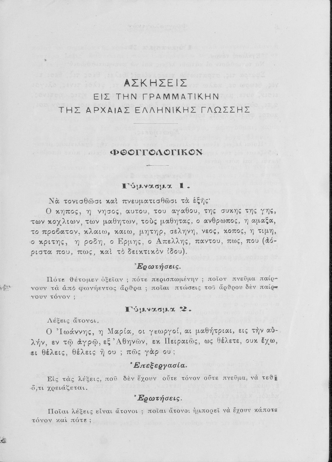 Τίτλος: Ασκήσεις εις την γραμματικήν της αρχαίας ελληνικής γλώσσης δια το σχολείον εργασία