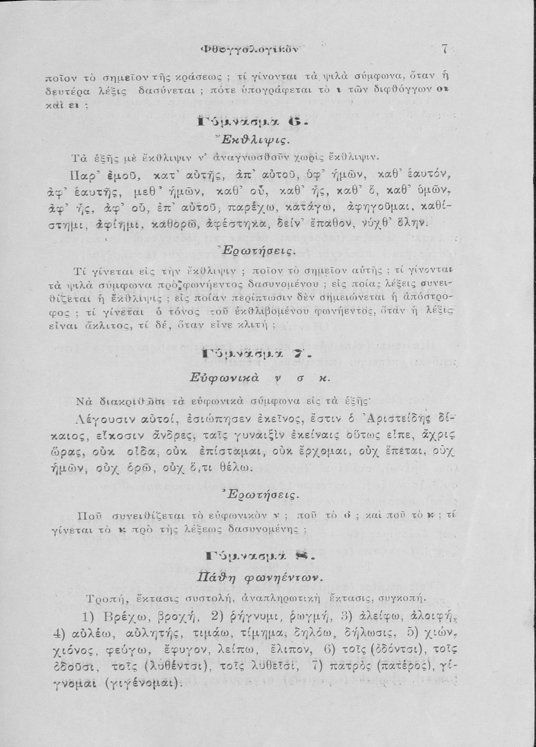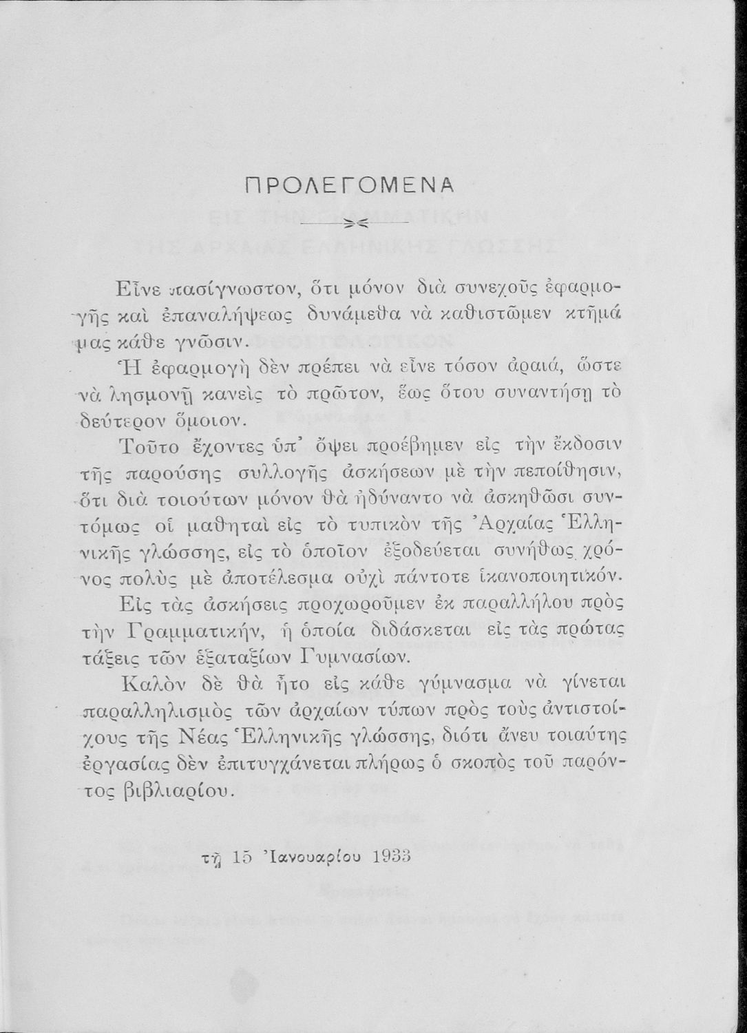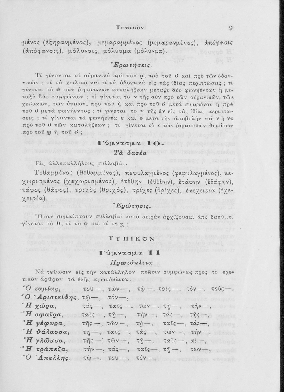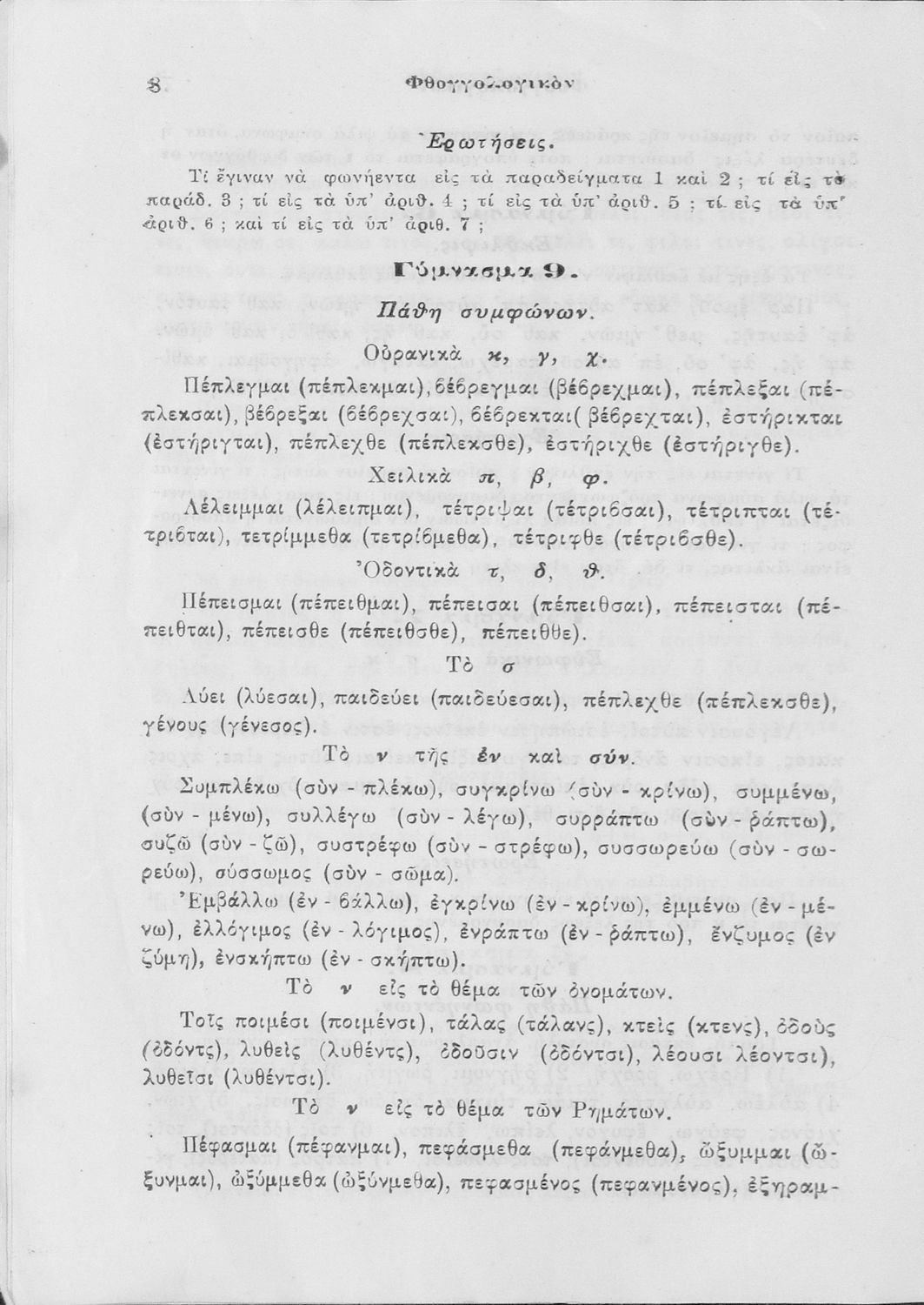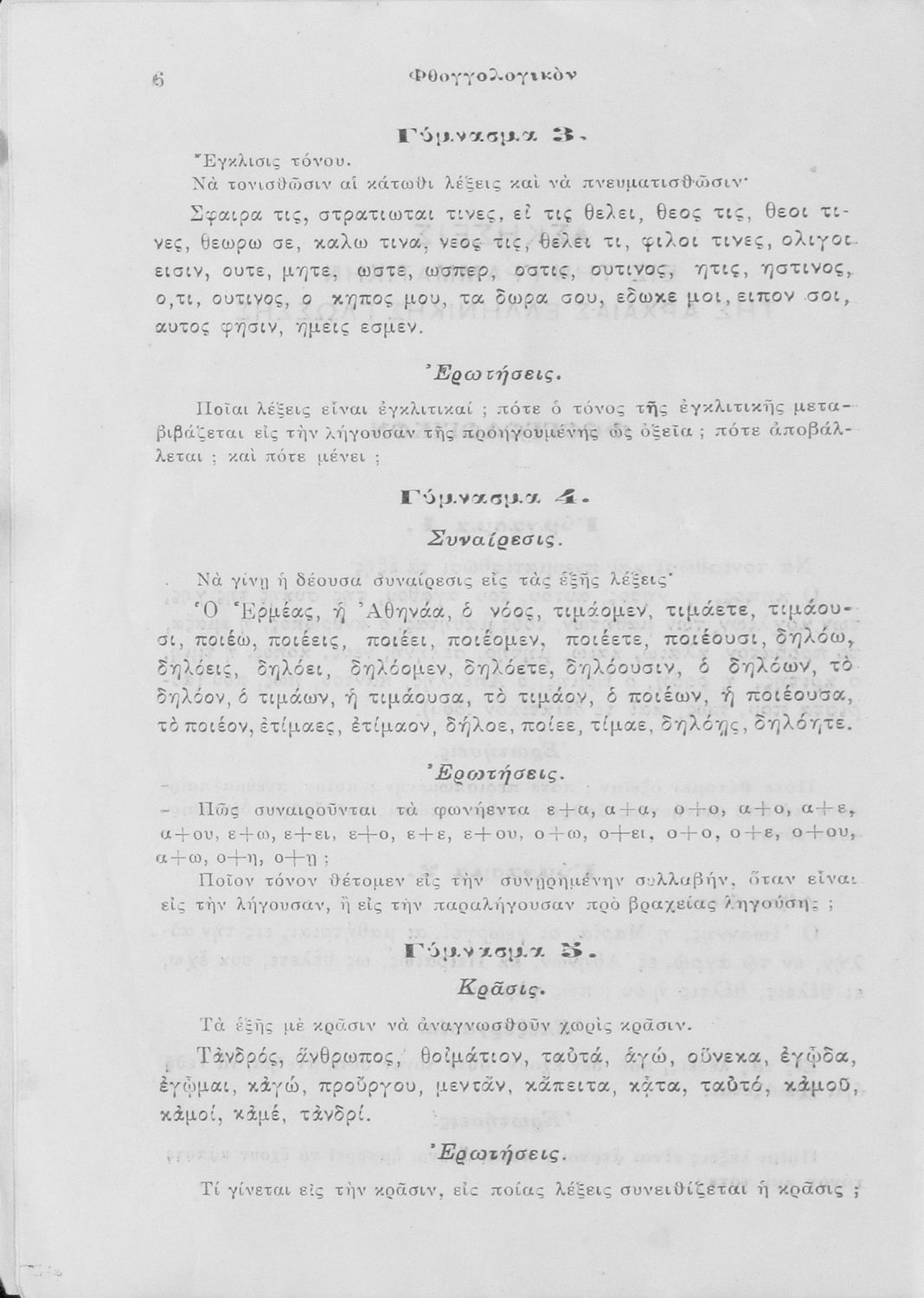 Σχολικό εγχειρίδιο Αρχαίων Ελληνικών για τα Ελληνικά Σχολεία και Παρθεναγωγεία που περιέχει τους κανόνες γραμματικής και είναι χωρισμένο σε φθογγολογικό, τυπολογικό και ετυμολογικό μέρος.