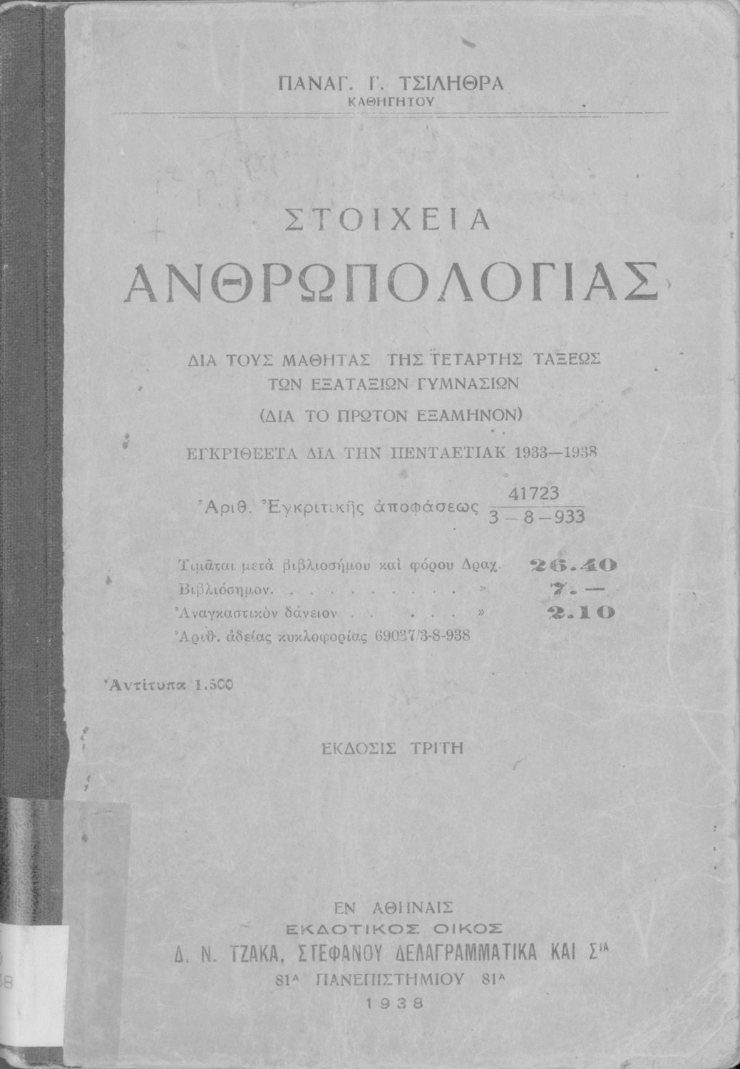 Κωδικός αναγνώρισης: 01-18617 Τίτλος: Στοιχεία Ανθρωπολογίας δια τους μαθητάς της τετάρτης τάξεως των Εξαταξίων Γυμνάσιων Συγγραφέας: Παν. Γ. Τσιλήθρας Μέγεθος και υπόστρωμα: Σχολικό εγχειρίδιο, σκληρό εξώφυλλο, 91 σελίδες. |