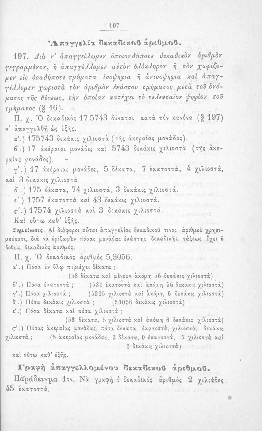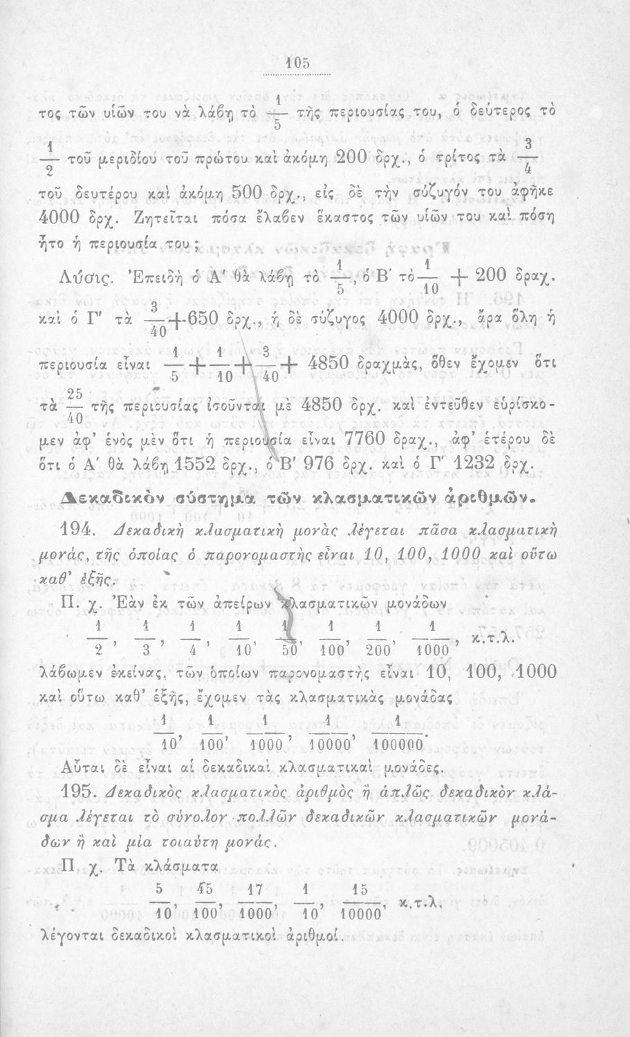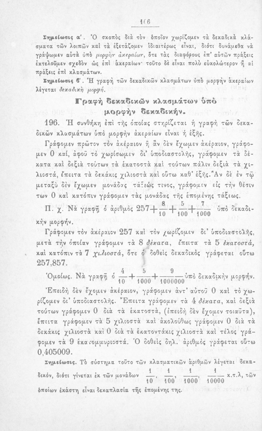 Σχολικό εγχειρίδιο Αριθμητικής για τα Ελληνικά και Αστικά Σχολεία και τα Παρθεναγωγεία που εστιάζει στις αριθμητικές πράξεις, τα κλάσματα, τους δεκαδικούς και συμμιγείς αριθμούς, και τις δυνάμεις. Περιέχει και