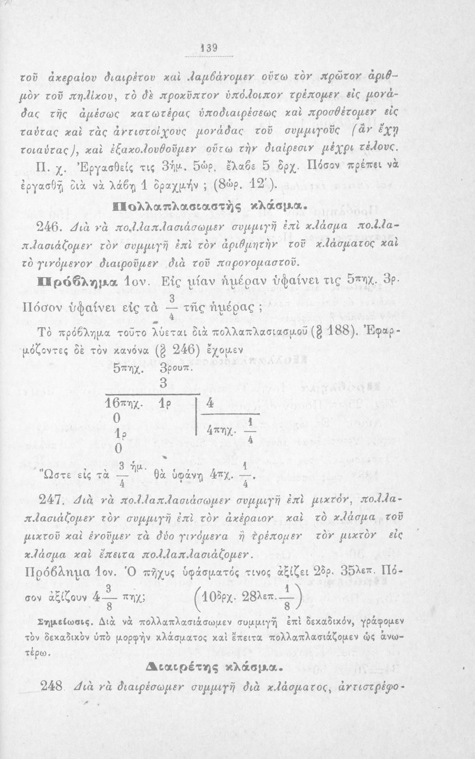 Σχολικό εγχειρίδιο Αριθμητικής για τα Ελληνικά και Αστικά Σχολεία και τα Παρθεναγωγεία που εστιάζει στις αριθμητικές πράξεις, τα κλάσματα, τους δεκαδικούς και συμμιγείς αριθμούς, και τις δυνάμεις. Περιέχει και