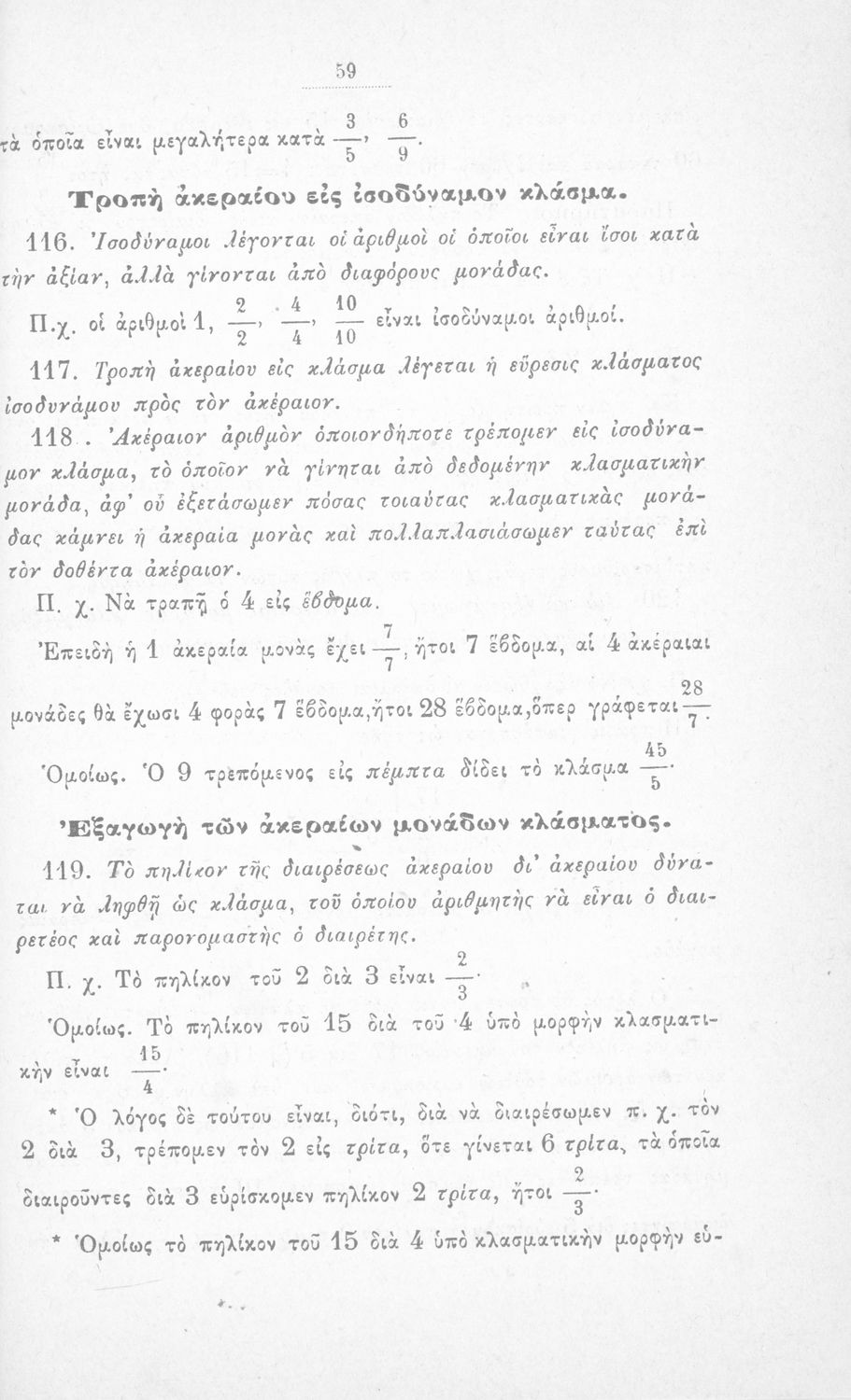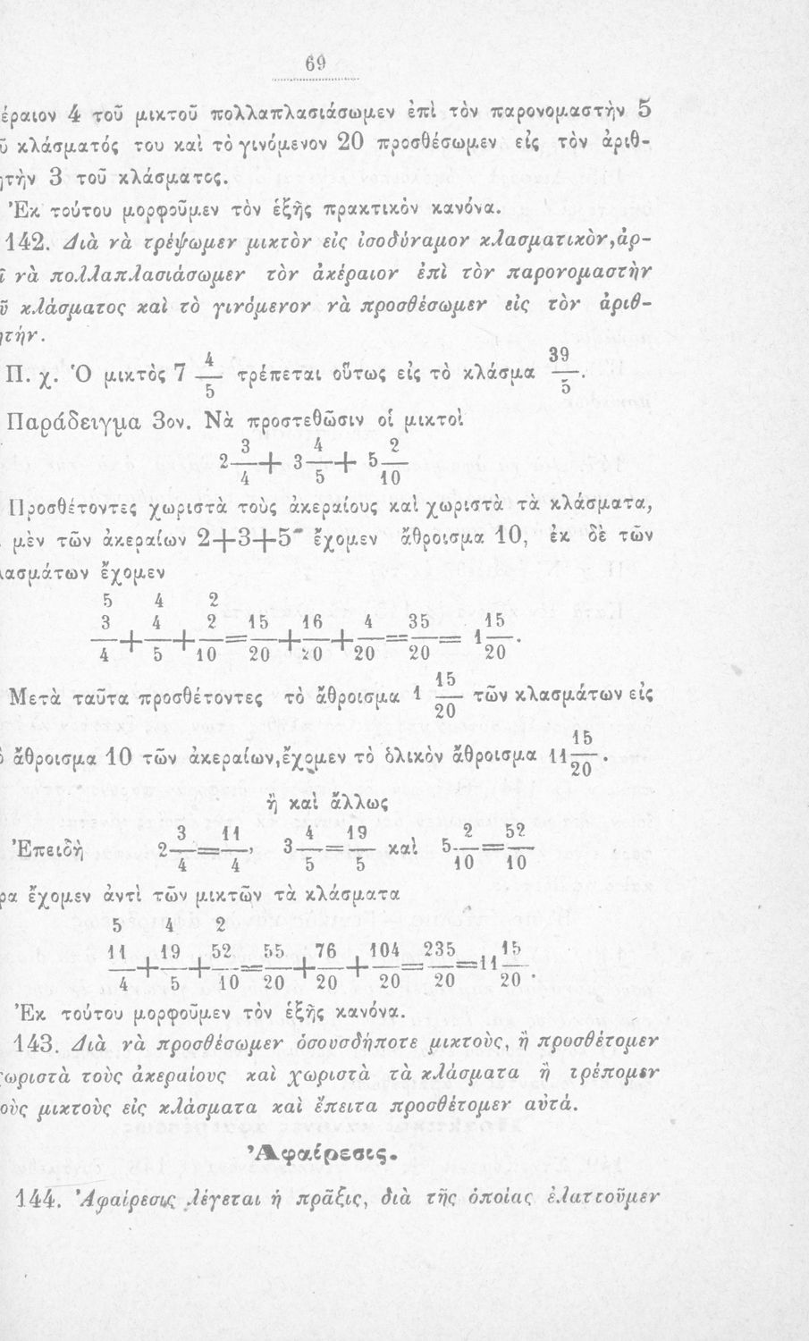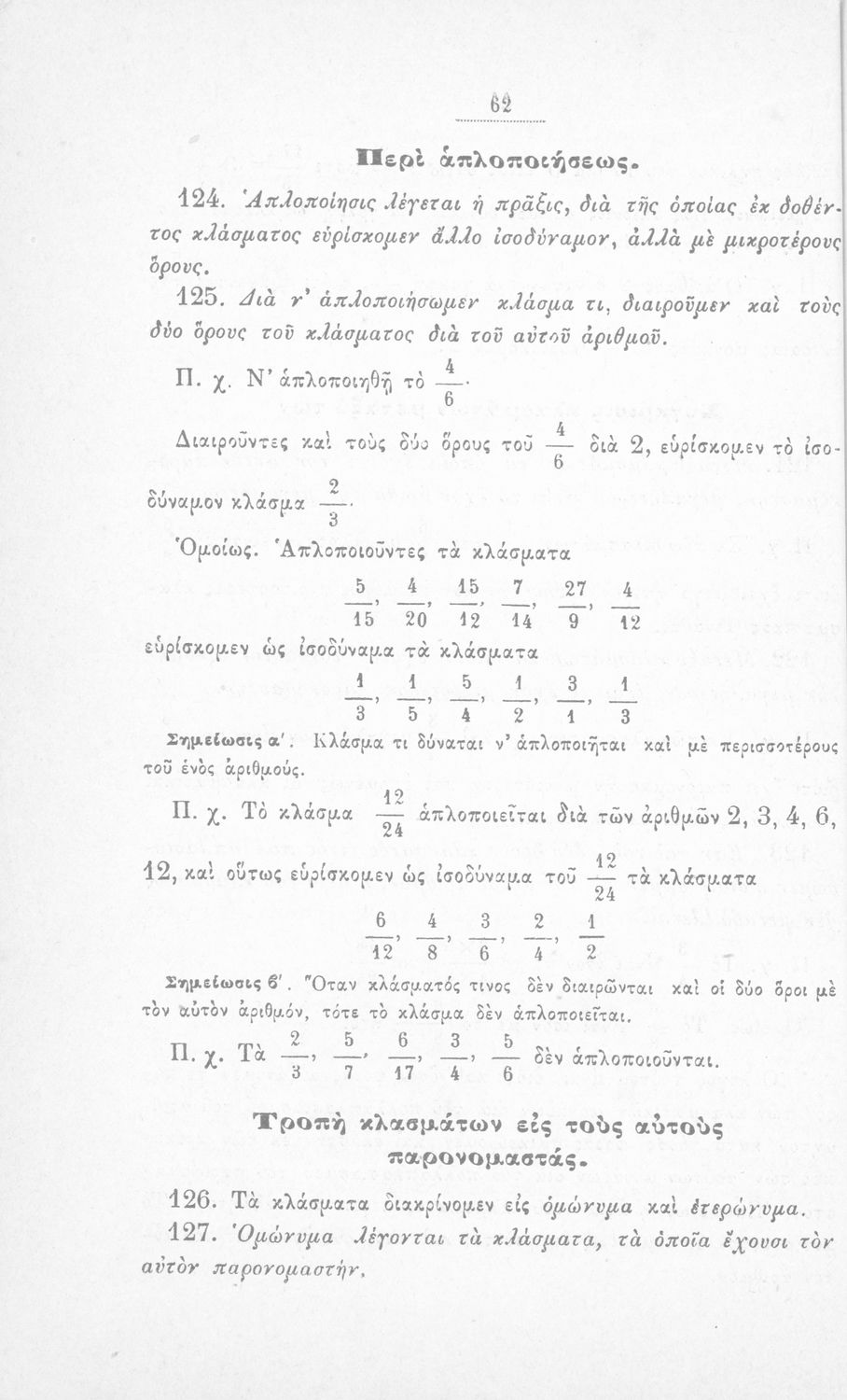Σχολικό εγχειρίδιο Αριθμητικής για τα Ελληνικά και Αστικά Σχολεία και τα Παρθεναγωγεία που εστιάζει στις αριθμητικές πράξεις, τα κλάσματα, τους δεκαδικούς και συμμιγείς αριθμούς, και τις δυνάμεις. Περιέχει και
