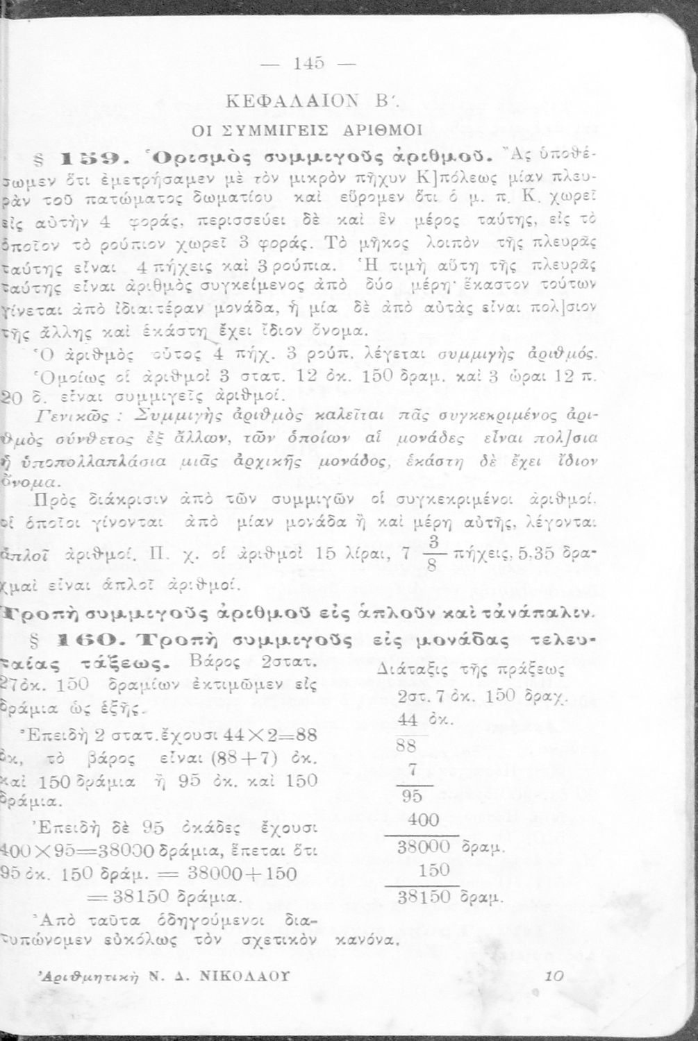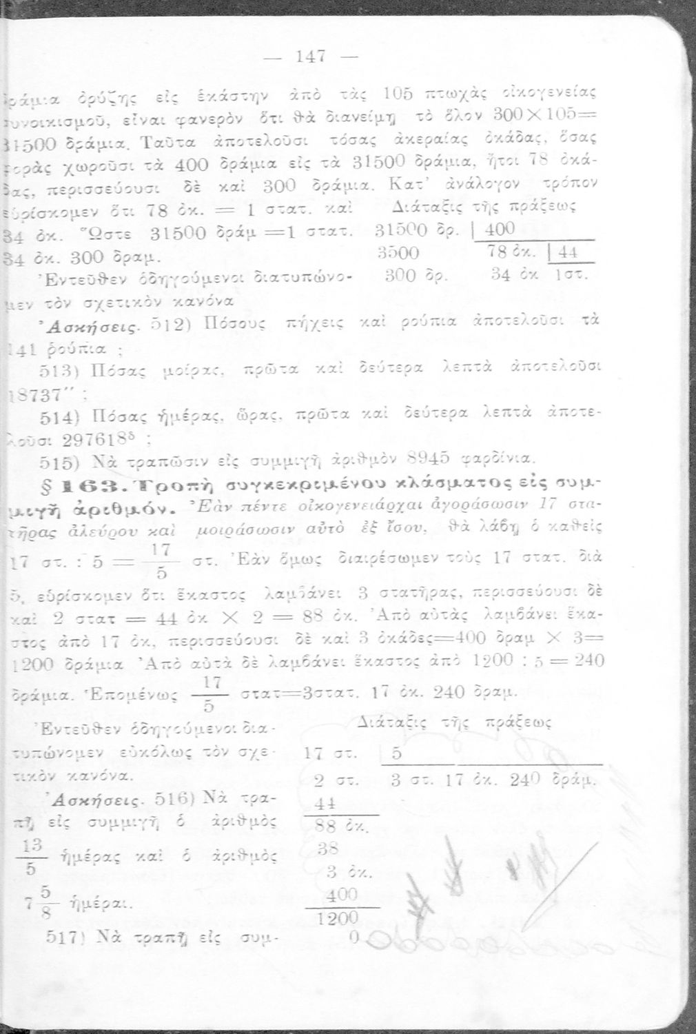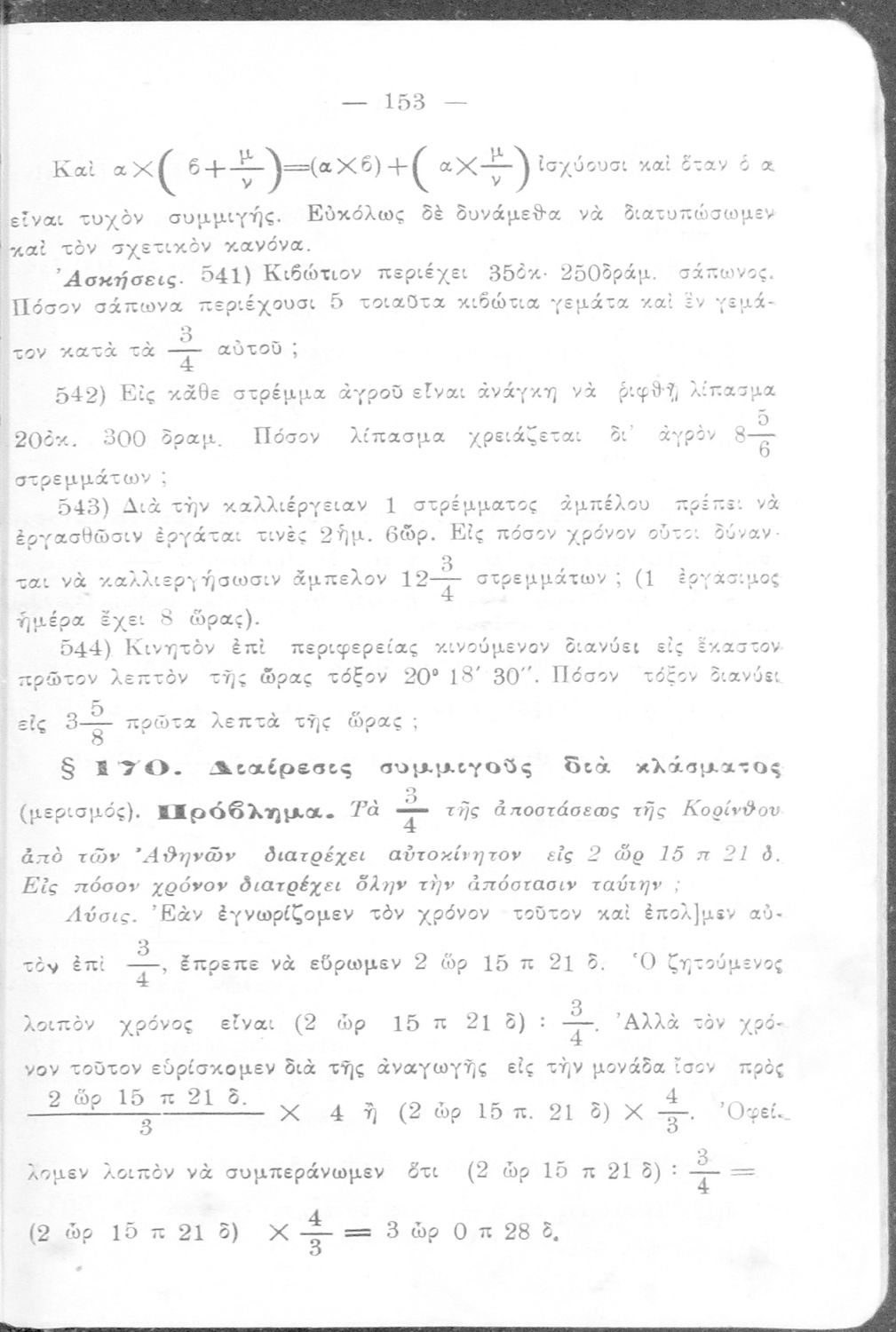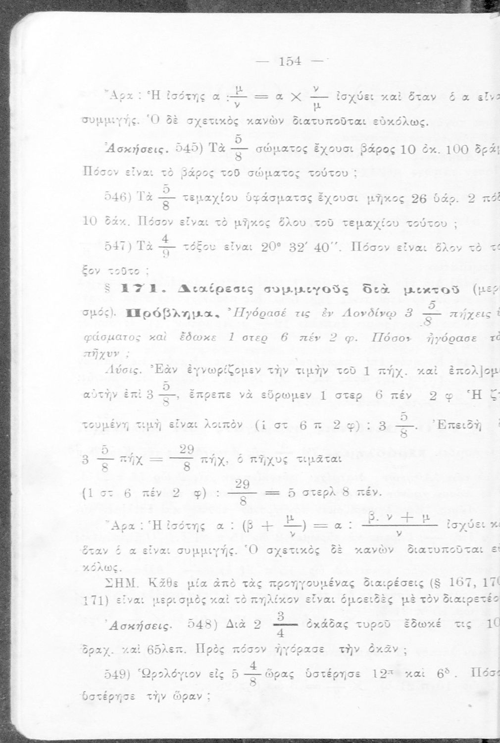 Σχολικό εγχειρίδιο Αριθμητικής για τις Α΄, Β΄, Γ΄ Γυμνασίου και τα Ανώτερα Παρθεναγωγεία που είναι χωρισμένο σε θεωρία και ασκήσεις και εστιάζει στις αριθμητικές πράξεις με κλάσματα και ακέραιους και συμμιγείς
