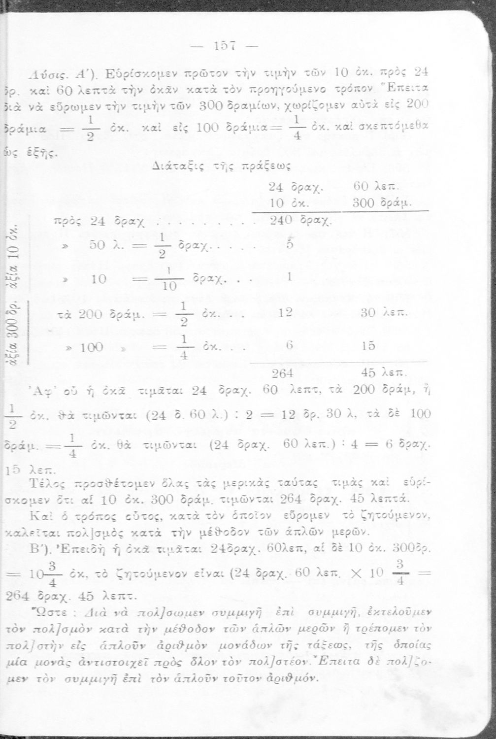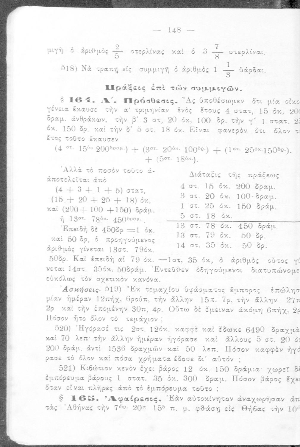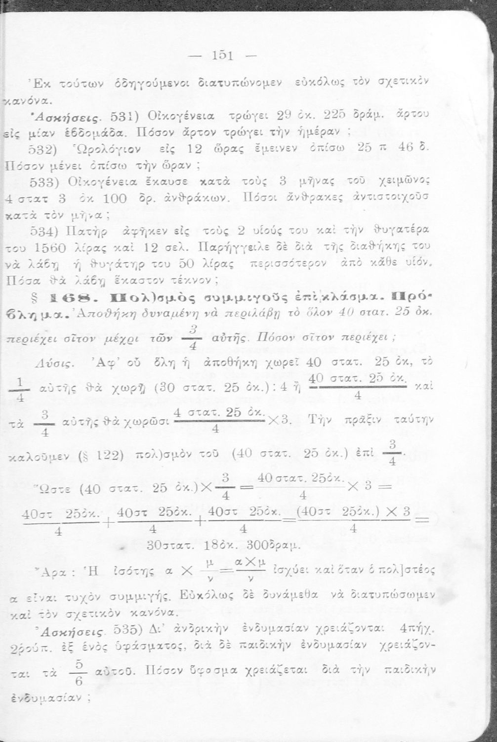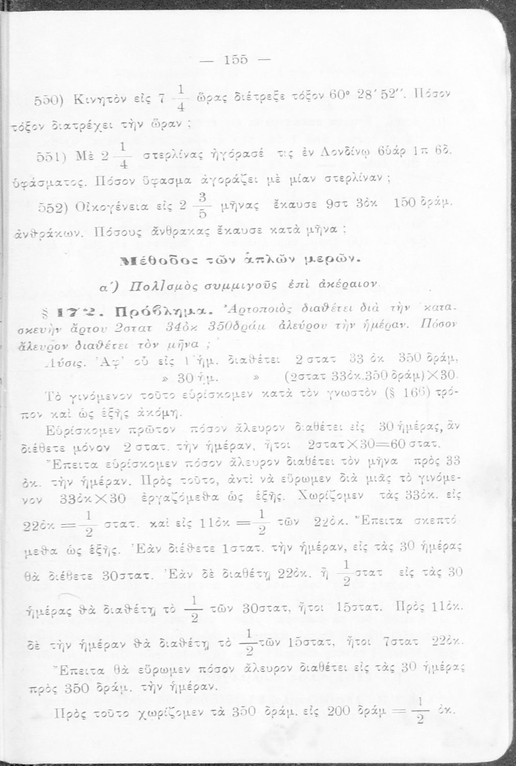 Σχολικό εγχειρίδιο Αριθμητικής για τις Α΄, Β΄, Γ΄ Γυμνασίου και τα Ανώτερα Παρθεναγωγεία που είναι χωρισμένο σε θεωρία και ασκήσεις και εστιάζει στις αριθμητικές πράξεις με κλάσματα και ακέραιους και συμμιγείς