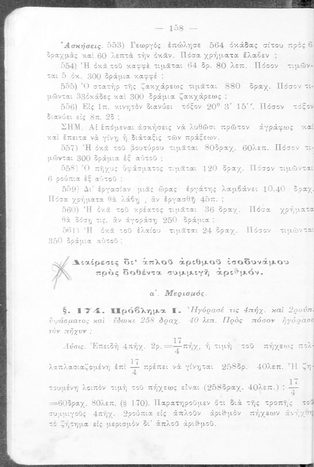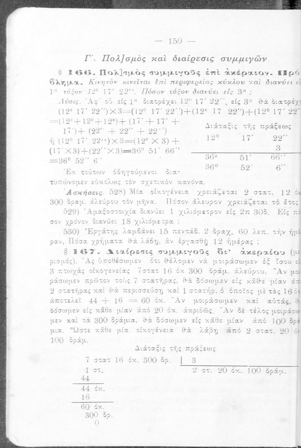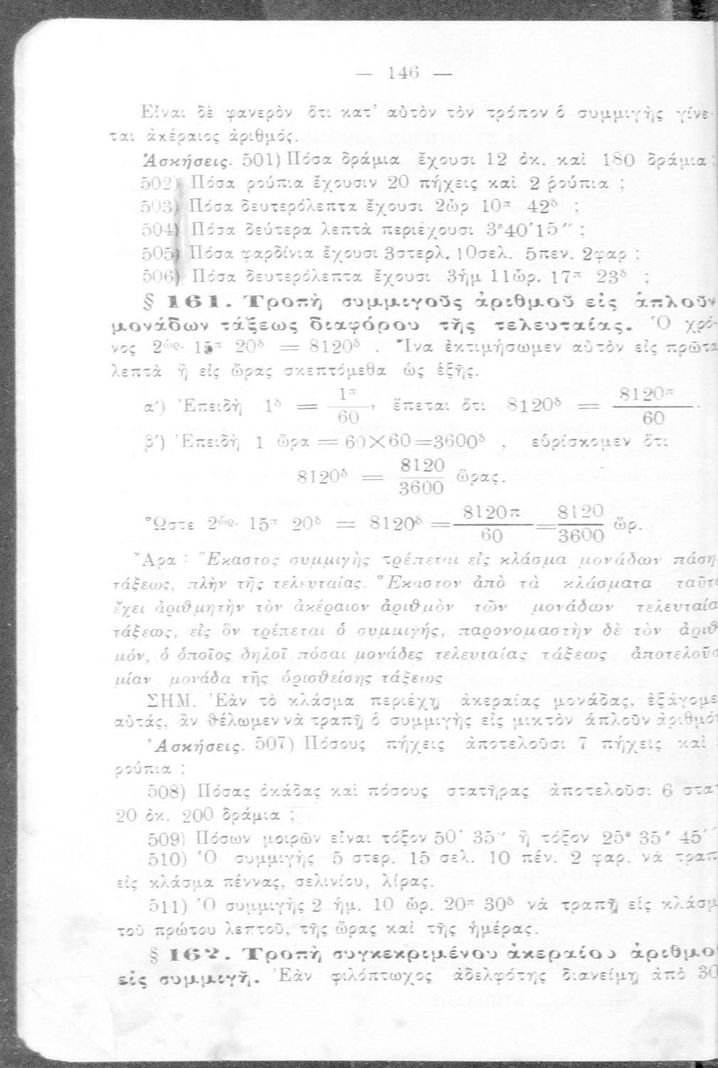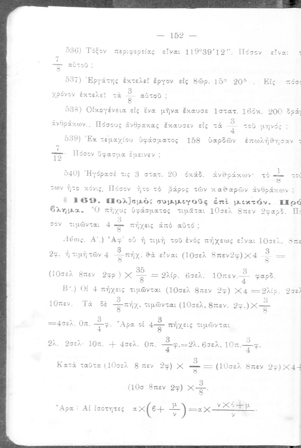 Σχολικό εγχειρίδιο Αριθμητικής για τις Α΄, Β΄, Γ΄ Γυμνασίου και τα Ανώτερα Παρθεναγωγεία που είναι χωρισμένο σε θεωρία και ασκήσεις και εστιάζει στις αριθμητικές πράξεις με κλάσματα και ακέραιους και συμμιγείς