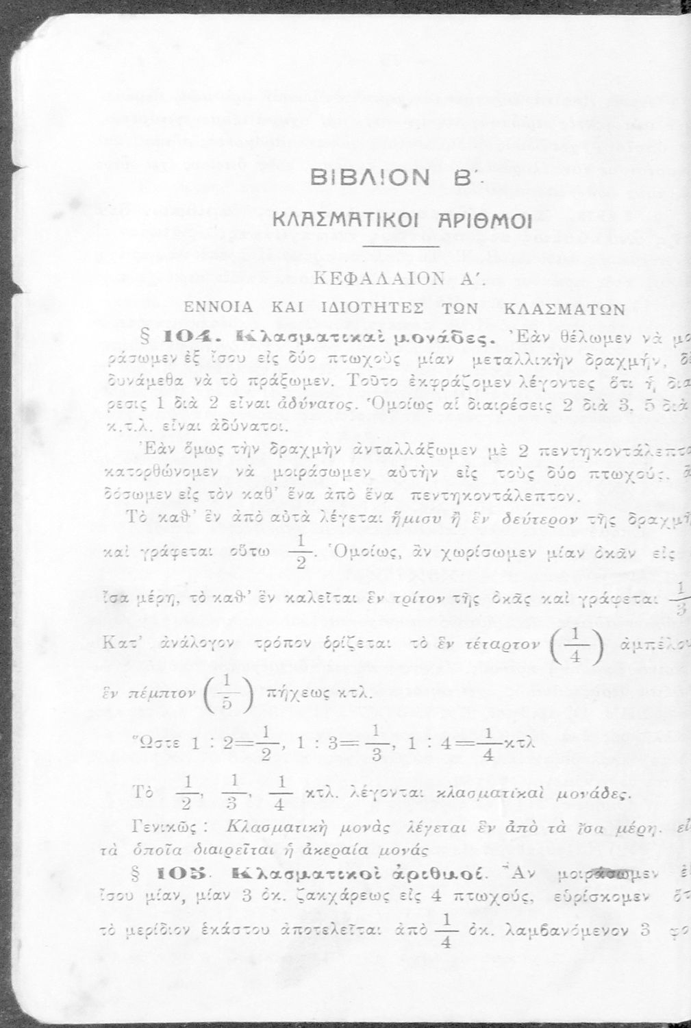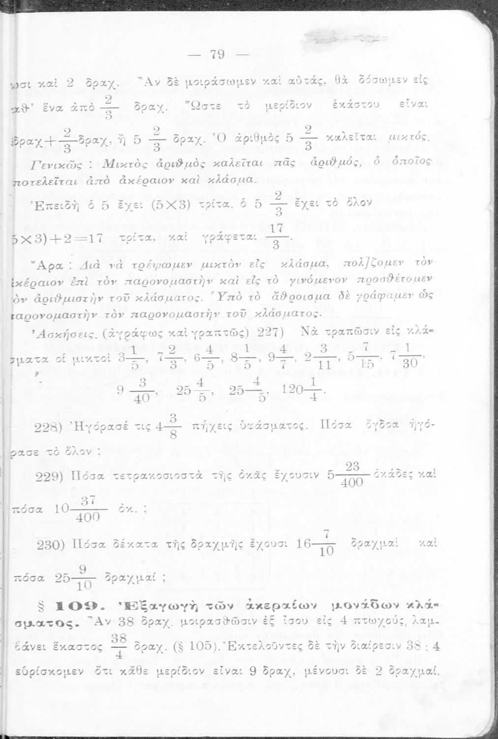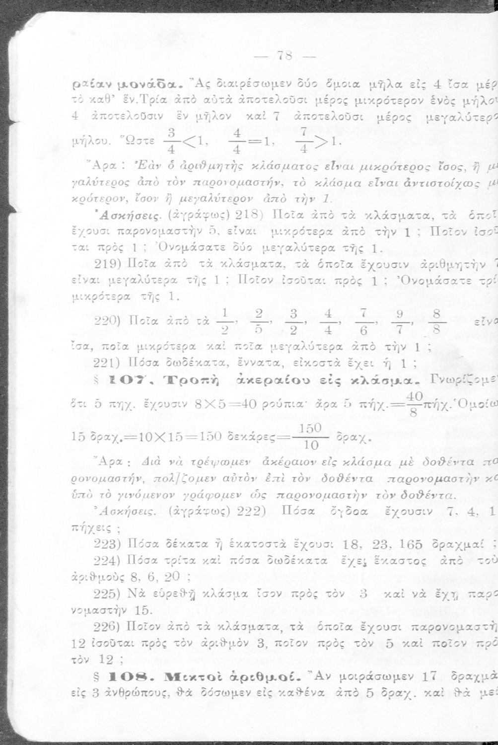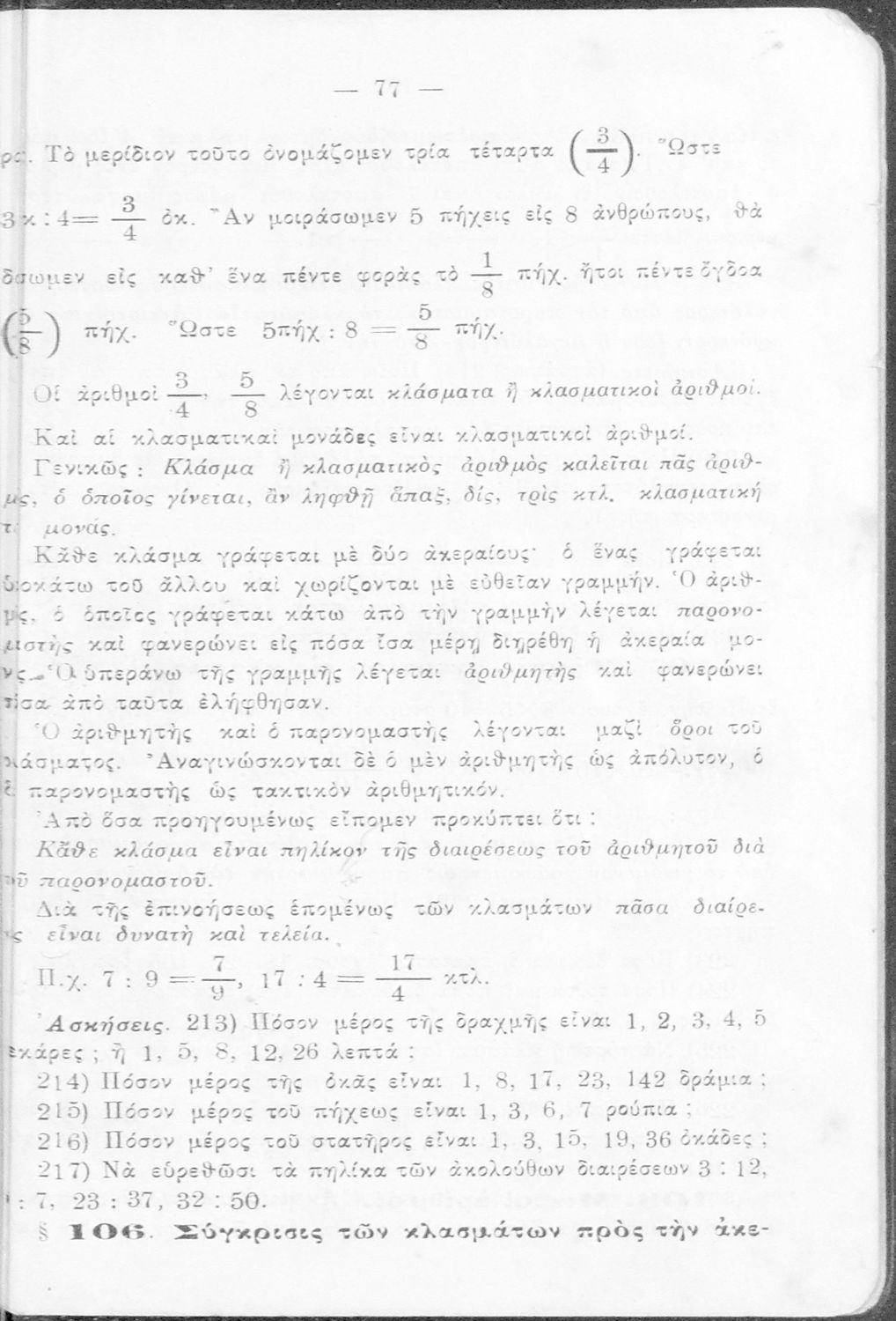 Σχολικό εγχειρίδιο Αριθμητικής για τις Α΄, Β΄, Γ΄ Γυμνασίου και τα Ανώτερα Παρθεναγωγεία που είναι χωρισμένο σε θεωρία και ασκήσεις και εστιάζει στις αριθμητικές πράξεις με κλάσματα και ακέραιους και συμμιγείς