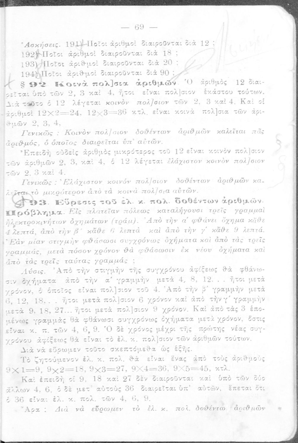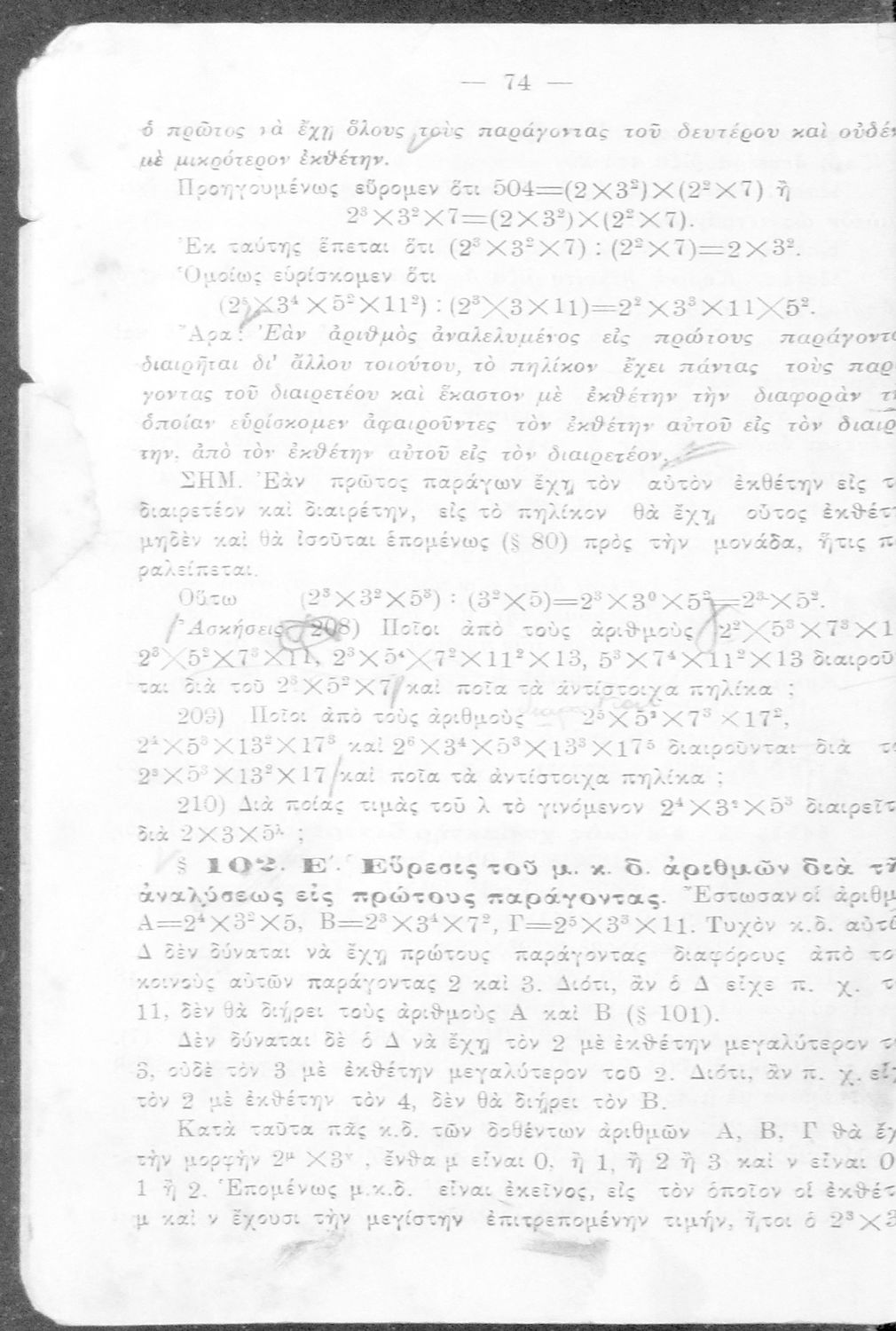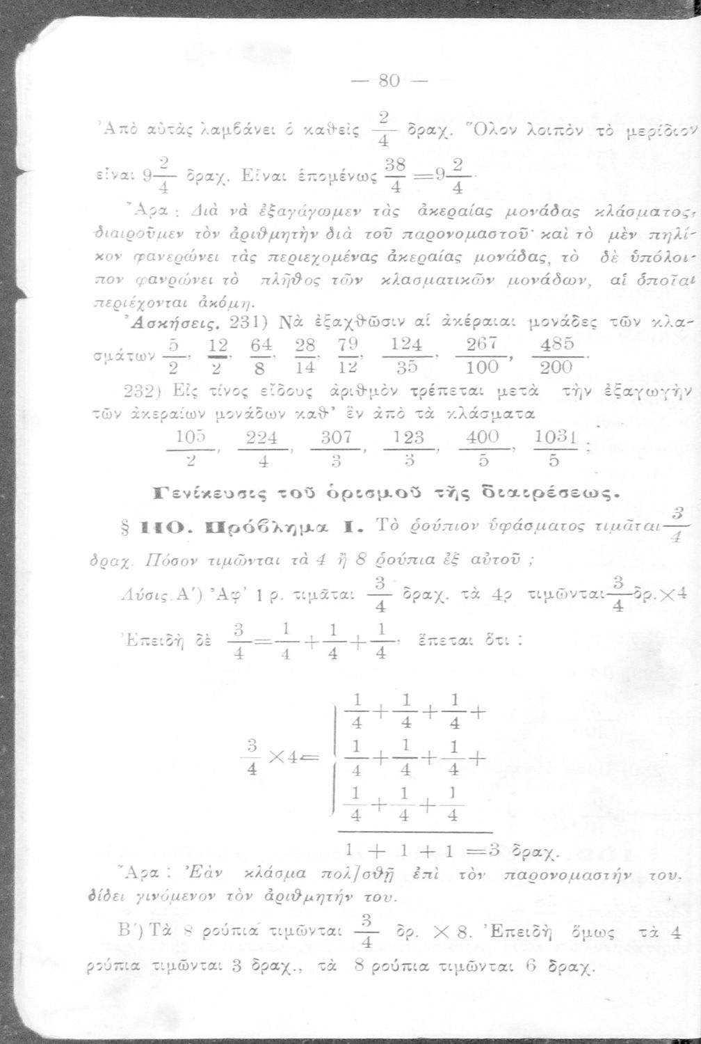 Σχολικό εγχειρίδιο Αριθμητικής για τις Α΄, Β΄, Γ΄ Γυμνασίου και τα Ανώτερα Παρθεναγωγεία που είναι χωρισμένο σε θεωρία και ασκήσεις και εστιάζει στις αριθμητικές πράξεις με κλάσματα και ακέραιους και συμμιγείς