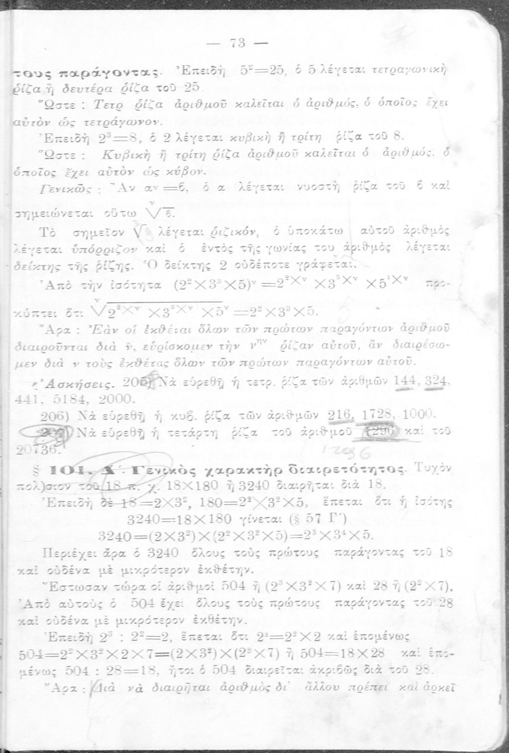 Σχολικό εγχειρίδιο Αριθμητικής για τις Α΄, Β΄, Γ΄ Γυμνασίου που είναι χωρισμένο σε ορισμούς και ασκήσεις και εστιάζει στις ιδιότητες των αριθμητικών πράξεων, τα κλάσματα και την τετραγωνική ρίζα.