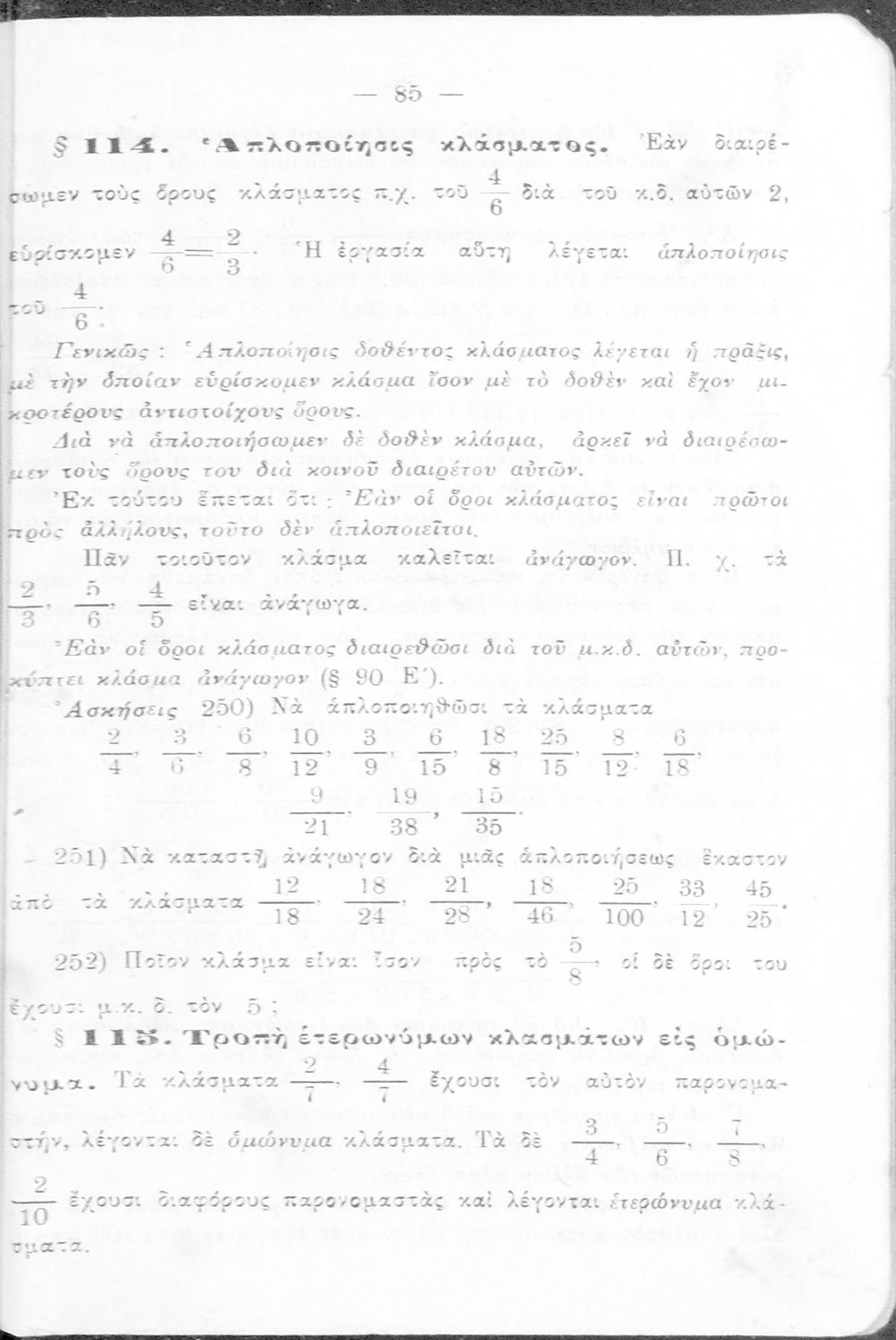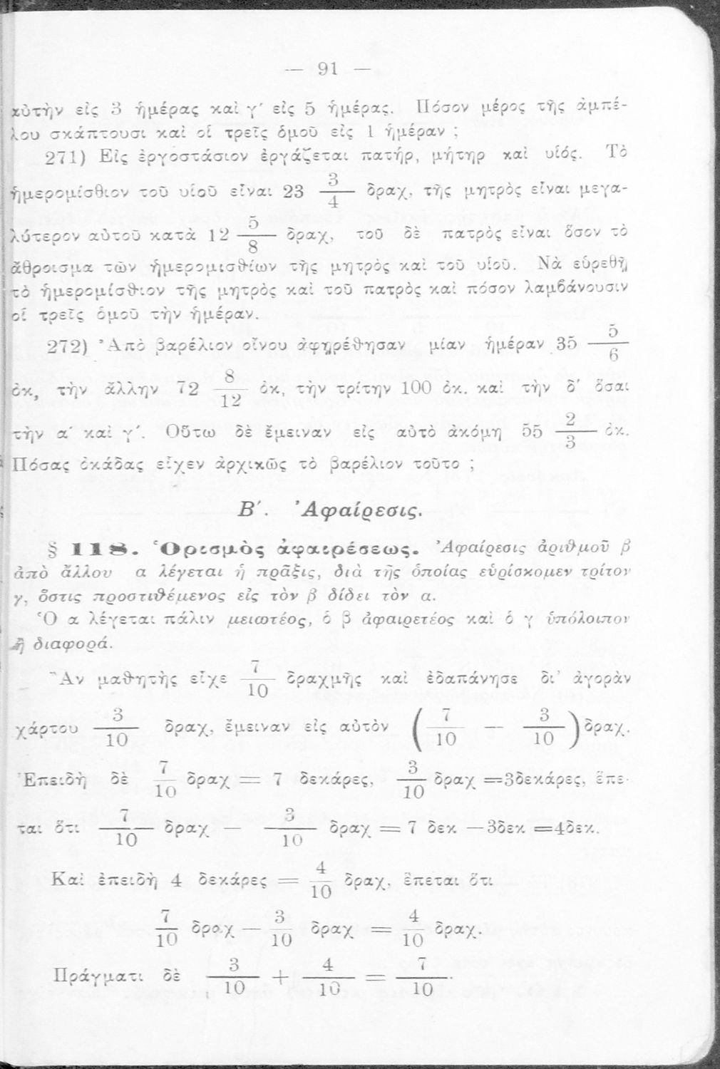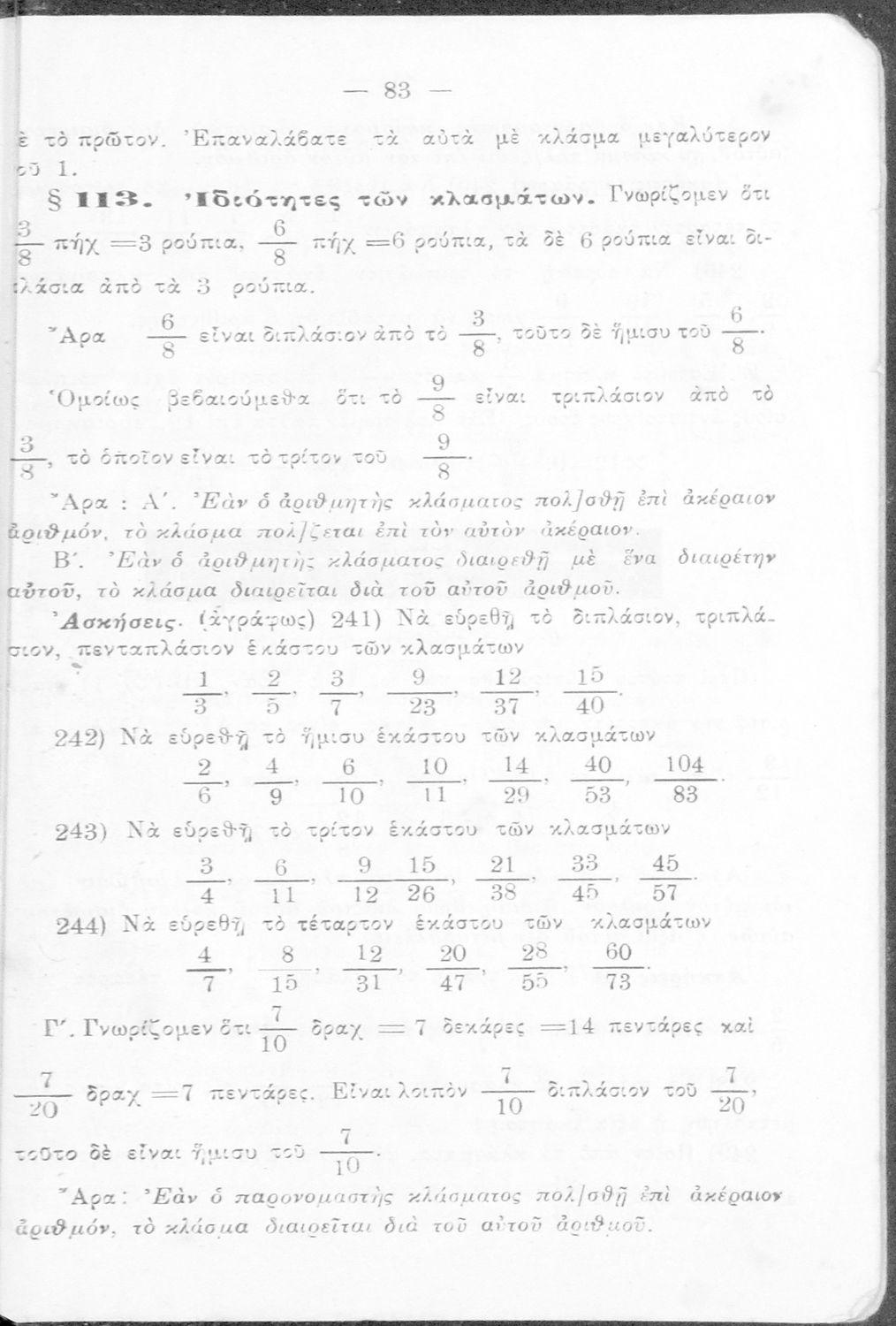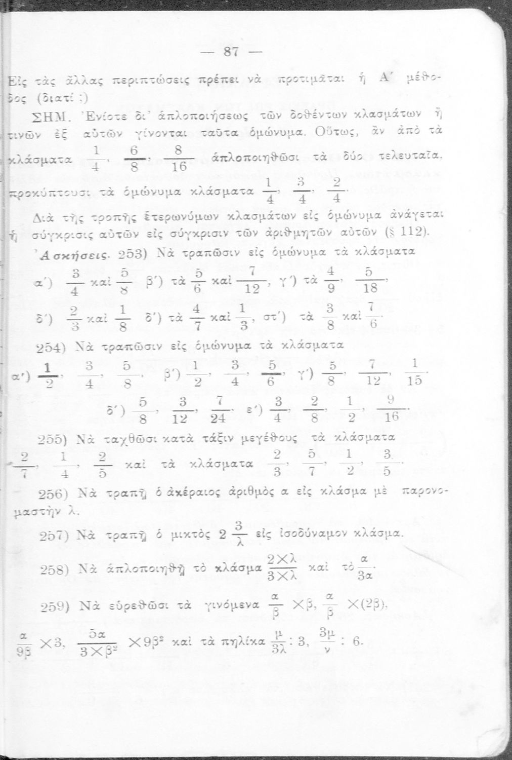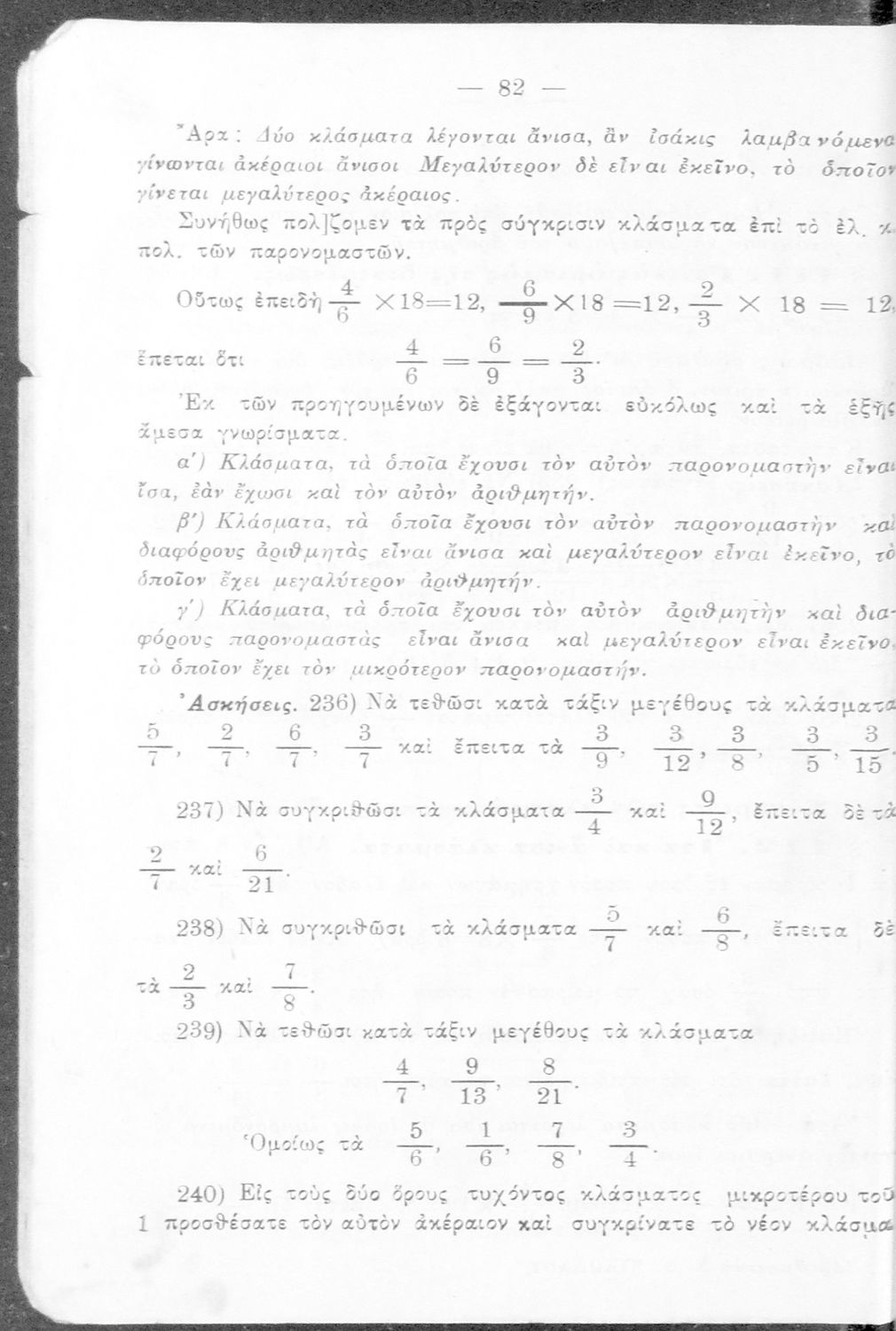 Σχολικό εγχειρίδιο Αριθμητικής για τις Α΄, Β΄, Γ΄ Γυμνασίου και τα Ανώτερα Παρθεναγωγεία που είναι χωρισμένο σε θεωρία και ασκήσεις και εστιάζει στις αριθμητικές πράξεις με κλάσματα και ακέραιους και συμμιγείς